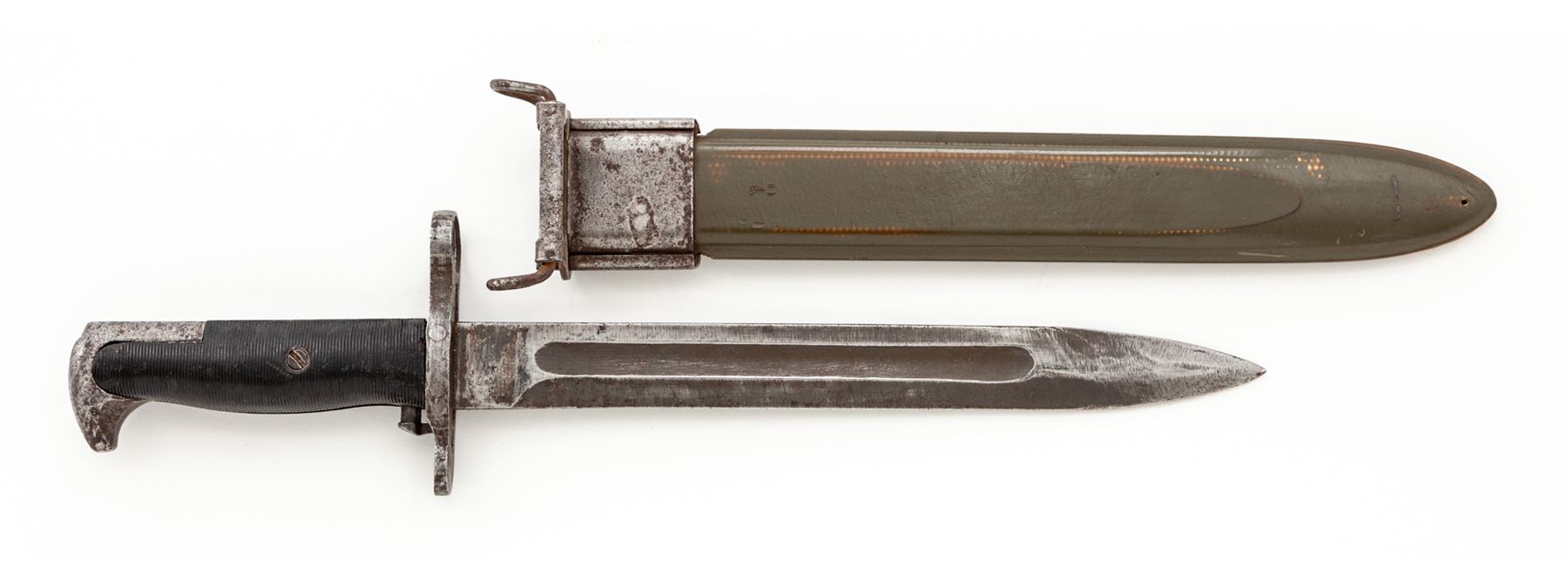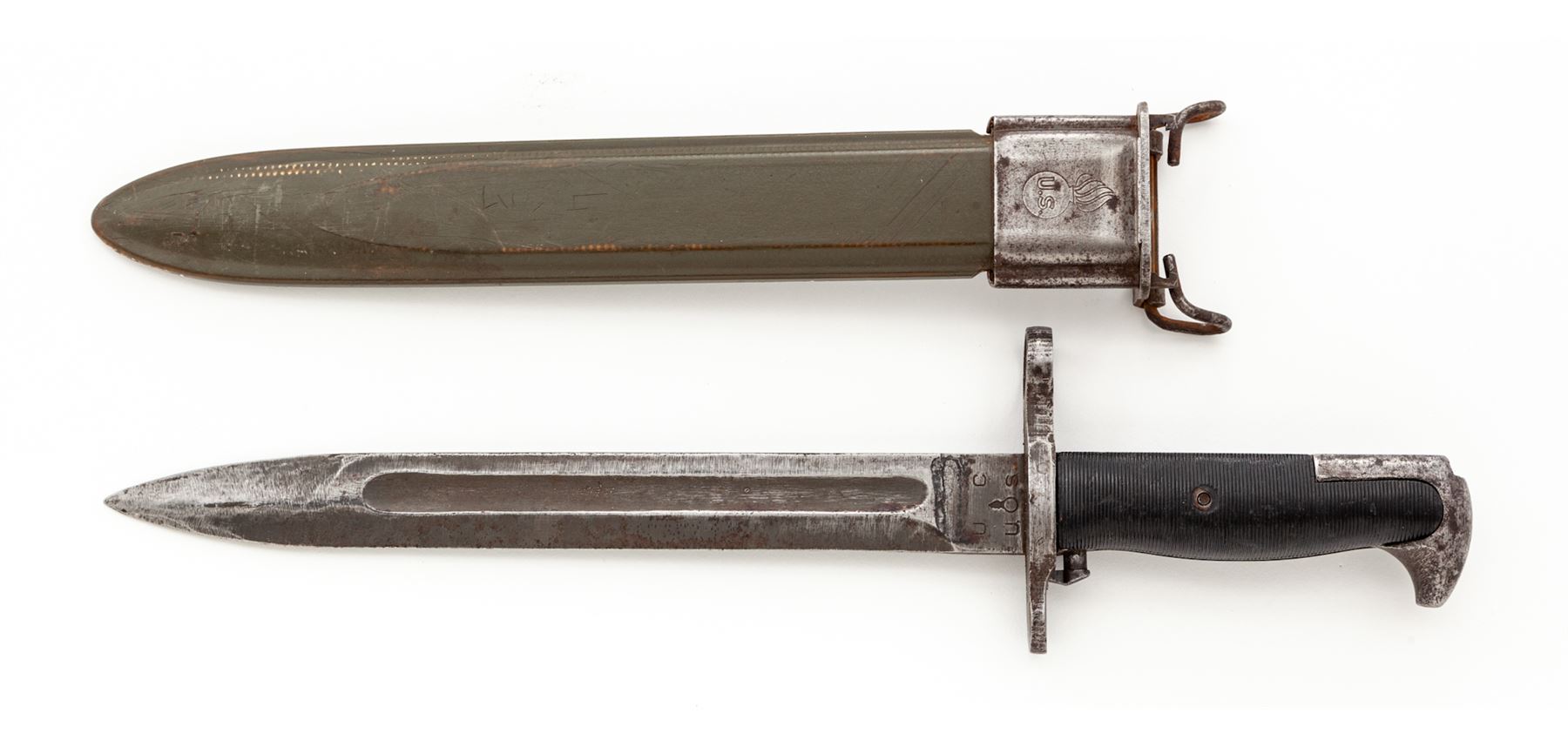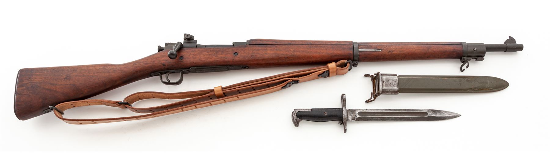 U.S. Model 03-A3 Bolt Action Rifle, by Smith-Corona, with U.S. M1 bayonet and scabbard, #3650981, .30-06 cal., 24'' Smith-Corona barrel marked 3-43, parkerized finish, walnut stock, with modern commercial 1907 sling. Spear-point bayonet by UC, with 9-5/8'' blade. Condition to rifle is near excellent retaining approx. 96% of its original parkerized finish. Dried cosmoline in magazine well. Faint cartouches to walnut stock, with approx. 2'' chip to left side of upper handguard. Bayonet with little original finish. Good action, fine bore. Est.: $500-$750. (C&R)