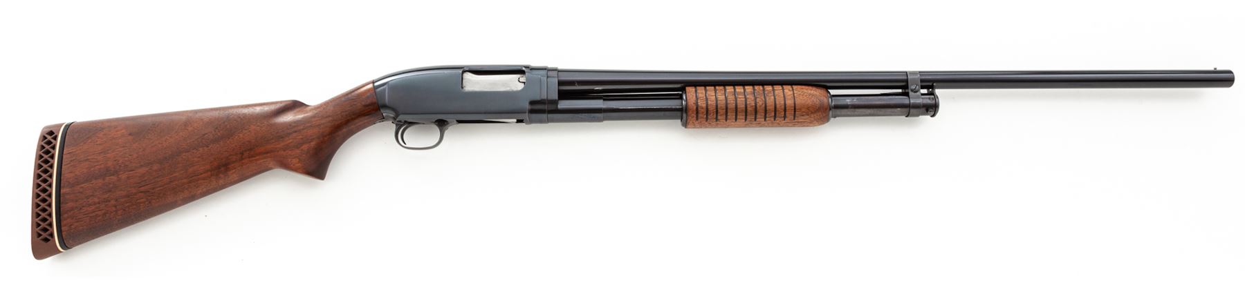Winchester Model 12 Pump Action Shotgun, #1098359, 16 ga., 28'' barrel choked Full, blue finish, walnut stock, with 11-groove forend. Condition is excellent as professionally refinished, retaining approx. 98% blue. Stock with light sanding and added rubber pad. Action is crisp, bore is bright. Length of pull: 14''. Est.: $500-$700. (C&R)