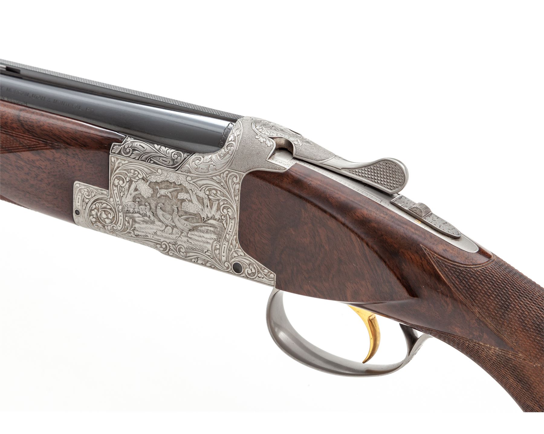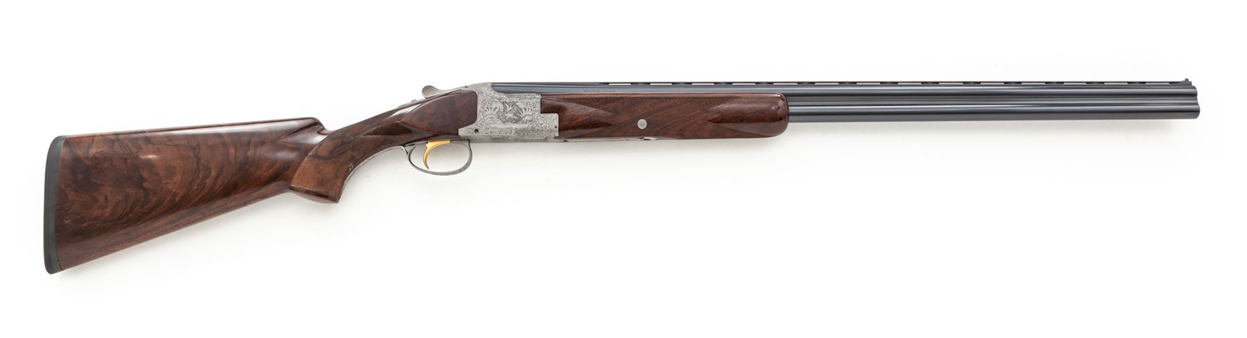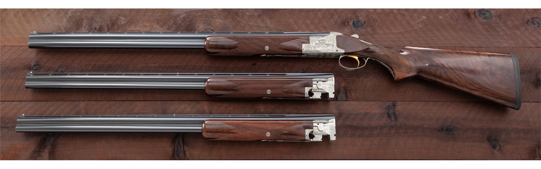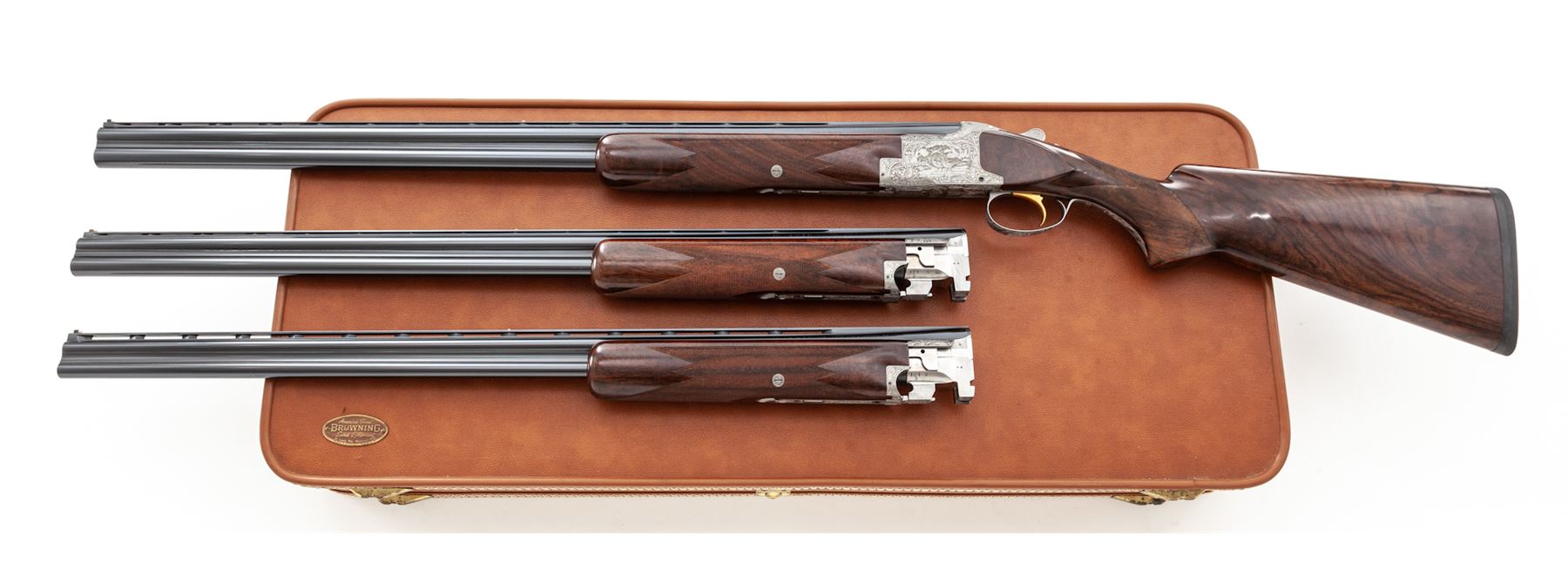 Beautifully Engraved Browning Superposed Diana Grade 3-Barrel Small Bore Shotgun Set, #121V71, 20 ga. Frame is fitted with three pairs of vent rib barrels: A 28'' 20 ga. pair with 3'' chambers choked IC/Mod.; a 28'' 28 ga. pair with 2-3/4'' chambers choked Mod./Full; and a 28'' .410 bore pair with 3'' chambers also choked Mod./Full. All barrels have low vent ribs and target beads, and are serial numbered ''1'', ''2'', and ''3''. Receiver is left in the white and elaborately engraved in the Diana style with ducks rising on the right-hand side, pheasant on the left-hand side, quail flushing on the bottom, and rabbit on the triggerguard, all surrounded by floral motifs. This engraving appears to be a collaboration of two FN engravers: L. Ernst for the game scenes and J. Vanaubel for the borders. The long tang, flat knob buttstock and the three slender forends are all nicely figured dark European walnut; all have full coverage checkering at 24 LPI; the 14.5'' length of pull ends at a Pachmayr black ''Old English'' butt pad. Action features a single gold selective trigger, auto ejectors, and non-auto safety. Contained in period-correct Browning hard case. Mfg'd 1971. Condition is really excellent, with a couple small dings to the buttstock, light wear to the checkering, but almost no wear to the action, which is still quite tight and functions correctly. All bores are bright. Est.: $10,000-$15,000. (Modern)