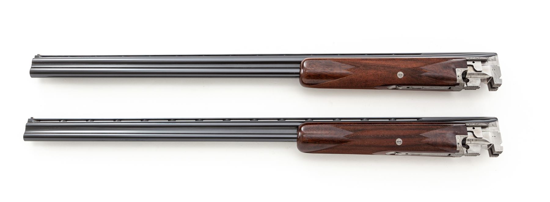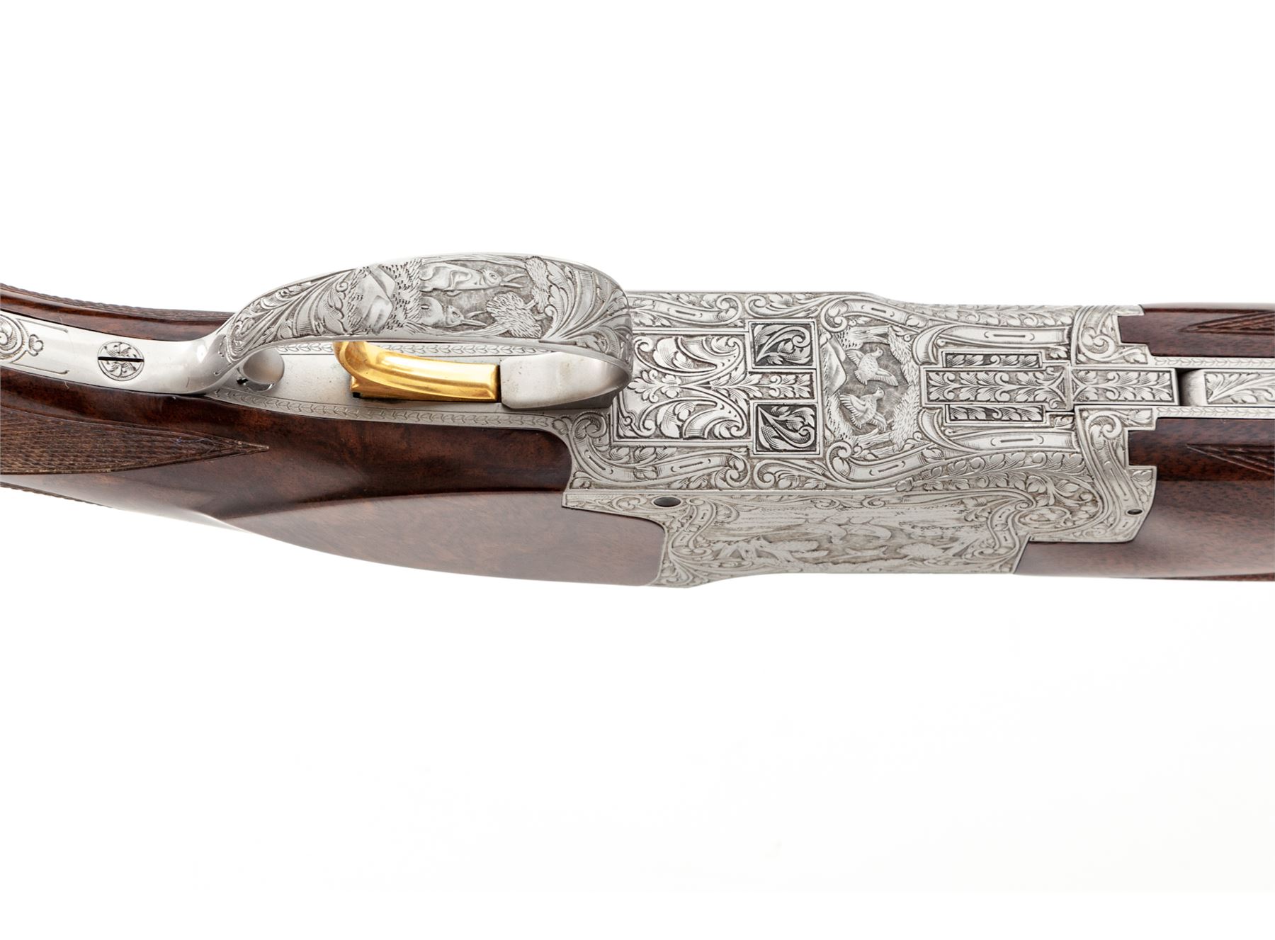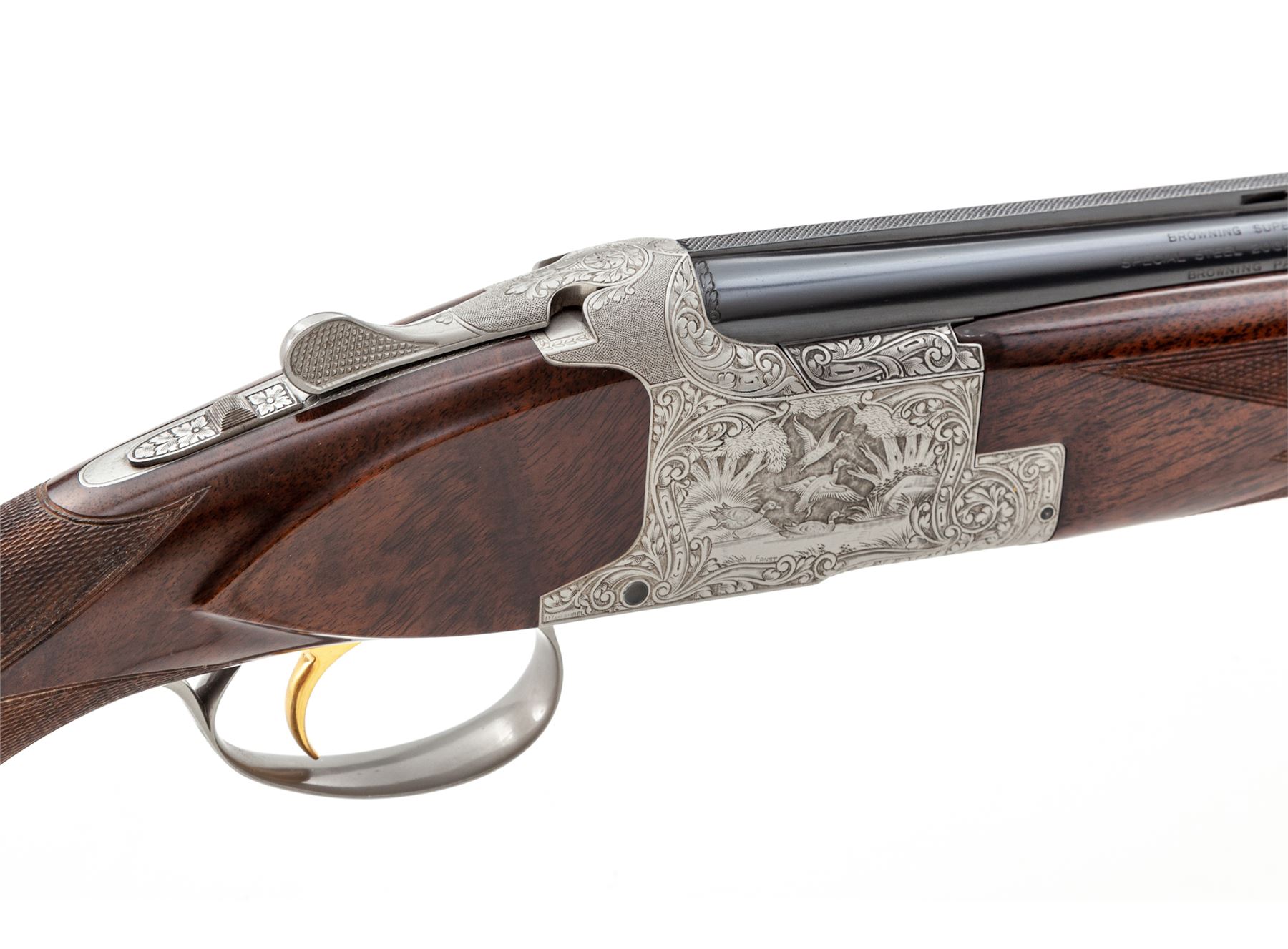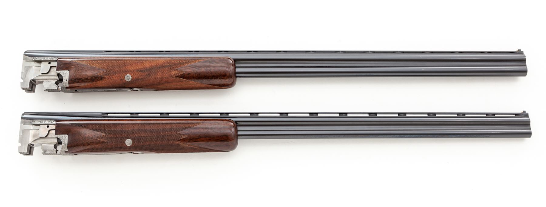 Beautifully Engraved Browning Superposed Diana Grade 3-Barrel Small Bore Shotgun Set, #121V71, 20 ga. Frame is fitted with three pairs of vent rib barrels: A 28'' 20 ga. pair with 3'' chambers choked IC/Mod.; a 28'' 28 ga. pair with 2-3/4'' chambers choked Mod./Full; and a 28'' .410 bore pair with 3'' chambers also choked Mod./Full. All barrels have low vent ribs and target beads, and are serial numbered ''1'', ''2'', and ''3''. Receiver is left in the white and elaborately engraved in the Diana style with ducks rising on the right-hand side, pheasant on the left-hand side, quail flushing on the bottom, and rabbit on the triggerguard, all surrounded by floral motifs. This engraving appears to be a collaboration of two FN engravers: L. Ernst for the game scenes and J. Vanaubel for the borders. The long tang, flat knob buttstock and the three slender forends are all nicely figured dark European walnut; all have full coverage checkering at 24 LPI; the 14.5'' length of pull ends at a Pachmayr black ''Old English'' butt pad. Action features a single gold selective trigger, auto ejectors, and non-auto safety. Contained in period-correct Browning hard case. Mfg'd 1971. Condition is really excellent, with a couple small dings to the buttstock, light wear to the checkering, but almost no wear to the action, which is still quite tight and functions correctly. All bores are bright. Est.: $10,000-$15,000. (Modern)