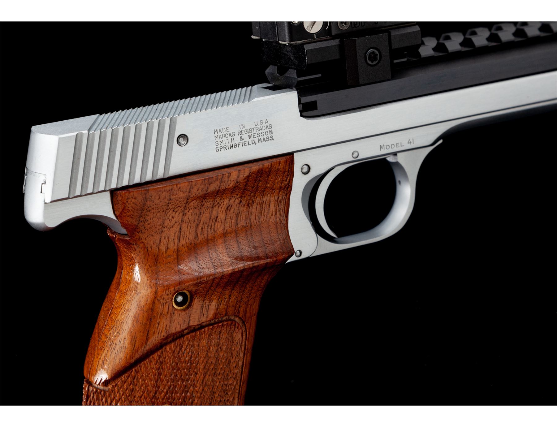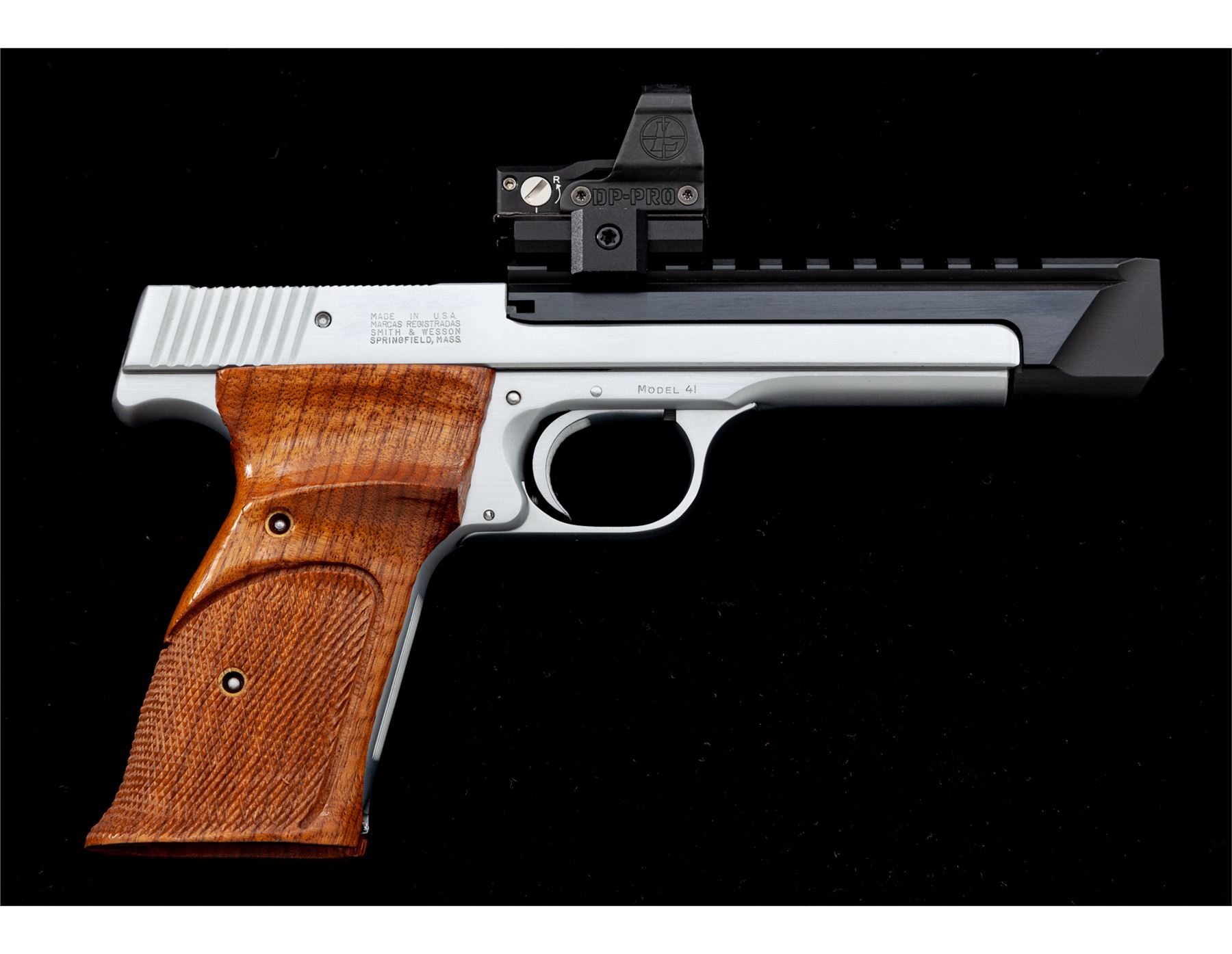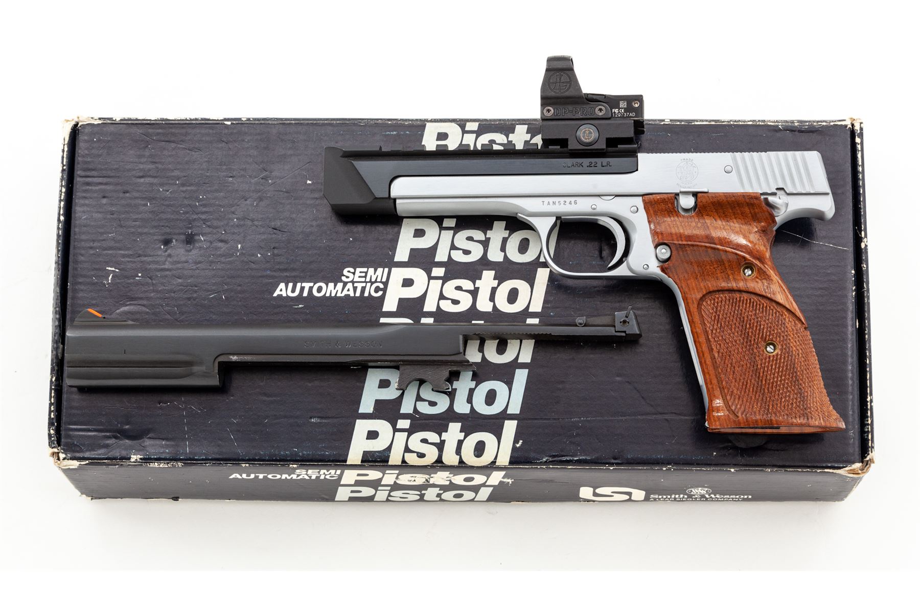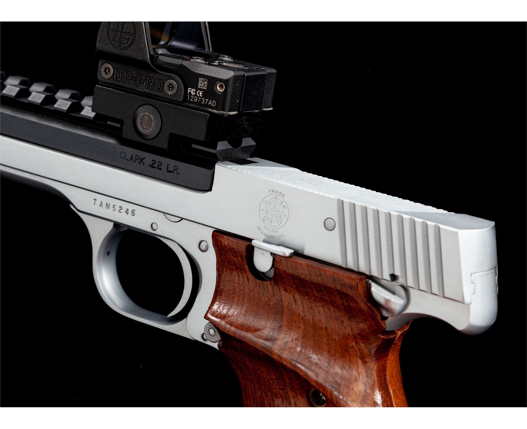 Clark Custom Smith & Wesson Model 41 Semi-Automatic Pistol, #TAN5246, .22 LR cal., with a 5.5'' blued steel Clark STC model Match bull barrel with integral scope base. Frame and slide have been hard chromed which Clark offers as an additional feature to their standard Model 41 upgrade. The other standard features that have been completed and that are noted in the accompanying Clark paperwork are a trigger job, throat and barrel feed ramp polish, and extractor tuning. Grips are checkered walnut with thumbrests. Pistol includes two (2) blued steel S&W magazines and one newer S&W magazine. Pistol is also fitted with a Leupold DP-Pro red-dot sight. Included is the original one-piece S&W box with matching end label, owner's manual, and 7'' barrel with original sights. Also included is the original instruction sheet from Clark and Clark test target that is numbered to the gun. Overall condition is excellent with the new barrel and hard chrome finish appearing as new. Grips are also excellent with only a few minor marks from handling. Action is really smooth; bore is mirror bright. Leupold sight functions properly. Original magazine bodies show moderate wear. Original slide retains approx. 98% original finish; bore is excellent. Est.: $1,500-$2,200. (Modern/PPT)