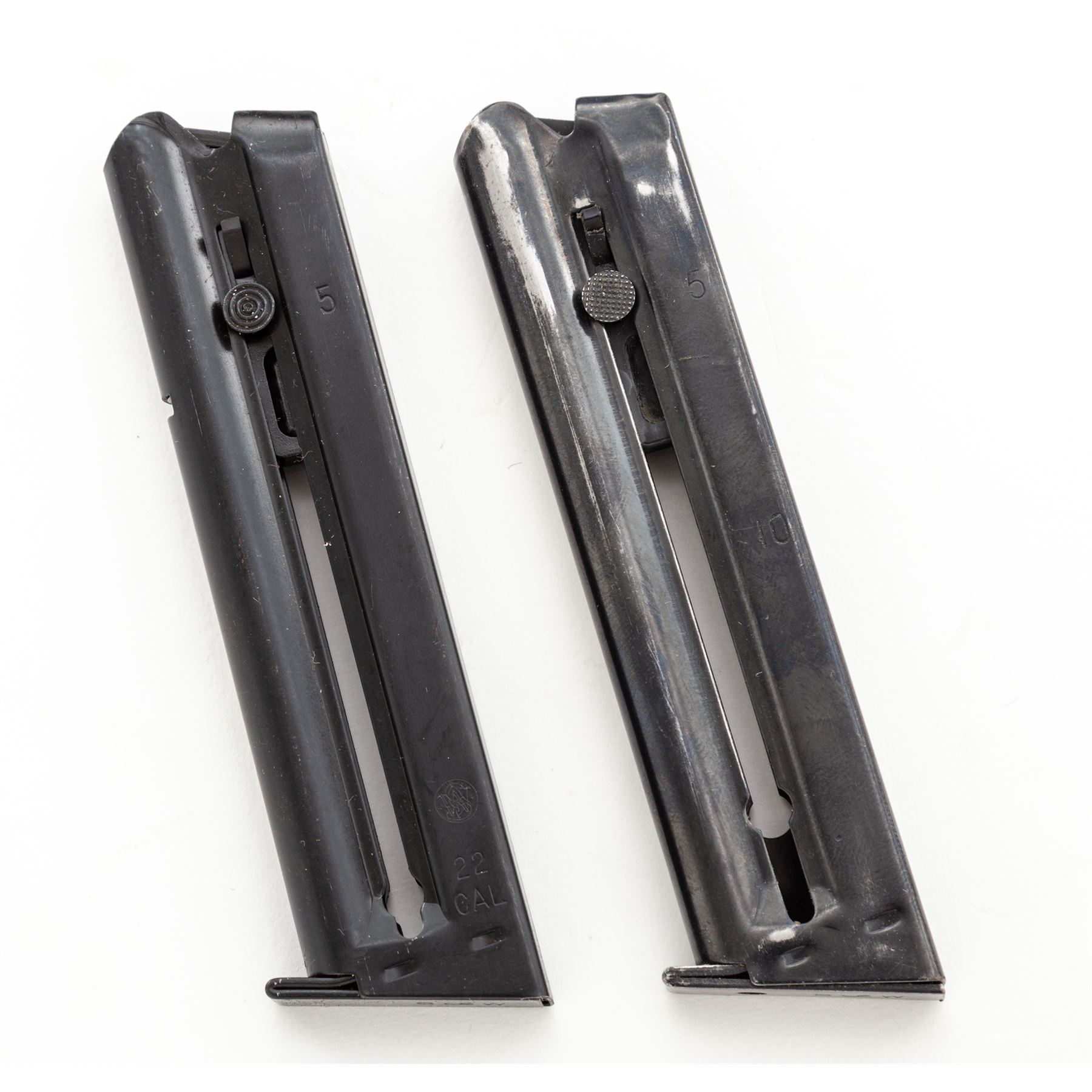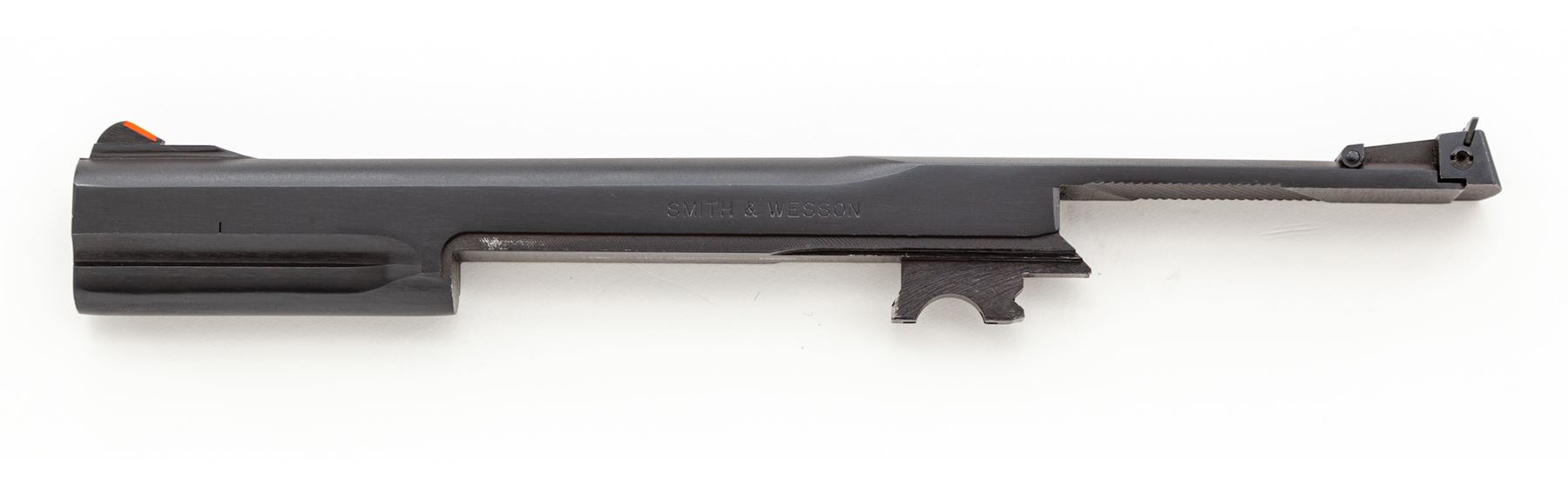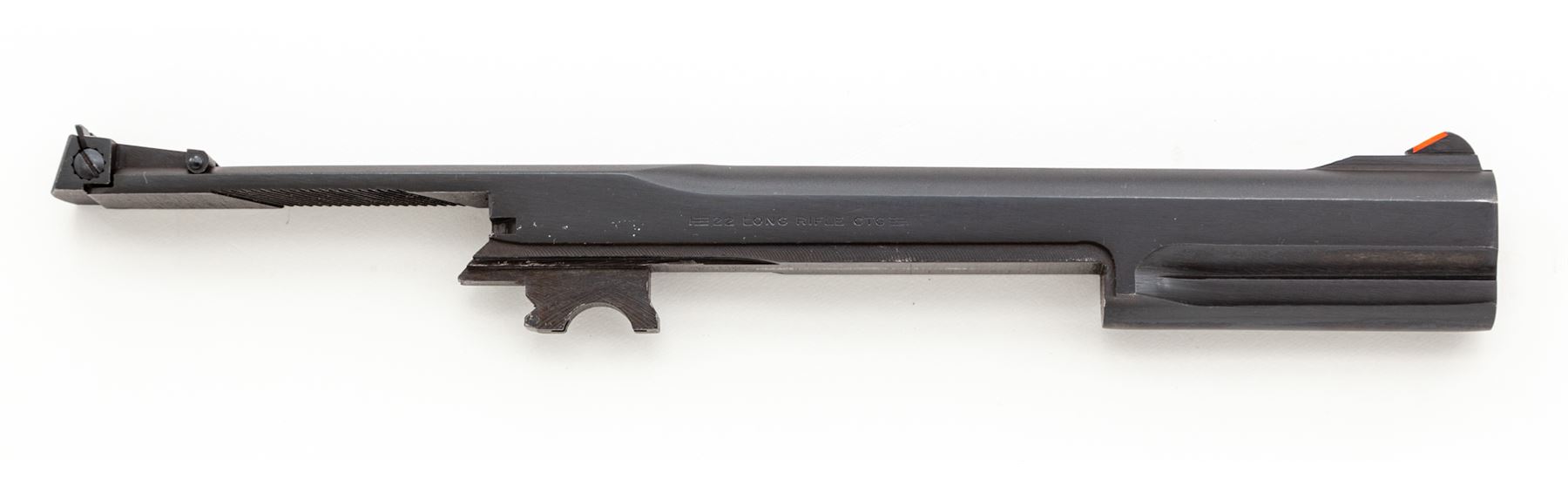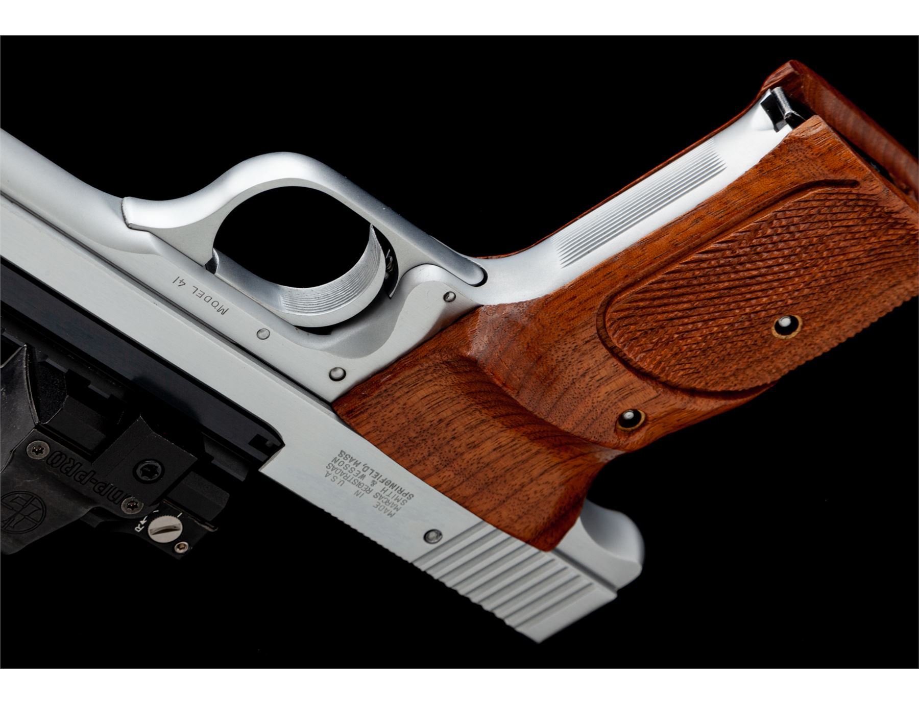 Clark Custom Smith & Wesson Model 41 Semi-Automatic Pistol, #TAN5246, .22 LR cal., with a 5.5'' blued steel Clark STC model Match bull barrel with integral scope base. Frame and slide have been hard chromed which Clark offers as an additional feature to their standard Model 41 upgrade. The other standard features that have been completed and that are noted in the accompanying Clark paperwork are a trigger job, throat and barrel feed ramp polish, and extractor tuning. Grips are checkered walnut with thumbrests. Pistol includes two (2) blued steel S&W magazines and one newer S&W magazine. Pistol is also fitted with a Leupold DP-Pro red-dot sight. Included is the original one-piece S&W box with matching end label, owner's manual, and 7'' barrel with original sights. Also included is the original instruction sheet from Clark and Clark test target that is numbered to the gun. Overall condition is excellent with the new barrel and hard chrome finish appearing as new. Grips are also excellent with only a few minor marks from handling. Action is really smooth; bore is mirror bright. Leupold sight functions properly. Original magazine bodies show moderate wear. Original slide retains approx. 98% original finish; bore is excellent. Est.: $1,500-$2,200. (Modern/PPT)