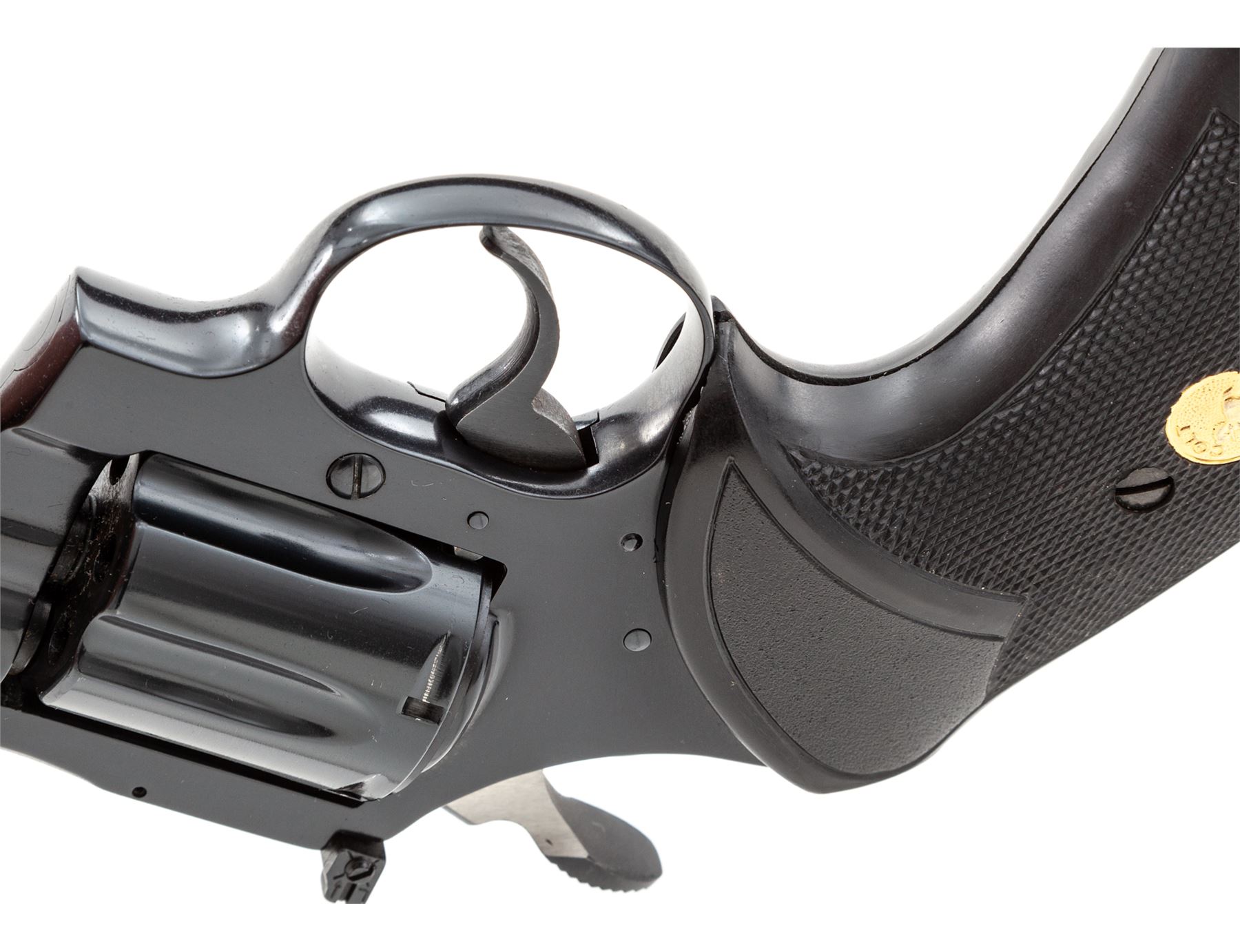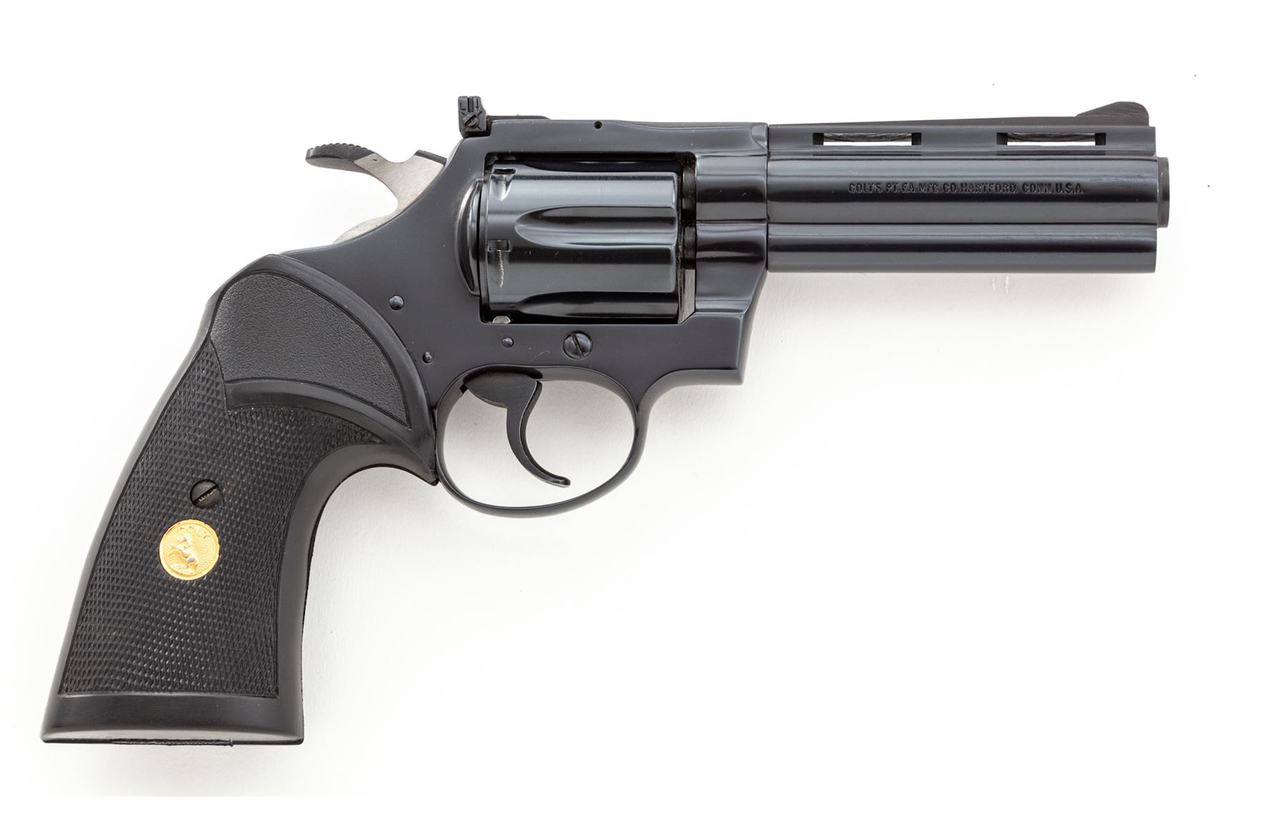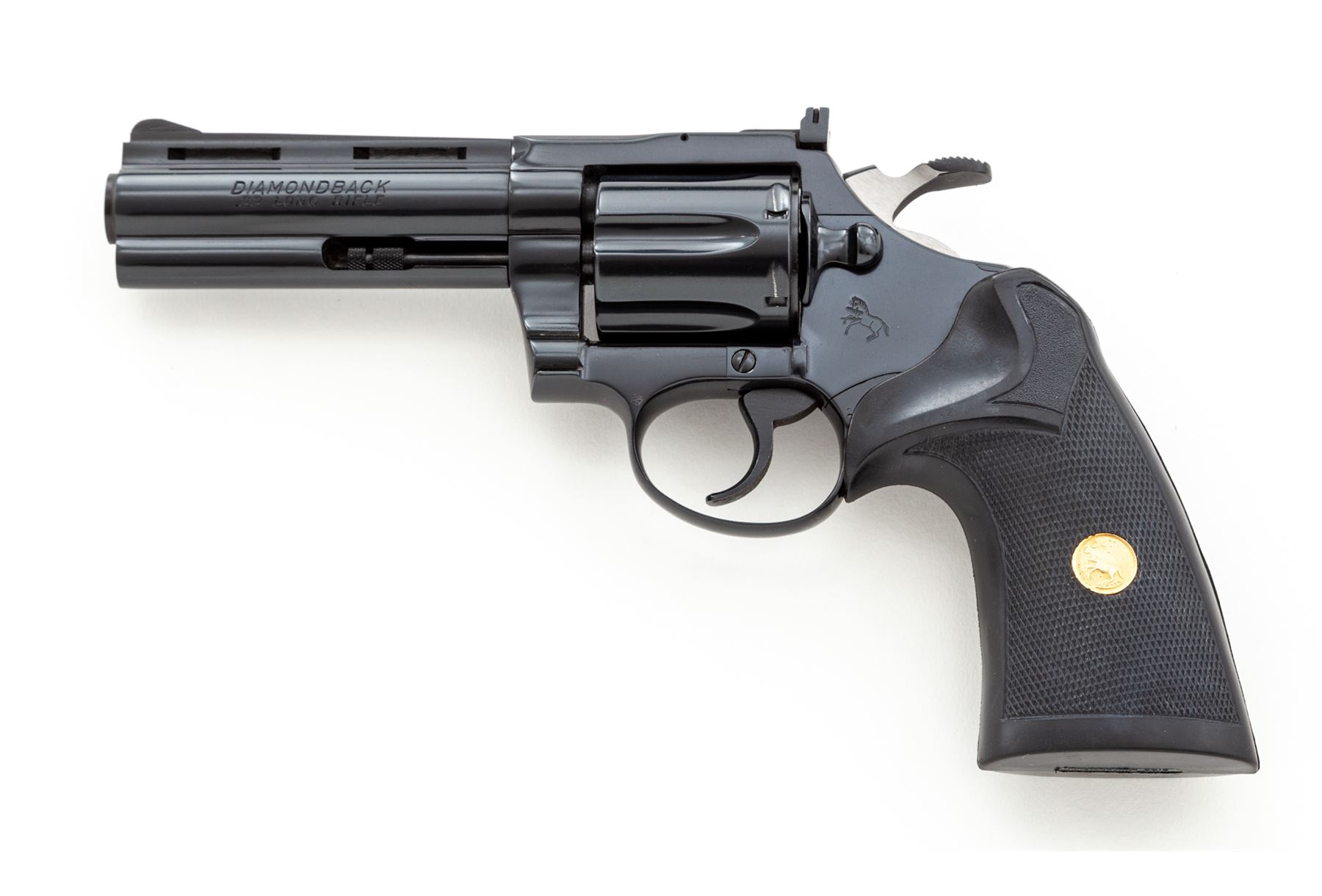 Colt Diamondback Double Action Revolver, #P02145, .22 LR cal., 4'' vent rib barrel, blue finish, checkered black rubber Pachmayr ''Presentation'' grips with gold Colt medallions, and also includes a pair of checkered wood grips with gold Colt medallions. Sights include a ramped blade front and fully adjustable rear. Mfg'd 1981. Approx. 98%+ original blue finish remains and revolver rates as in excellent overall condition. Cylinder with a faint index line, backstrap with a small spot of finish wear. Factory lettering is crisp. Both sets of grips are also excellent and appear near new, gold medallions are clean and shiny. Wood grips are missing the original grip screw. Mirror bright bore. Overall a clean and well taken care of Diamondback that appears to have been fired very little. Est.: $1,400-$1,800. (Modern/PPT)