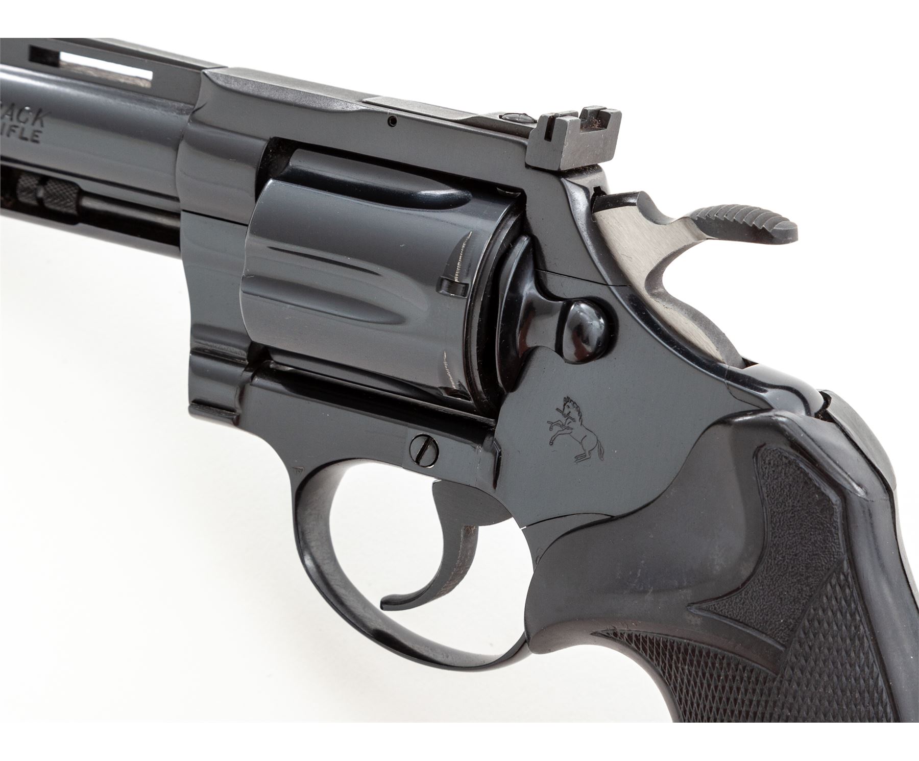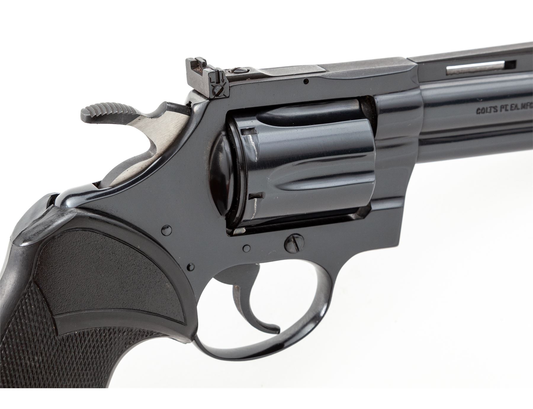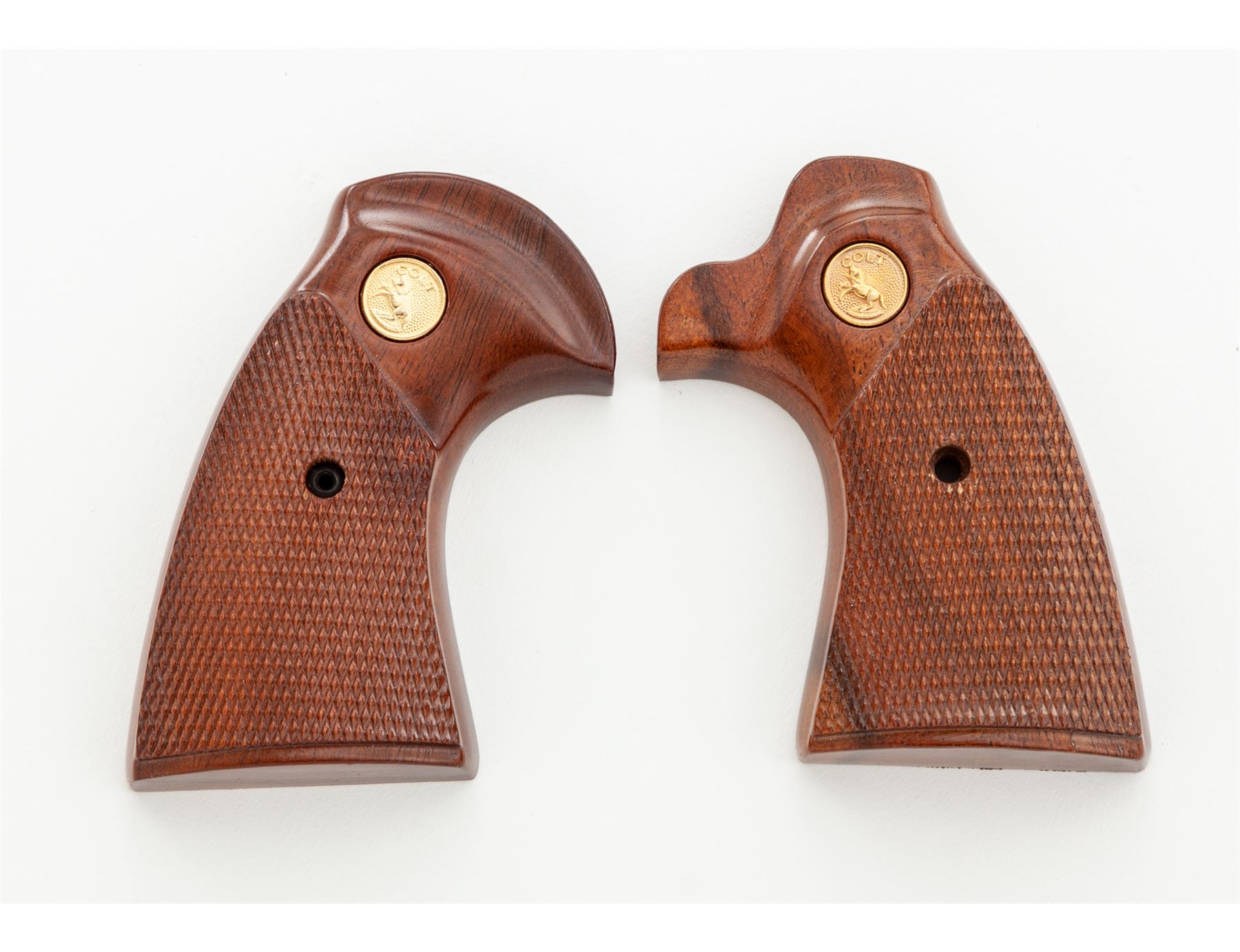 Colt Diamondback Double Action Revolver, #P02145, .22 LR cal., 4'' vent rib barrel, blue finish, checkered black rubber Pachmayr ''Presentation'' grips with gold Colt medallions, and also includes a pair of checkered wood grips with gold Colt medallions. Sights include a ramped blade front and fully adjustable rear. Mfg'd 1981. Approx. 98%+ original blue finish remains and revolver rates as in excellent overall condition. Cylinder with a faint index line, backstrap with a small spot of finish wear. Factory lettering is crisp. Both sets of grips are also excellent and appear near new, gold medallions are clean and shiny. Wood grips are missing the original grip screw. Mirror bright bore. Overall a clean and well taken care of Diamondback that appears to have been fired very little. Est.: $1,400-$1,800. (Modern/PPT)