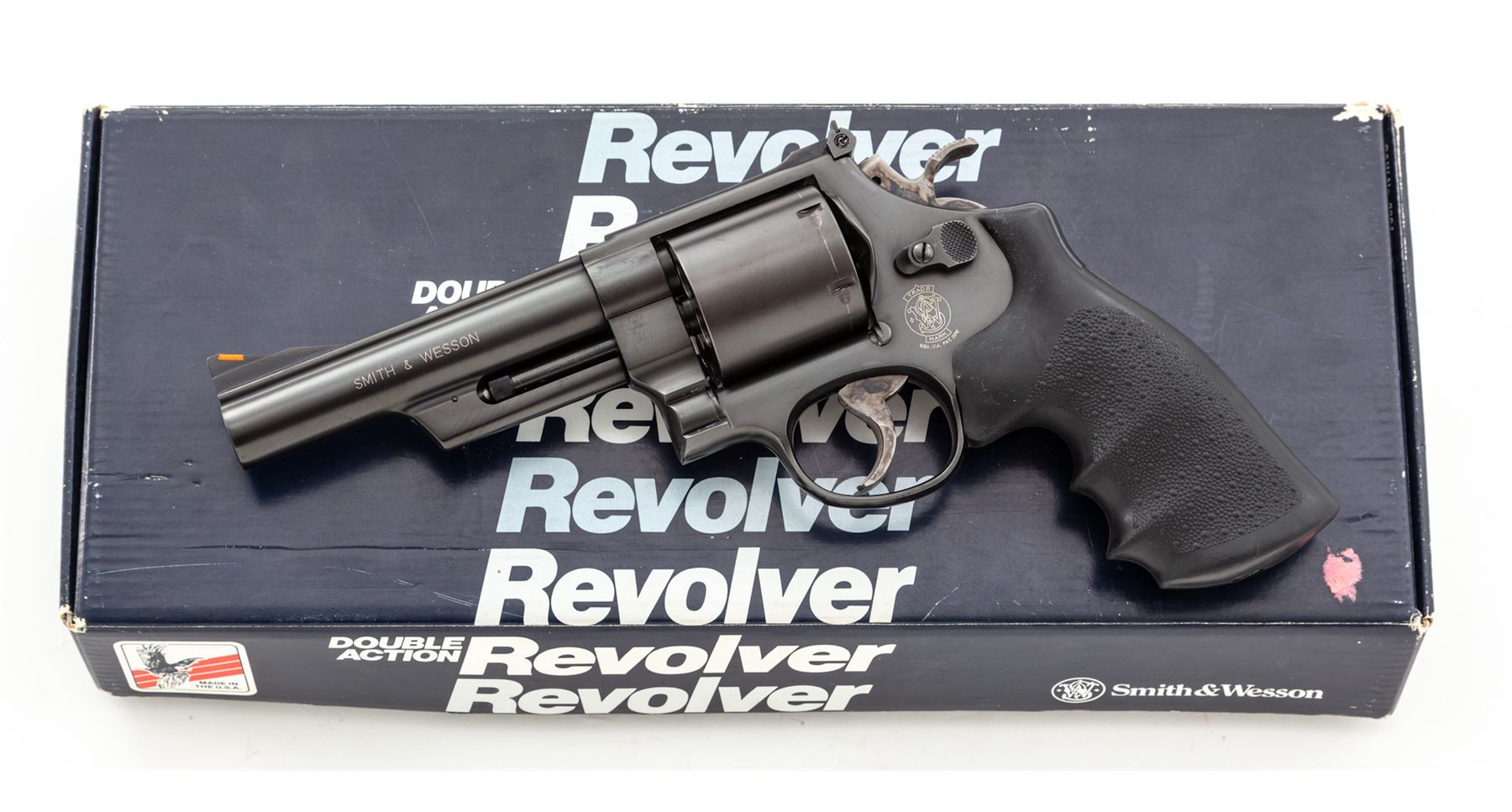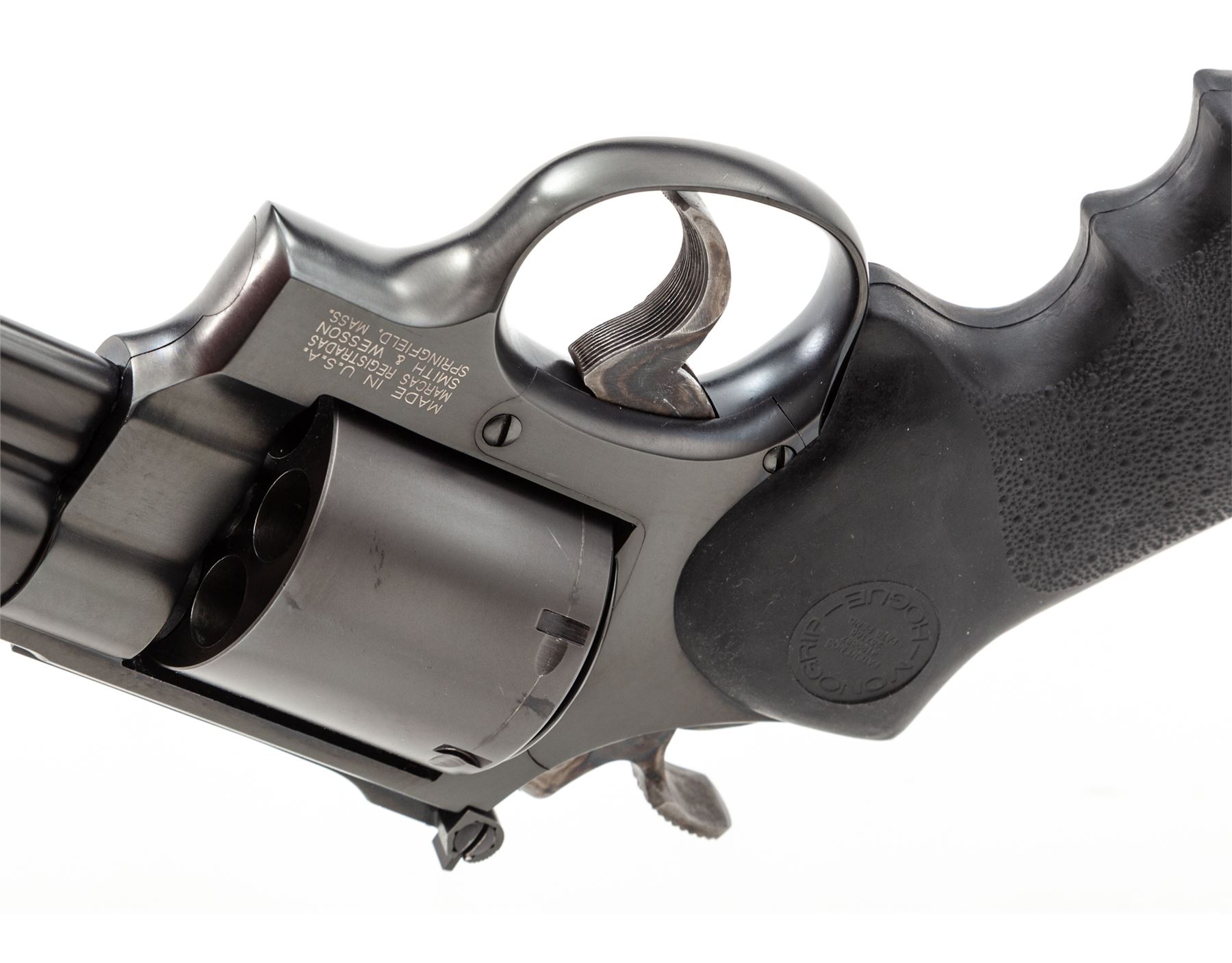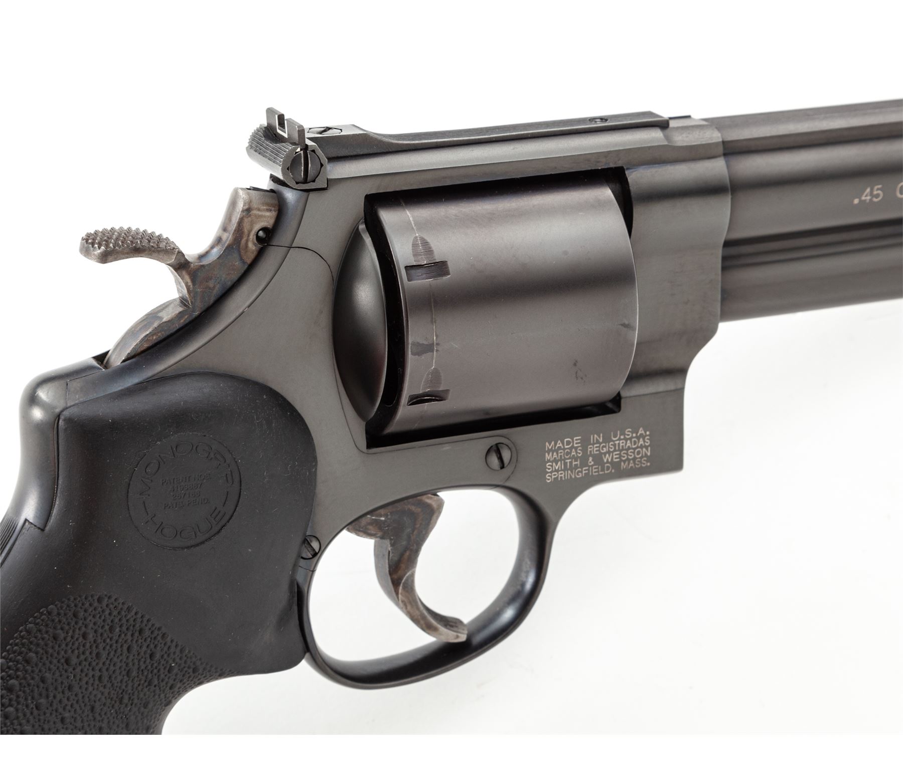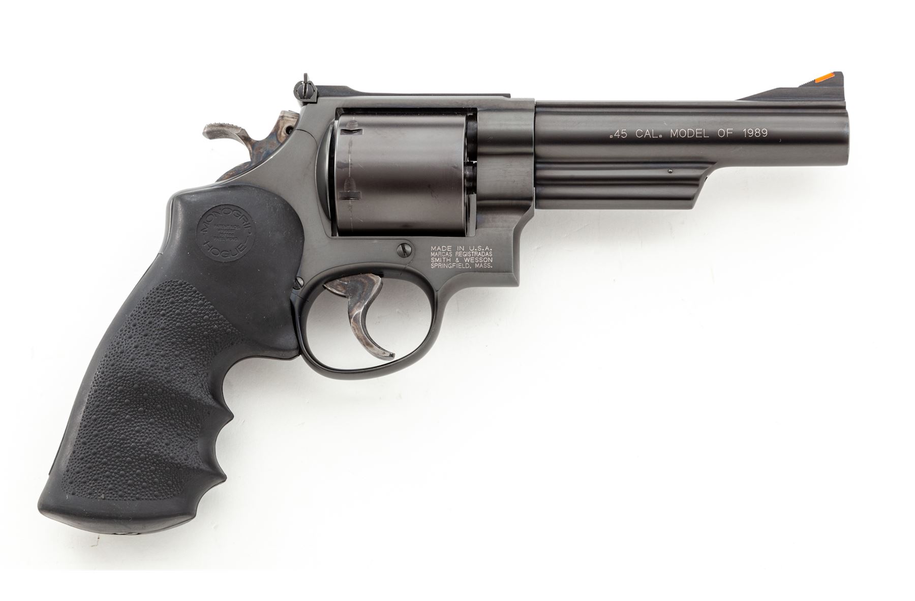 Custom Smith and Wesson Model 25-7 Double Action Revolver, #BDS6741, .45 Colt cal., 5'' barrel, satin black finish, Hogue finger-grooved rubber grips, target hammer, target trigger, custom orange ramp front and white outline adjustable rear sight. Action job, chamfered forcing cone and thinned grips with all custom work by George DeLio. In original S&W box numbered to the gun. This scarce limited edition revolver was produced in 1989 with only 1500 mfg'd. Single action trigger letting off right at 2.10 lbs. Condition is excellent, appearing as new and unused. Est.: $1,000-$1,400. (Modern/PPT)
