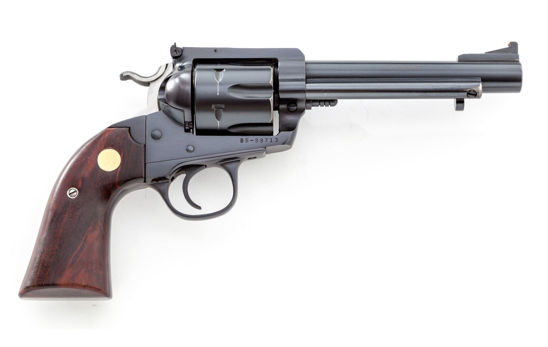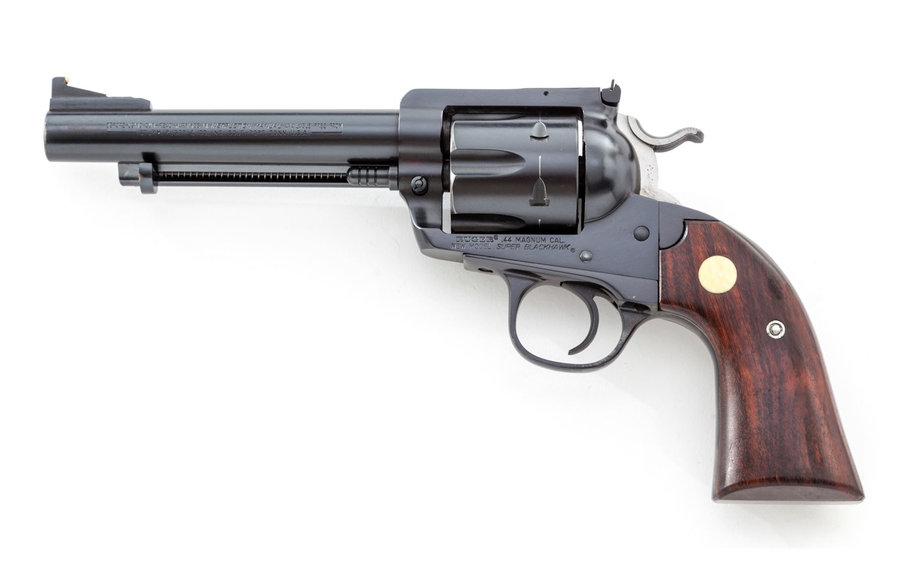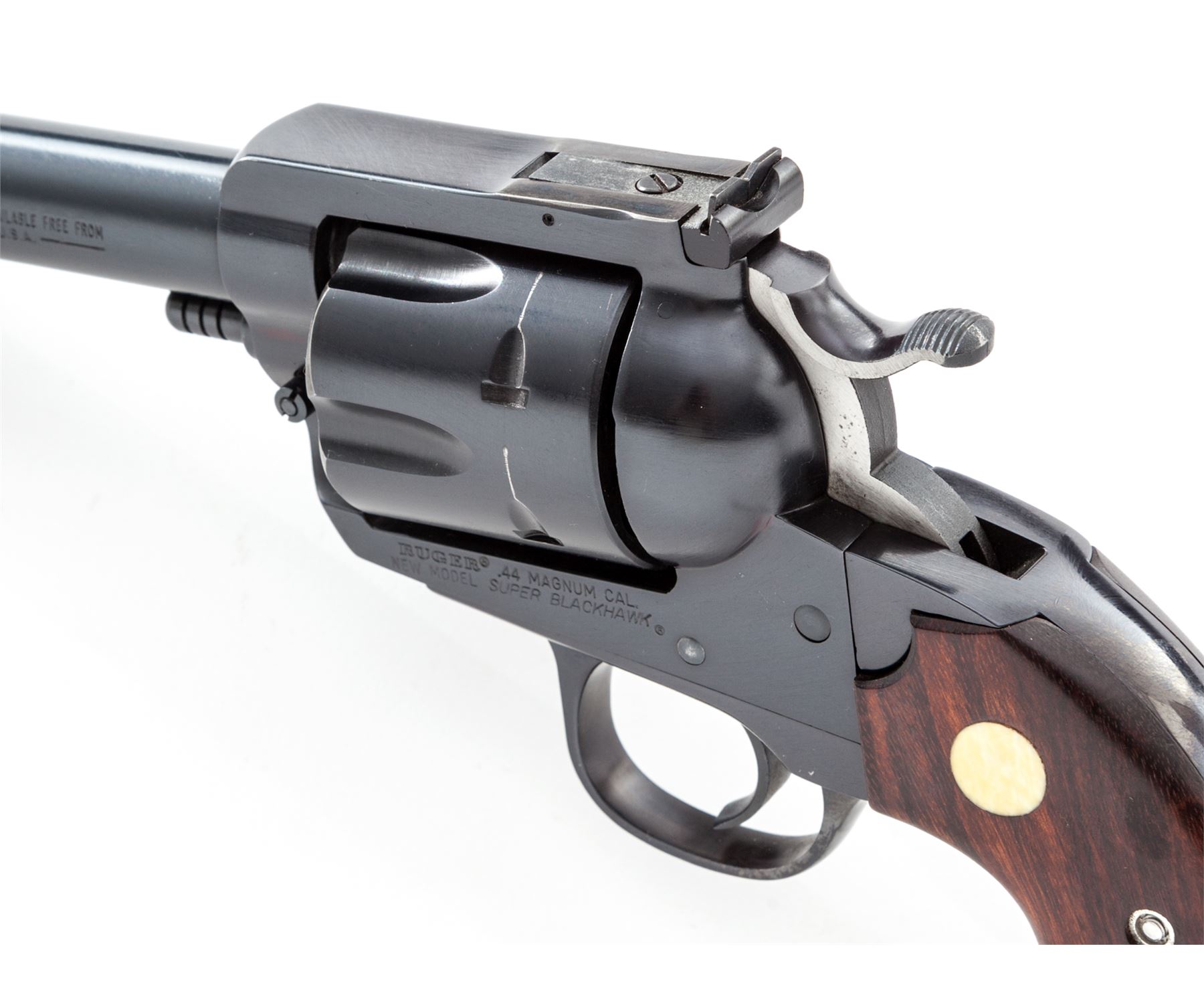 Customized Ruger New Model Super Blackhawk Single Action Revolver, #85-98713, .44 mag. cal., 5-1/2'' barrel, blue finish, rosewood grips, with adjustable ''V'' rear sight and gold bead front sight. As customized by local gunsmith George DiLeo, owner of The Gun Sight, Placentia, CA. George died in 2006 whose passing marked the end of a gunsmithing legend. A true craftsman and beloved member of the shooting community in So. Calif. Converted by George into Bisley configuration before Ruger produced their Blackhawk Bisleys. Condition is excellent as modified with crisp tuned action, re-contoured forcing cone, and very desirable sight configuration. Revolver shows mild range use with light wear at muzzle, thin index line to cylinder, and smoothing to grips. Est.: $1,200-$1,800. (Modern/PPT)