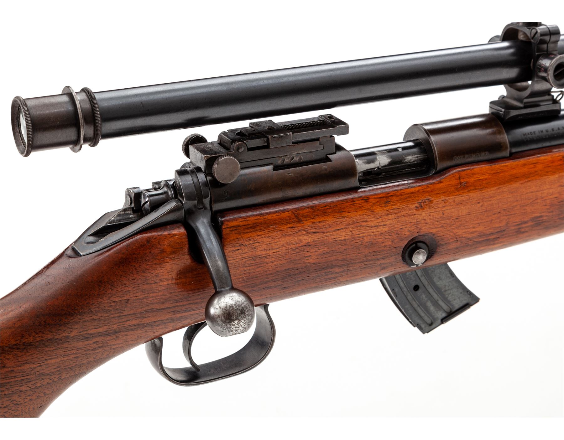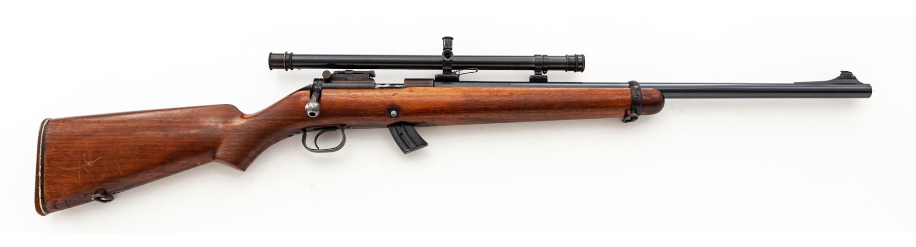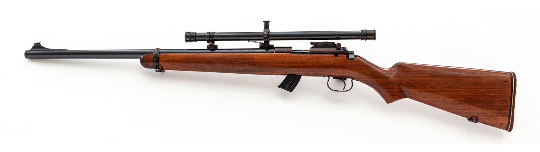 Winchester Model 52 Bolt Action Carbine, #27724, .22 LR cal., 23'' barrel, blue finish, smooth pistol-grip walnut stock, red rubber butt pad, with one 10-round factory magazine. Topped with a Winchester A5 scope on adjustable rings. Mfg'd 1934. Condition is near fine. Barrel retains approx. 92% blue. Ramp brass bead sight may be a later addition. Frame has toned and retains approx. 40% of its original blue. Stock with additional coat of linseed oil and light general scratching. Good action, fine bore, clear scope optics. Est.: $600-$900. (C&R)
