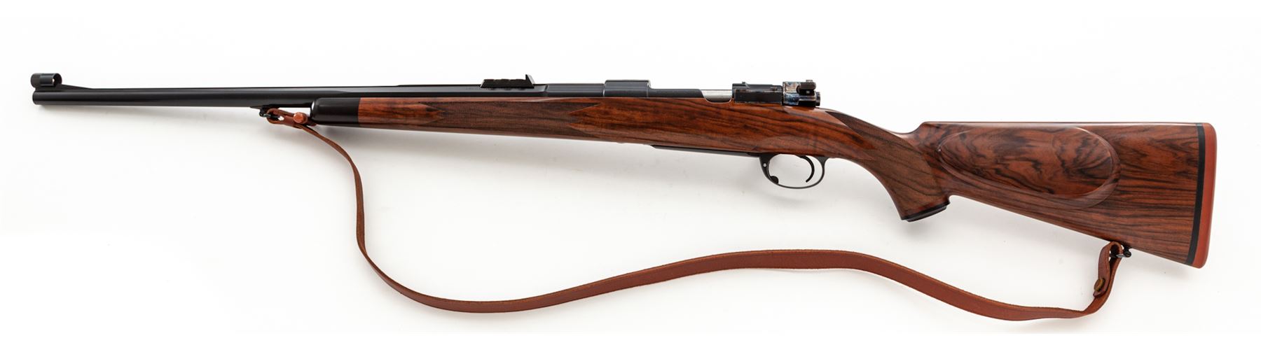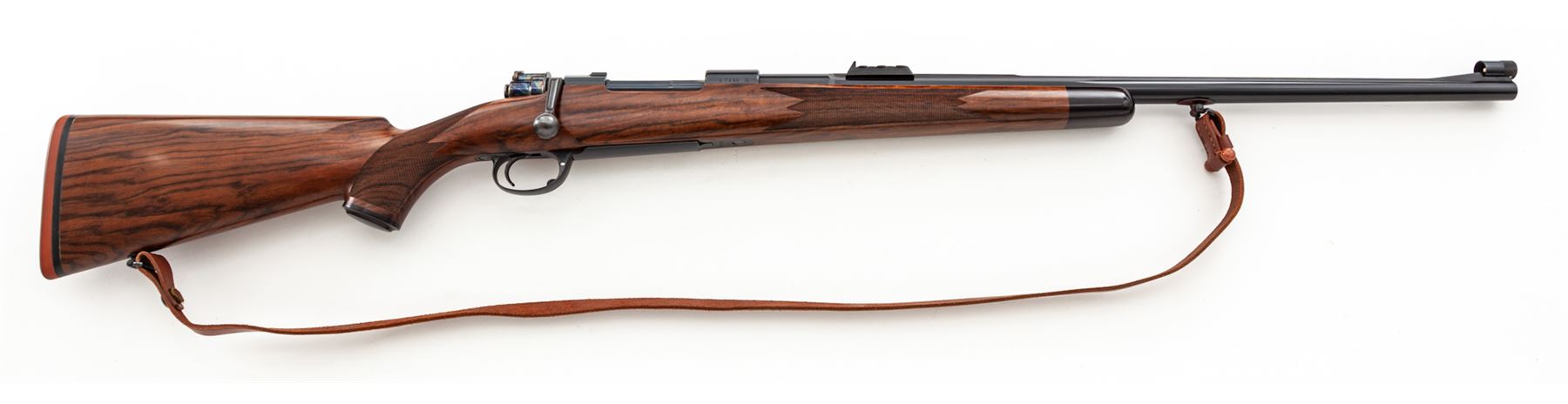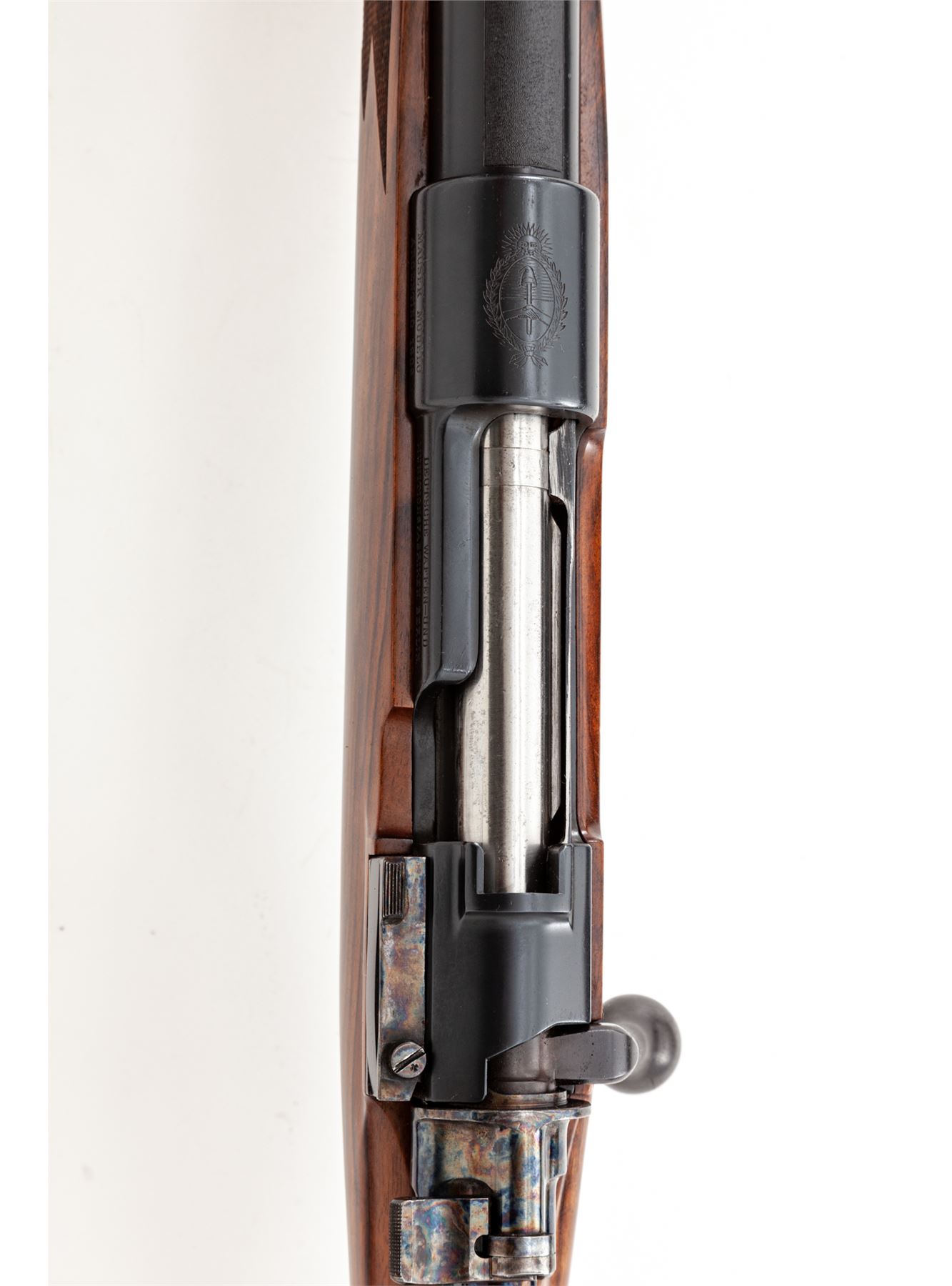 Custom Mauser Sporter Bolt Action Rifle, with RCBS custom reloading dies, #L7860, .375-338 cal., 24'' matted rib barrel with four leaf Express sights and hooded ramp white-dot post front sight, marked ''Made in Austria'' on blued DWM made receiver originally used on a Model 1909 Argentine Mauser. Argentine crest is present on receiver ring. Carbona blue finish with case hardened bolt head safety and bolt release. Bolt and follower have been polished bright. Trigger is tuned. Select figure Circasian walnut stock with shadow-line cheekpiece and finely checkered bird's beak pistol-grip and forend treatment, rosewood pistol grip and forend cap, with smooth red Old English butt pad and thin brown European leather sling. Condition is excellent showing little if any use. Metal treatment is accomplished to the highest standards and appears as new. Stock with virtually no marks of any kind and exhibiting a high degree of both fit and finish. Action is crisp, trigger is light, bore is excellent. Est.: $1,800-$2,400. (Modern)