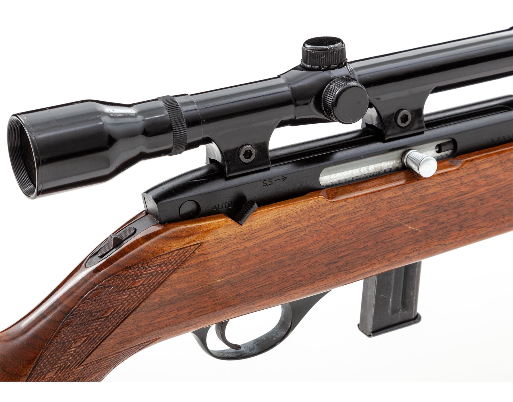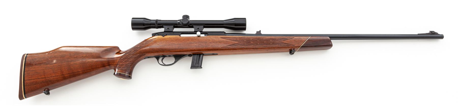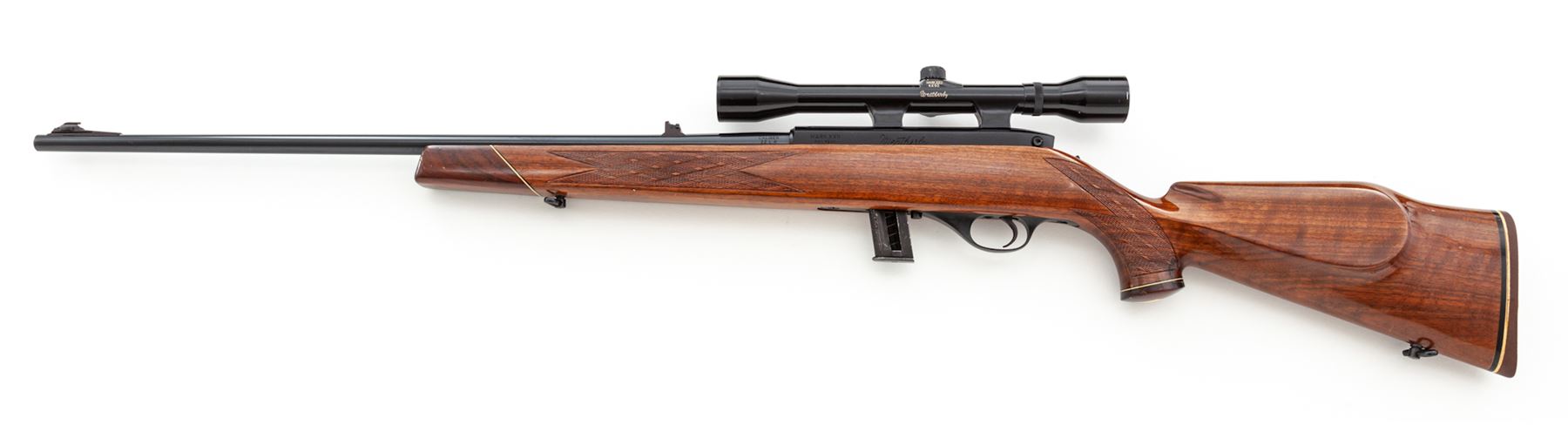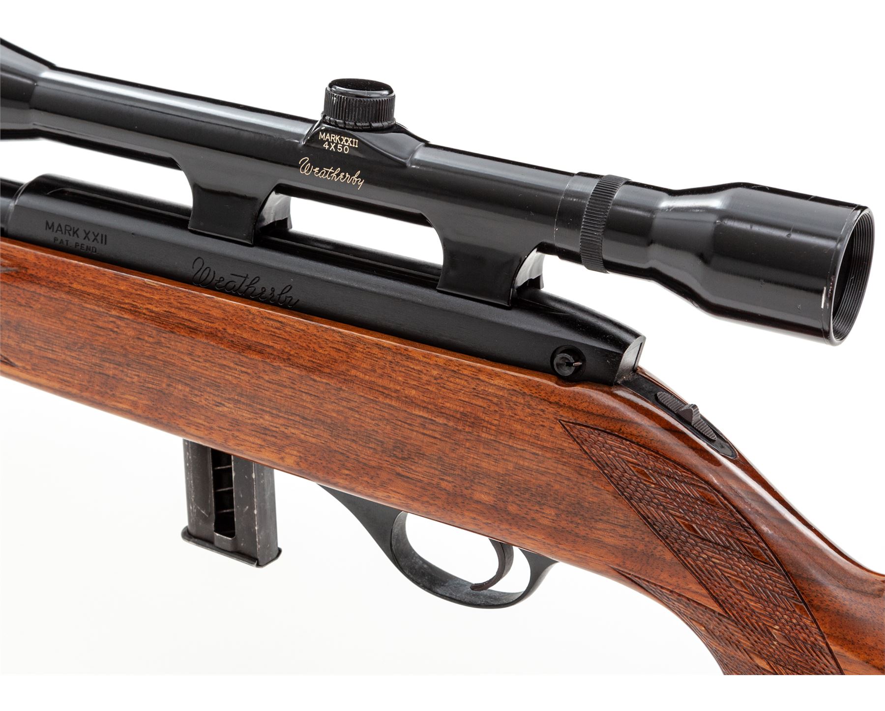 Weatherby MK XXII Semi-Automatic Rifle, #17345, .22 LR cal., 24'' barrel, blue finish, skipline checkered mahogany stock with rosewood forend and pistol grip cap, with one magazine. Topped with a Weatherby 4x50 scope. Condition is fine retaining approx. 97% original blue. Stock with light to just moderate marks from handling. Good action, bright bore, clear scope optics. Est.: $500-$750. (Modern)