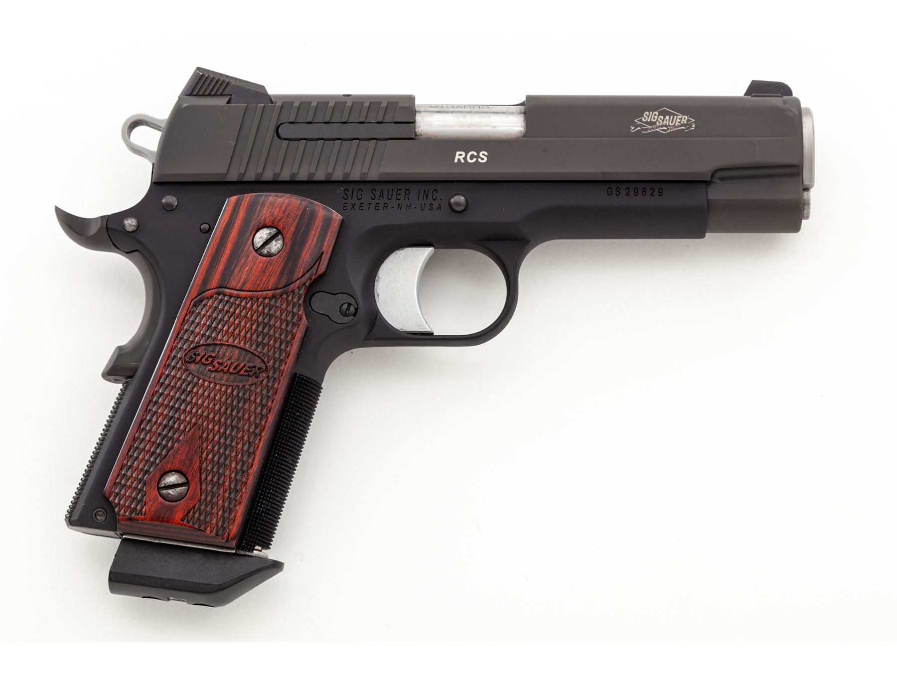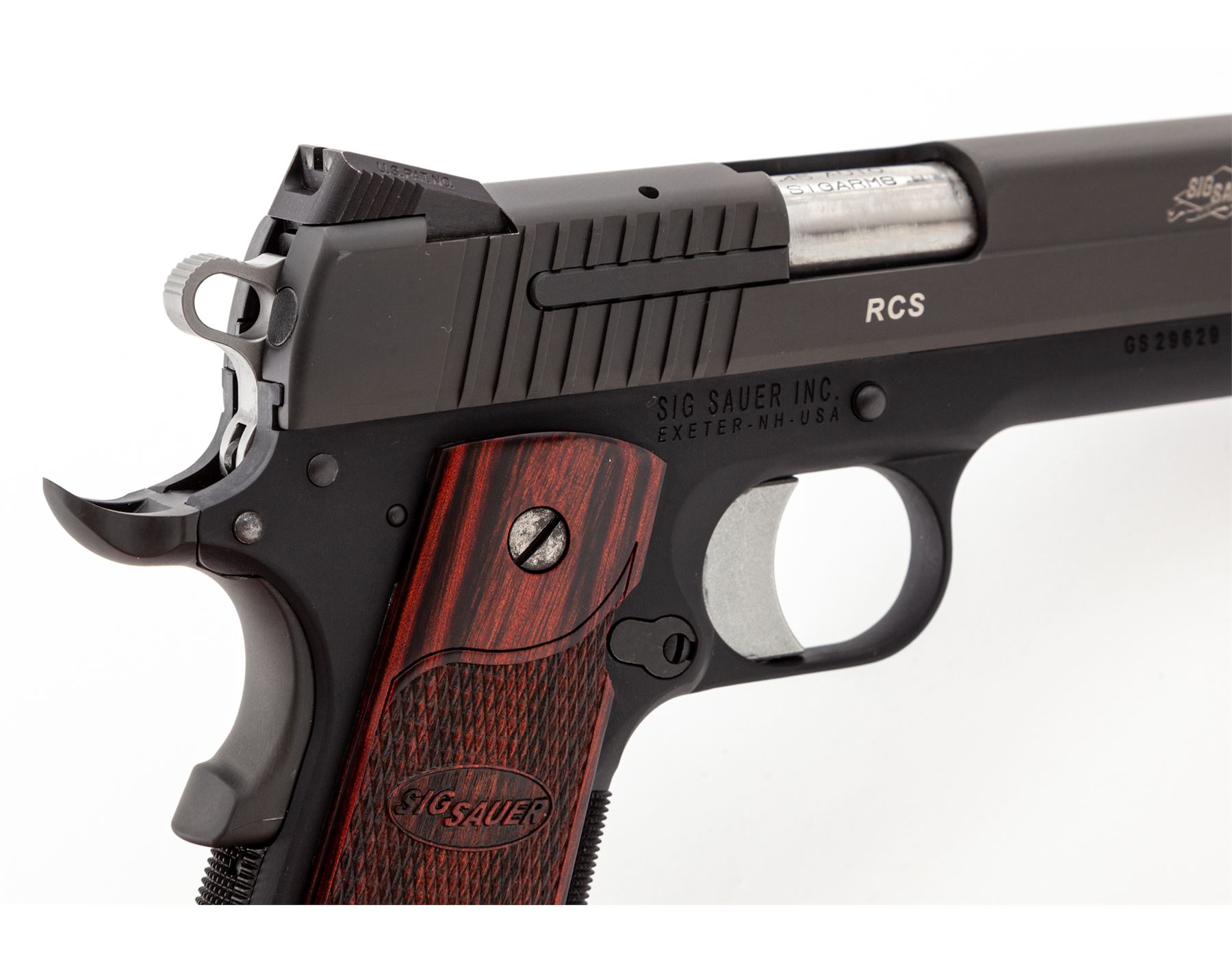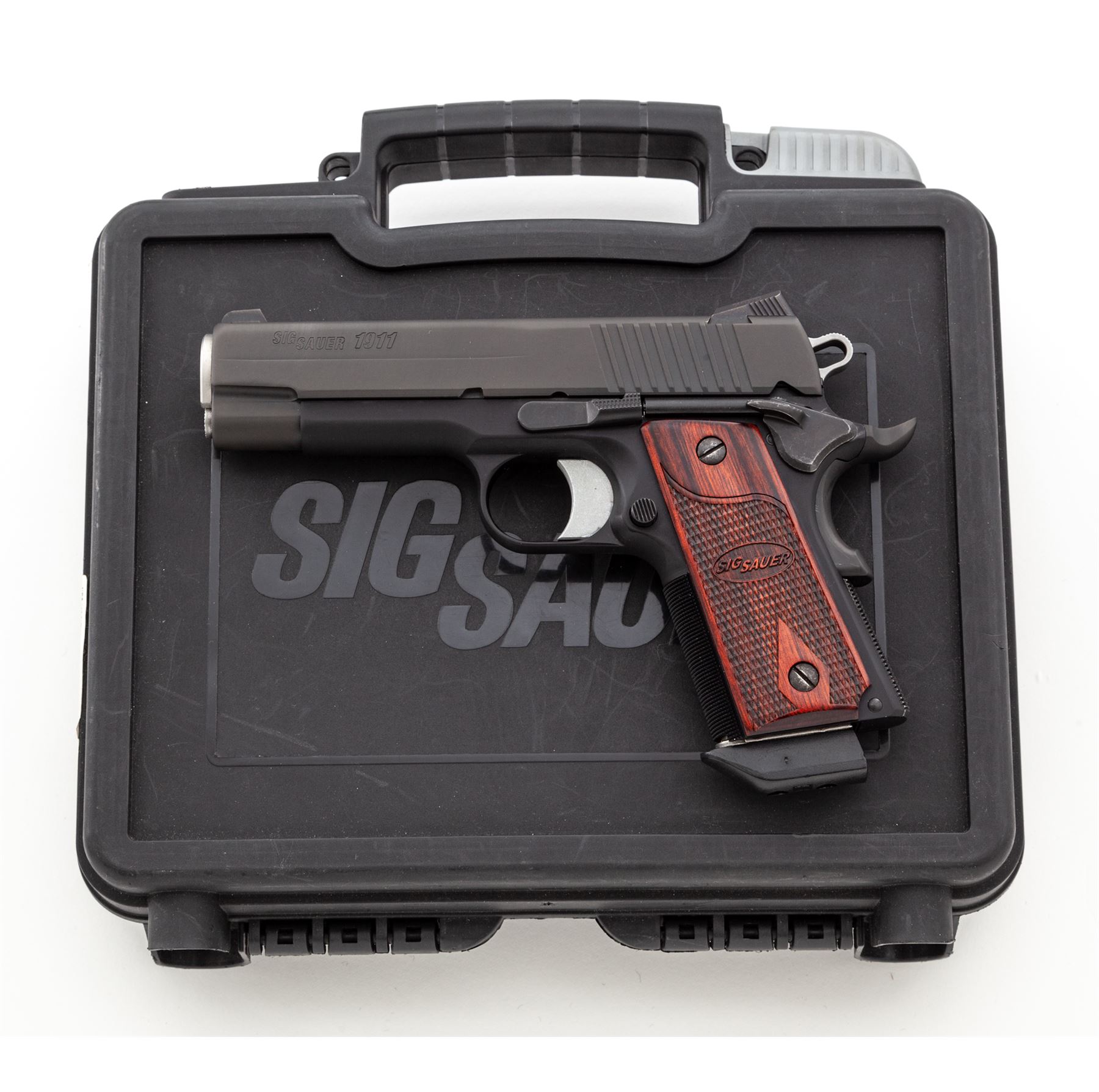 Sig Sauer 1911 Compact RCS Semi-Automatic Pistol, #GS29629, .45 ACP cal., 4.25'' barrel, black Nitron finish, checkered rosewood grips, checkered front and back strap, 3-dot night sights, lightweight hammer and trigger, one 7-round Wilson Combat, and one 7-round Chip McCormick magazine. In original black plastic Sig Sauer case with matching end label; case is missing one of the latches. Right side of slide is marked in a small banner ''Sig Sauer Custom Shop''. Overall condition is excellent retaining approx. 99% factory finish. Grips appear as new. Excellent smooth action; bright bore with strong rifling. Overall showing signs of only light range use. Est.: $700-$900. (Modern/PPT)