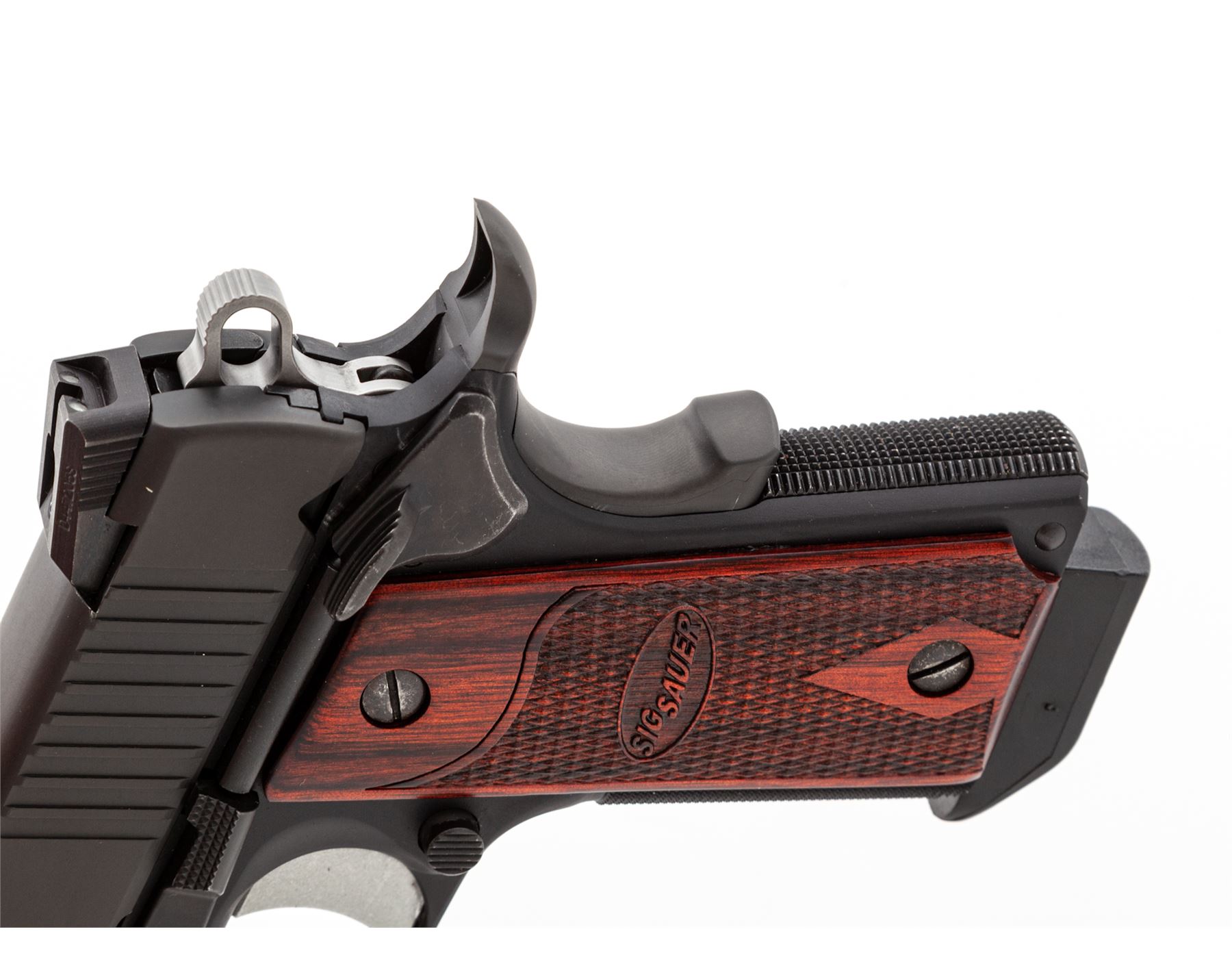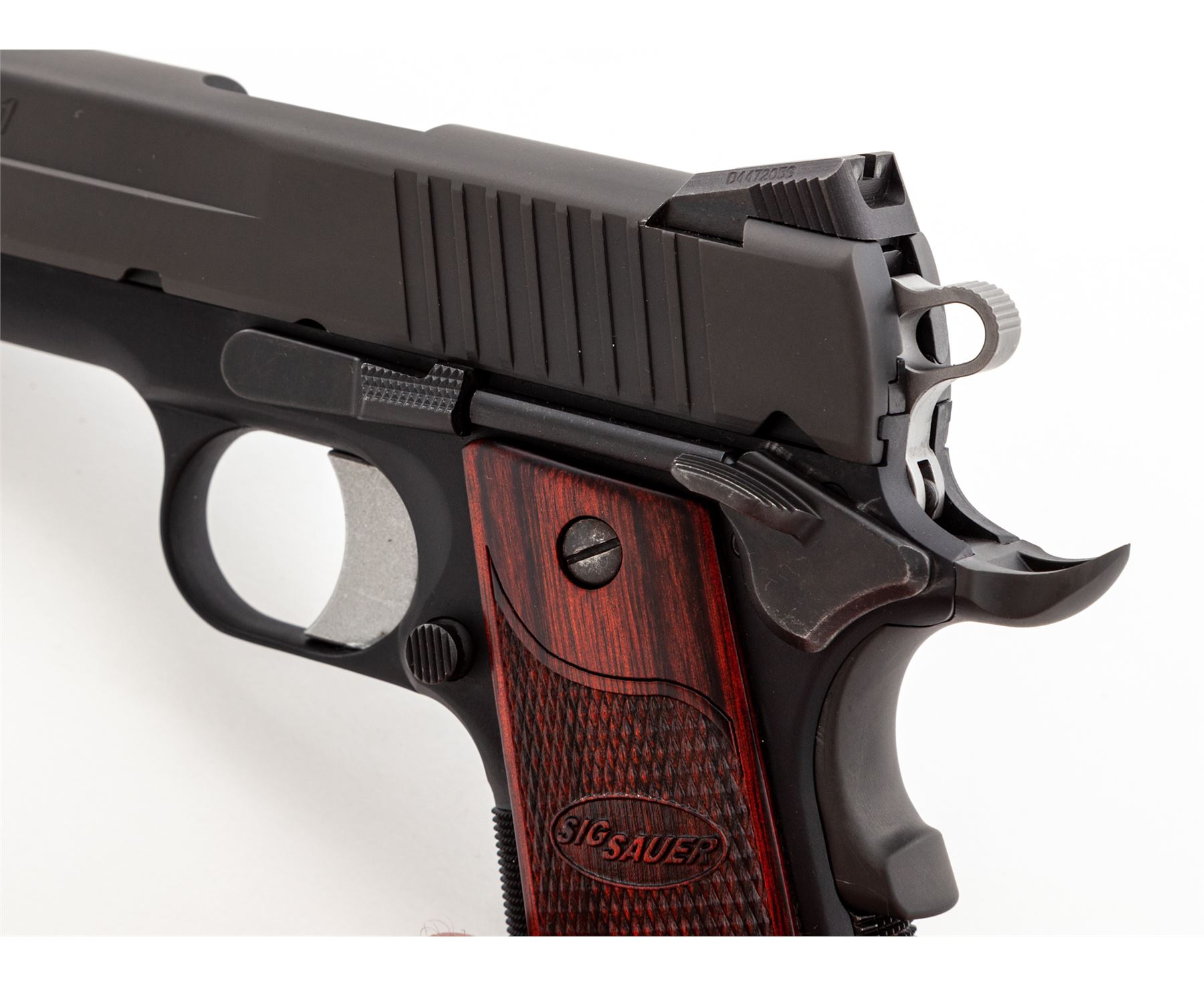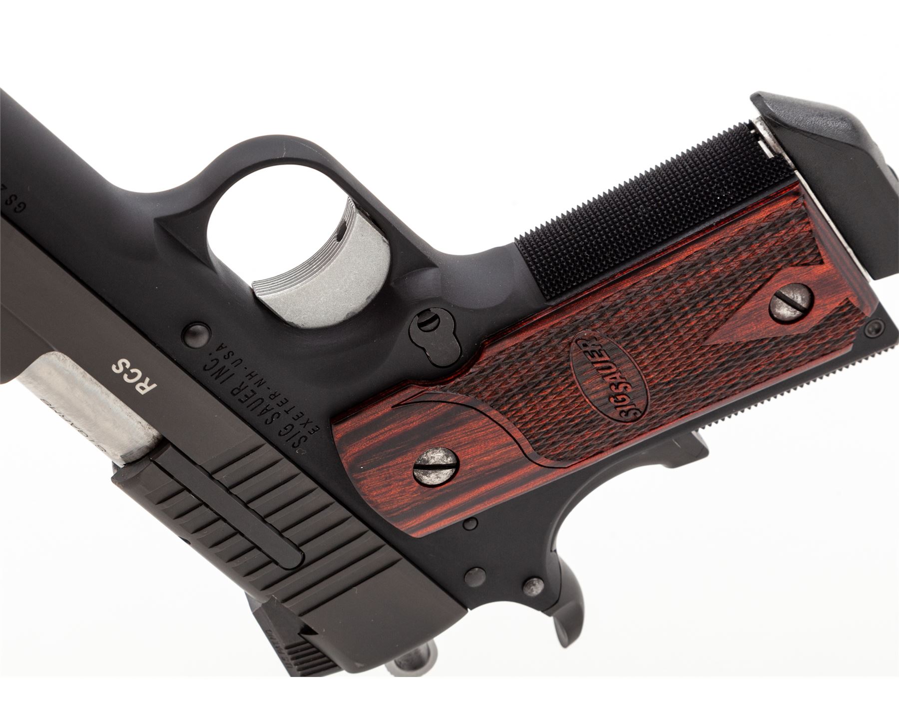 Sig Sauer 1911 Compact RCS Semi-Automatic Pistol, #GS29629, .45 ACP cal., 4.25'' barrel, black Nitron finish, checkered rosewood grips, checkered front and back strap, 3-dot night sights, lightweight hammer and trigger, one 7-round Wilson Combat, and one 7-round Chip McCormick magazine. In original black plastic Sig Sauer case with matching end label; case is missing one of the latches. Right side of slide is marked in a small banner ''Sig Sauer Custom Shop''. Overall condition is excellent retaining approx. 99% factory finish. Grips appear as new. Excellent smooth action; bright bore with strong rifling. Overall showing signs of only light range use. Est.: $700-$900. (Modern/PPT)