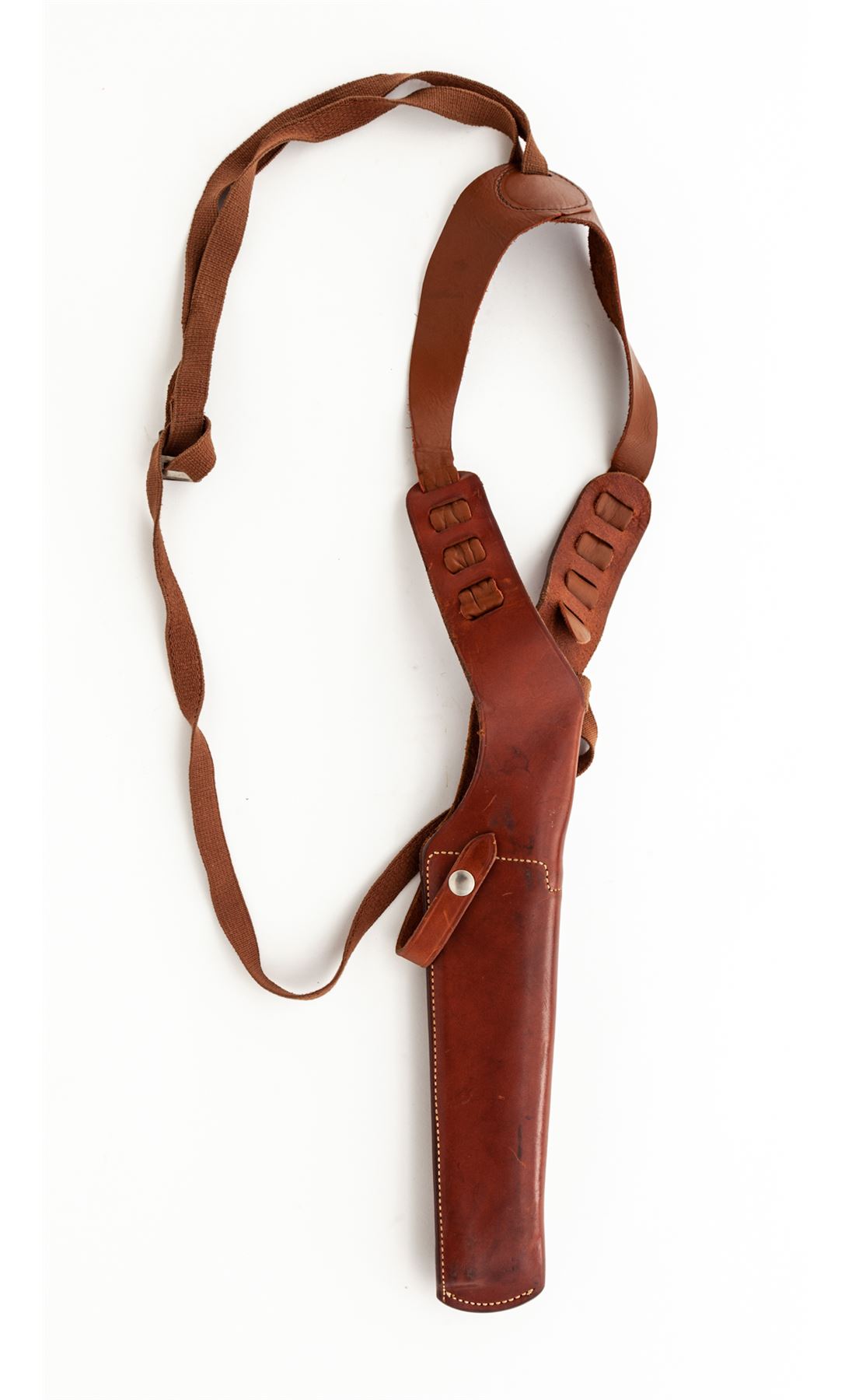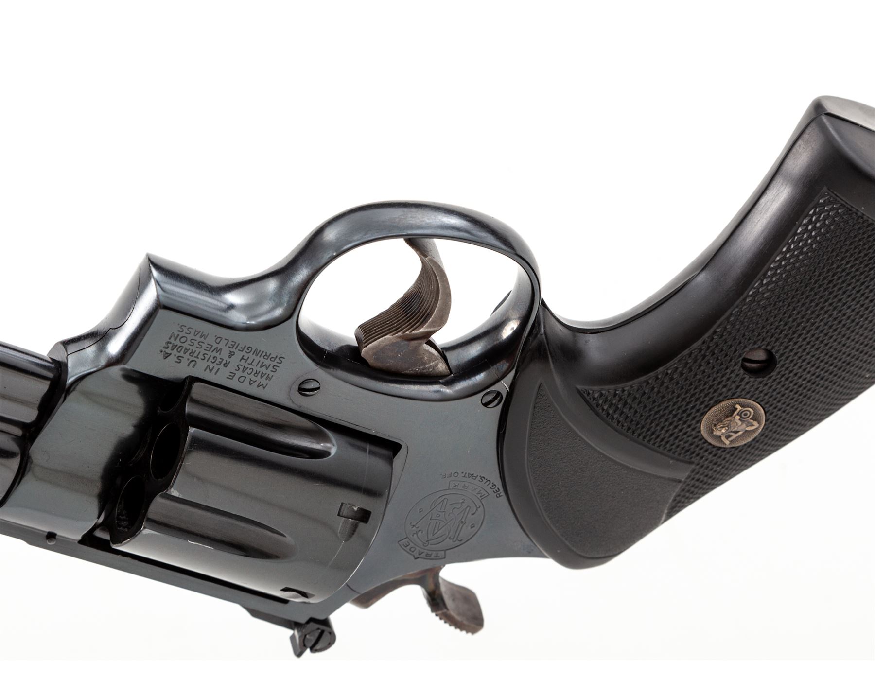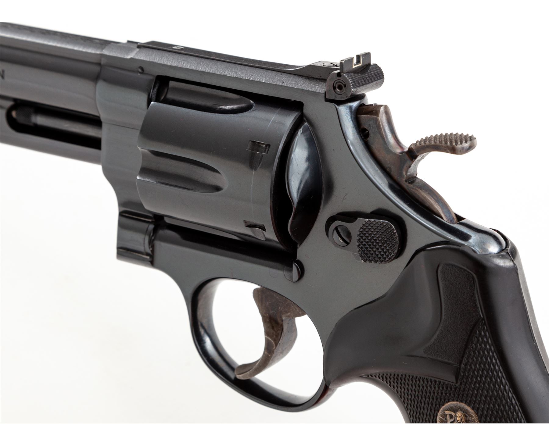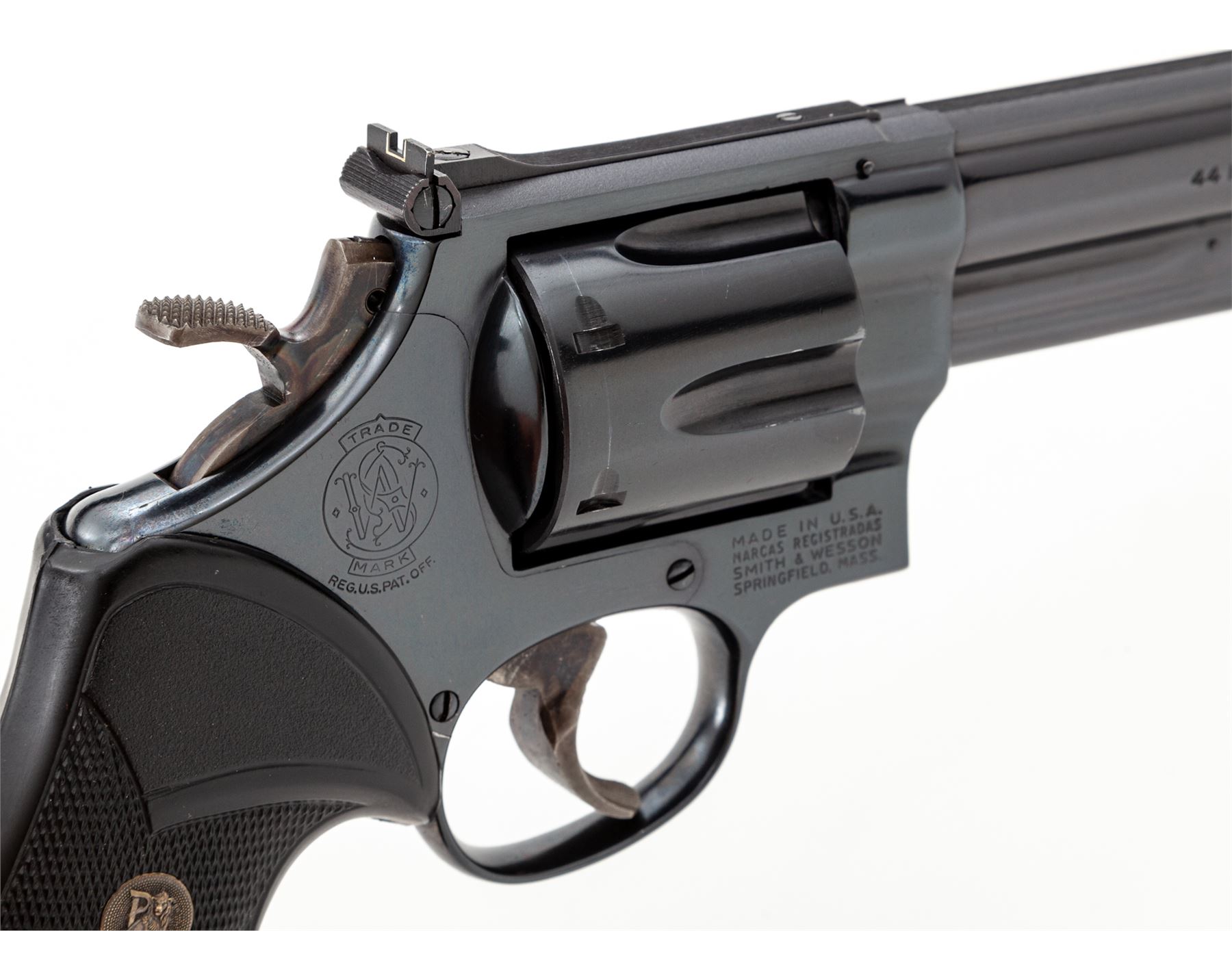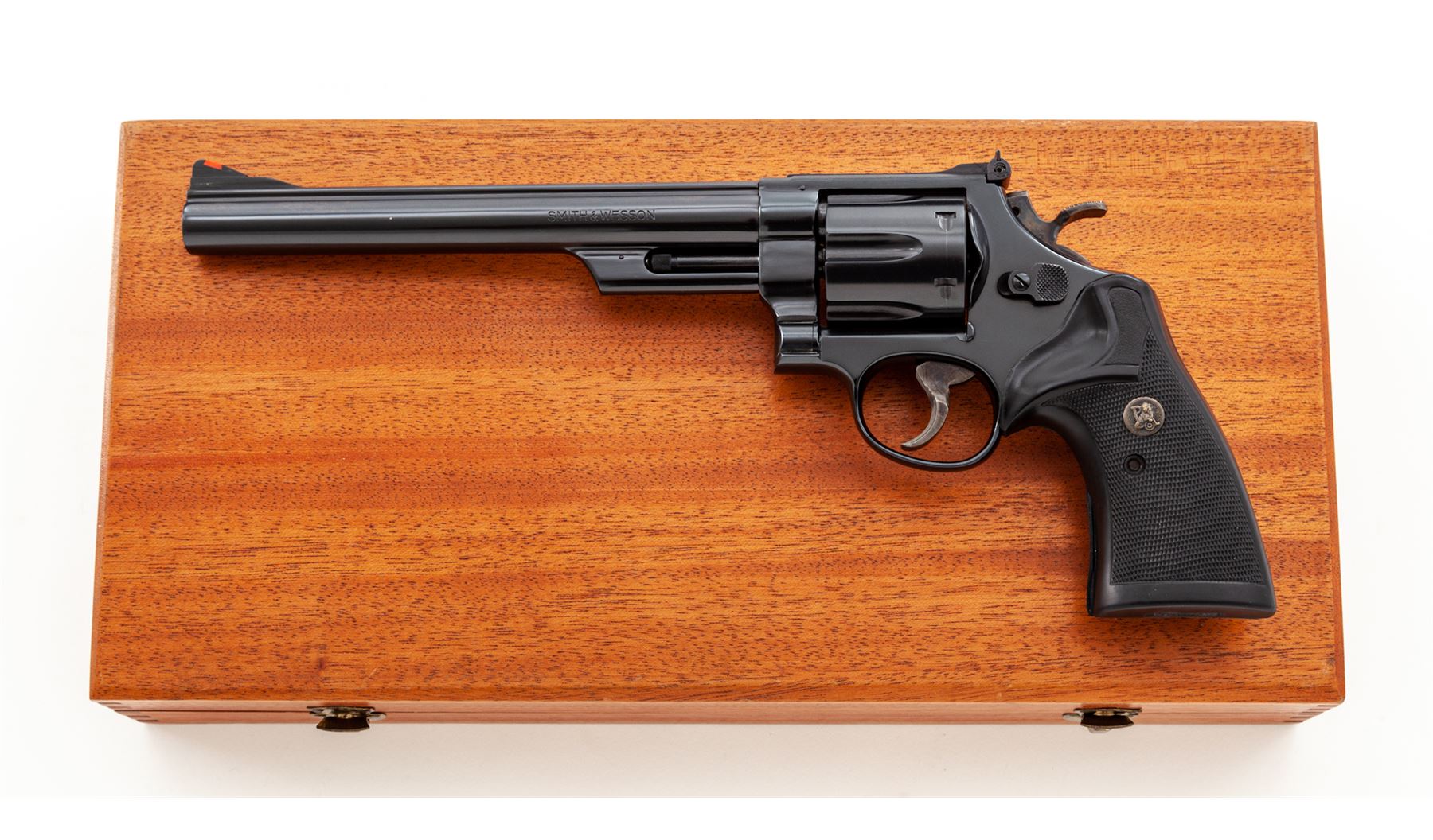 Smith & Wesson Model 29-2 Double Action Revolver, #N718451, .44 mag. cal., 8-3/8'' barrel, blue finish, Pachmayr checkered rubber grips, red ramp front and white outline rear sight, target trigger, target hammer. In mid-1970s era factory mahogany box that originally was lined with blue flocking on foam rubber. Includes a Bianchi #X-15 extra-large shoulder holster. Condition is excellent with only the lightest index mark to cylinder. Revolver appears near new with no real visible wear. Box has had its internal lining removed, exterior of which is excellent. Shoulder holster with some oil darkening near muzzle end. Est.: $1,000-$1,500. (Modern/PPT)