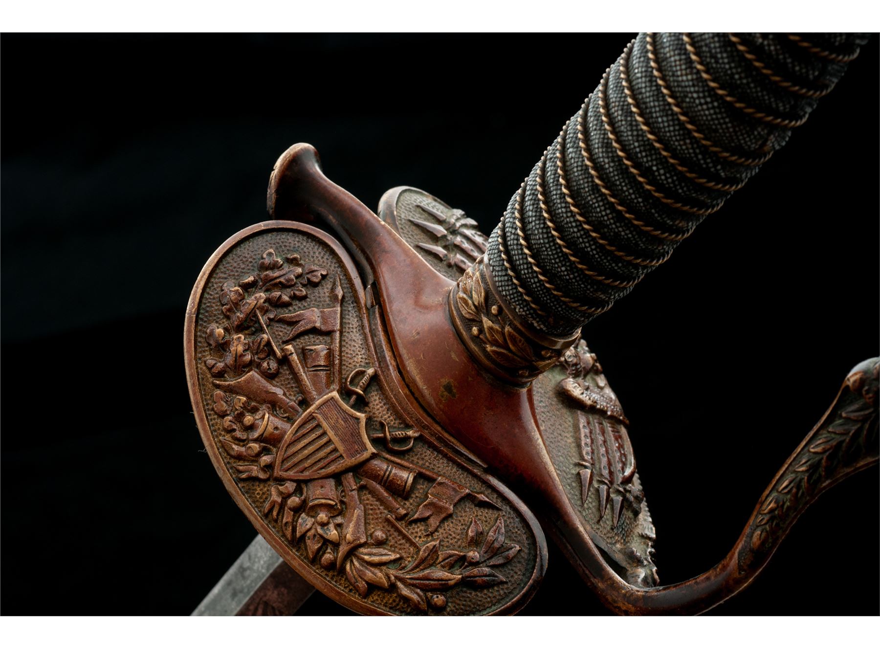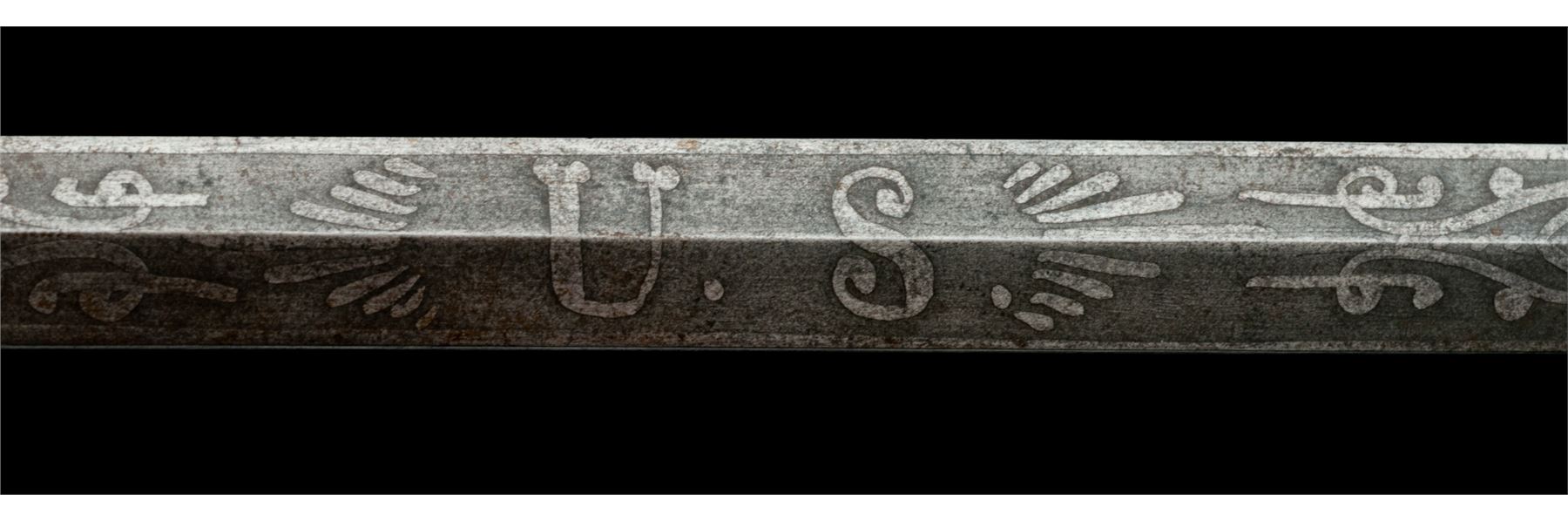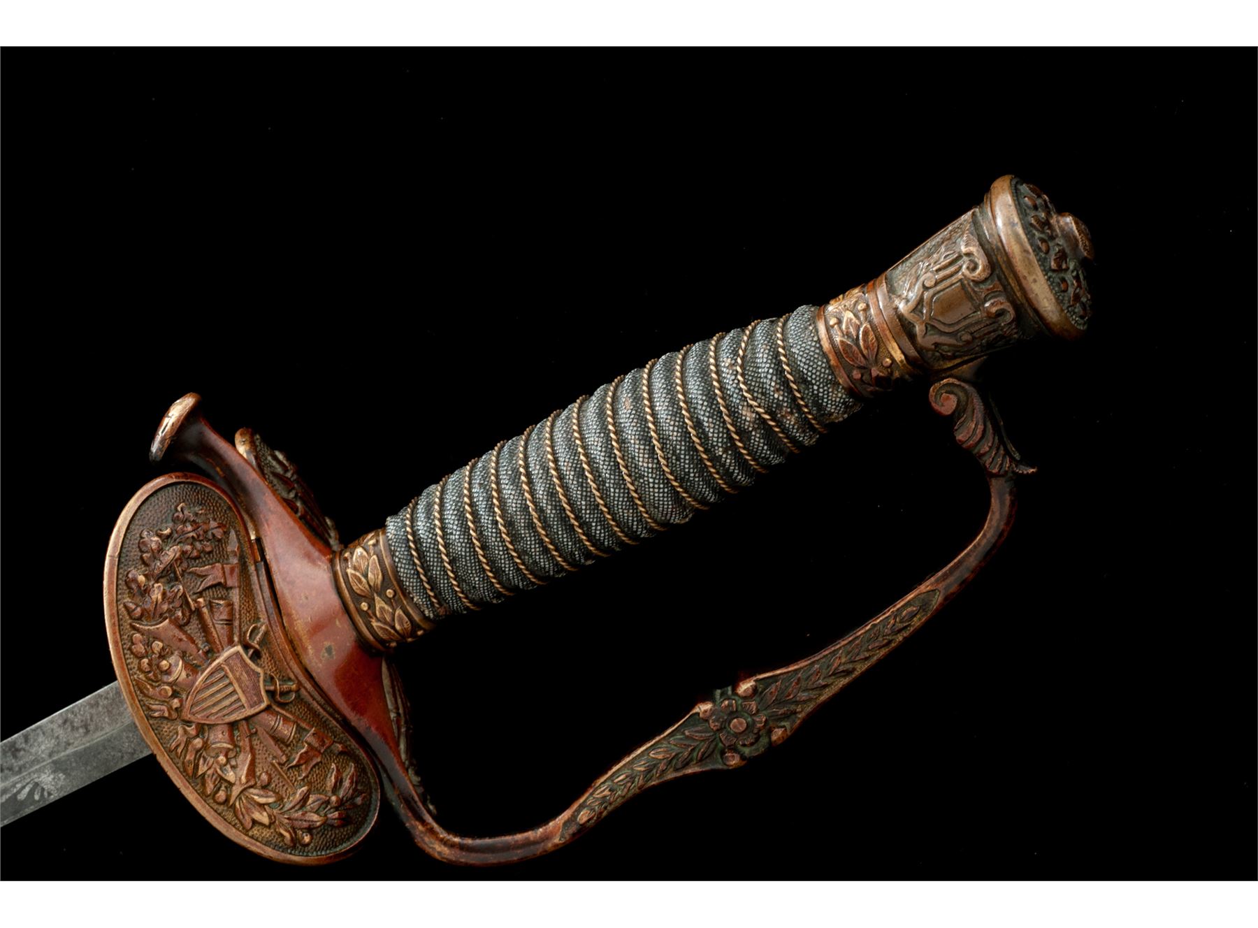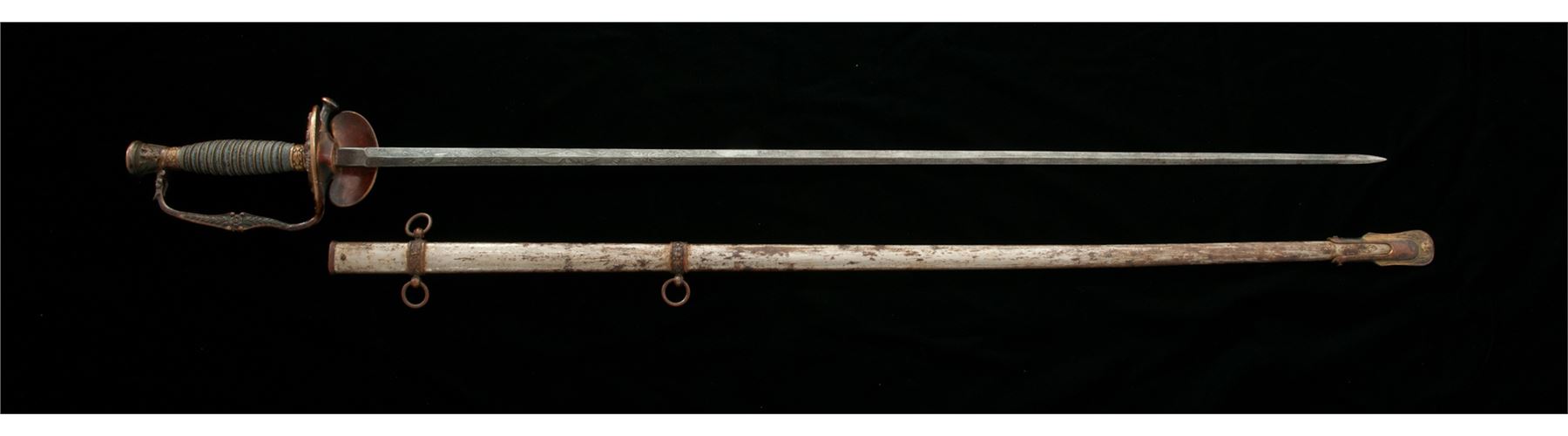 Civil War Era Model 1860 U.S. Staff & Field Officer's Sword, with etched decorated diamond-shaped blade. The 32.5'' blade has ''U.S.'', American eagle, and military motif decorations. There is no maker's mark on the blade. The clamshell guard and handle fittings have a nice dark uncleaned patina; rear clamshell is folding type and works properly. Hand grip is covered in sharkskin and has a single twisted brass wire wrapping. Knuckle guard bow has a wavy bend in it. Handle is tight to the blade. Scabbard shows a rusted patina to the plated surface, mostly on one side, the other having a more scattered rusted appearance. Est.: $250-$400.