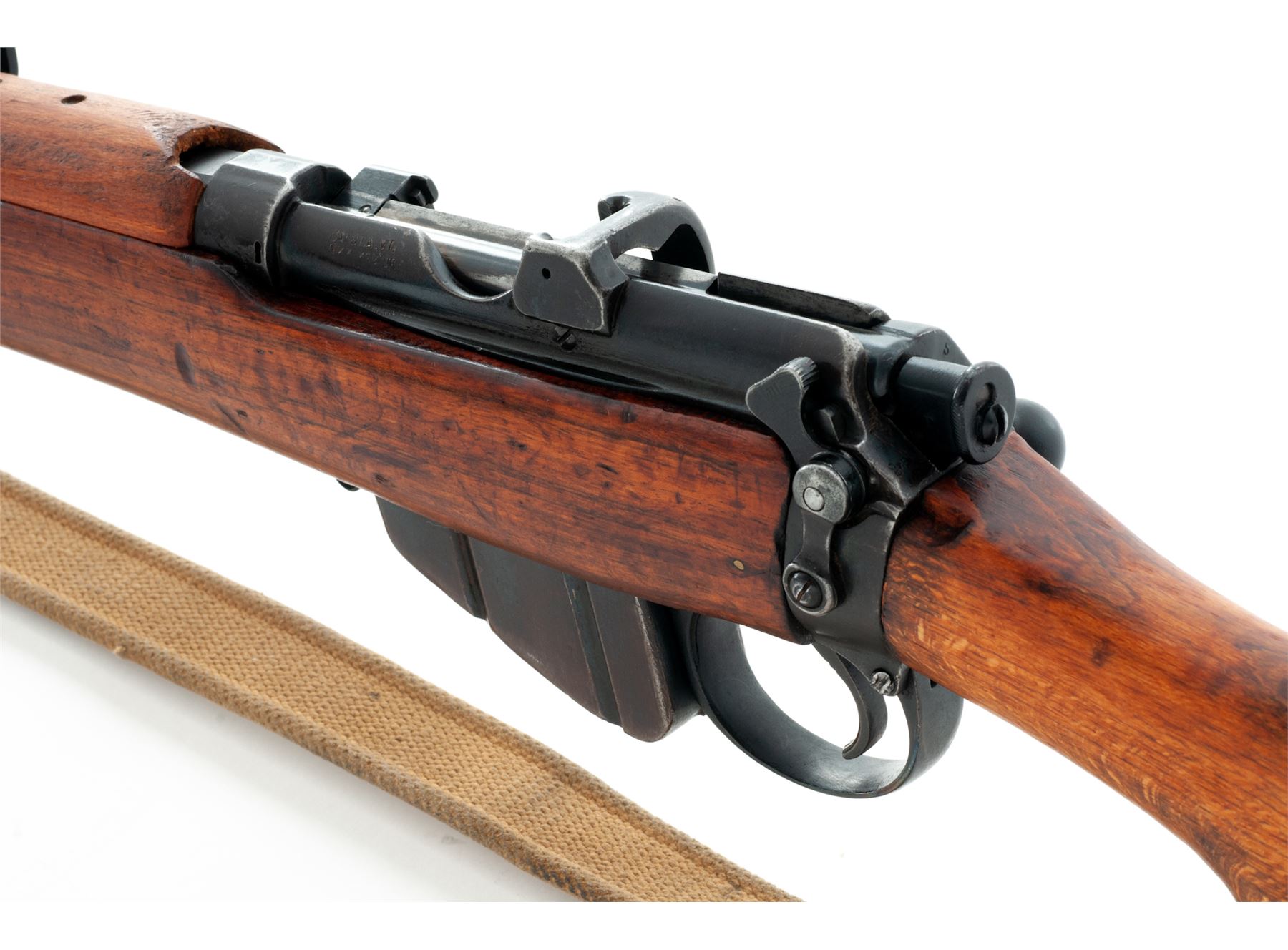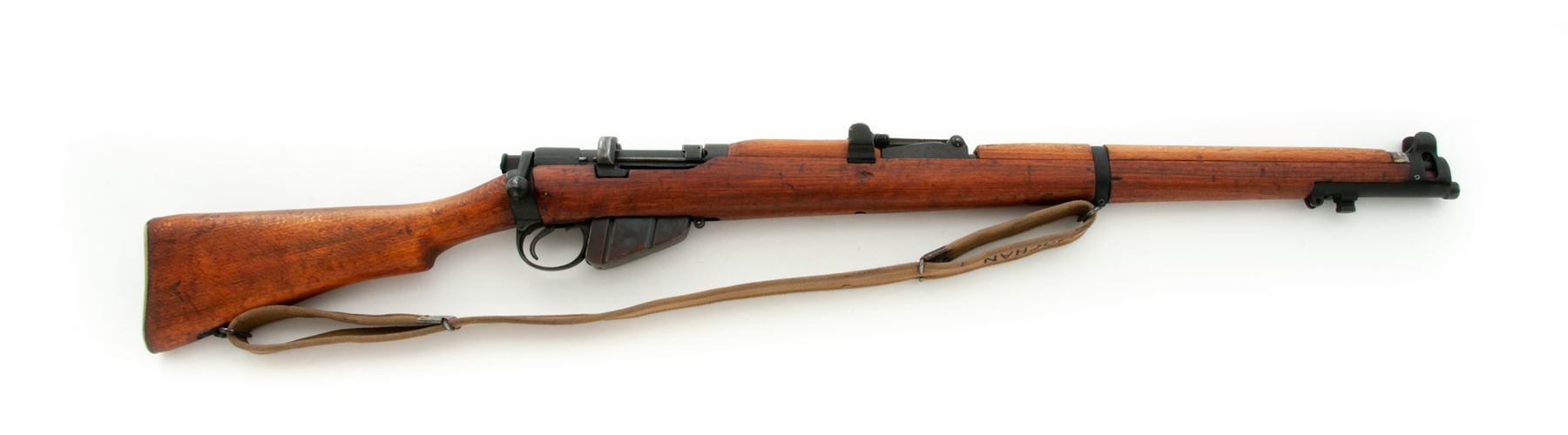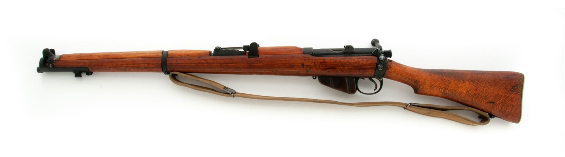 British No. 1 Mk III Lee-Enfield Bolt Action Rifle, #S8148, .303 British cal., 25.2'' barrel, blued finish, hardwood stock, blade front sight with protective ears and adjustable leaf rear sight. Marked on right side of action body ''(crown) G.R LSA CO.LD 1915 SHT.L.E III''. Matching numbers on bolt handle, rear sight, and nosecap. No serial numbers on magazine. Condition overall is very good with approx. 80% finish remaining on the metal with the nose cap and front band refinished. Wood has been sanded and refinished with a flat stain. Action is smooth, bore is excellent. Import stamped on left side of receiver. Includes a British cotton sling in good condition which has a name written on it. Est.: $300-$400. (C&R)