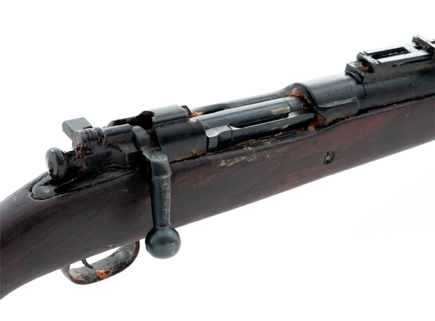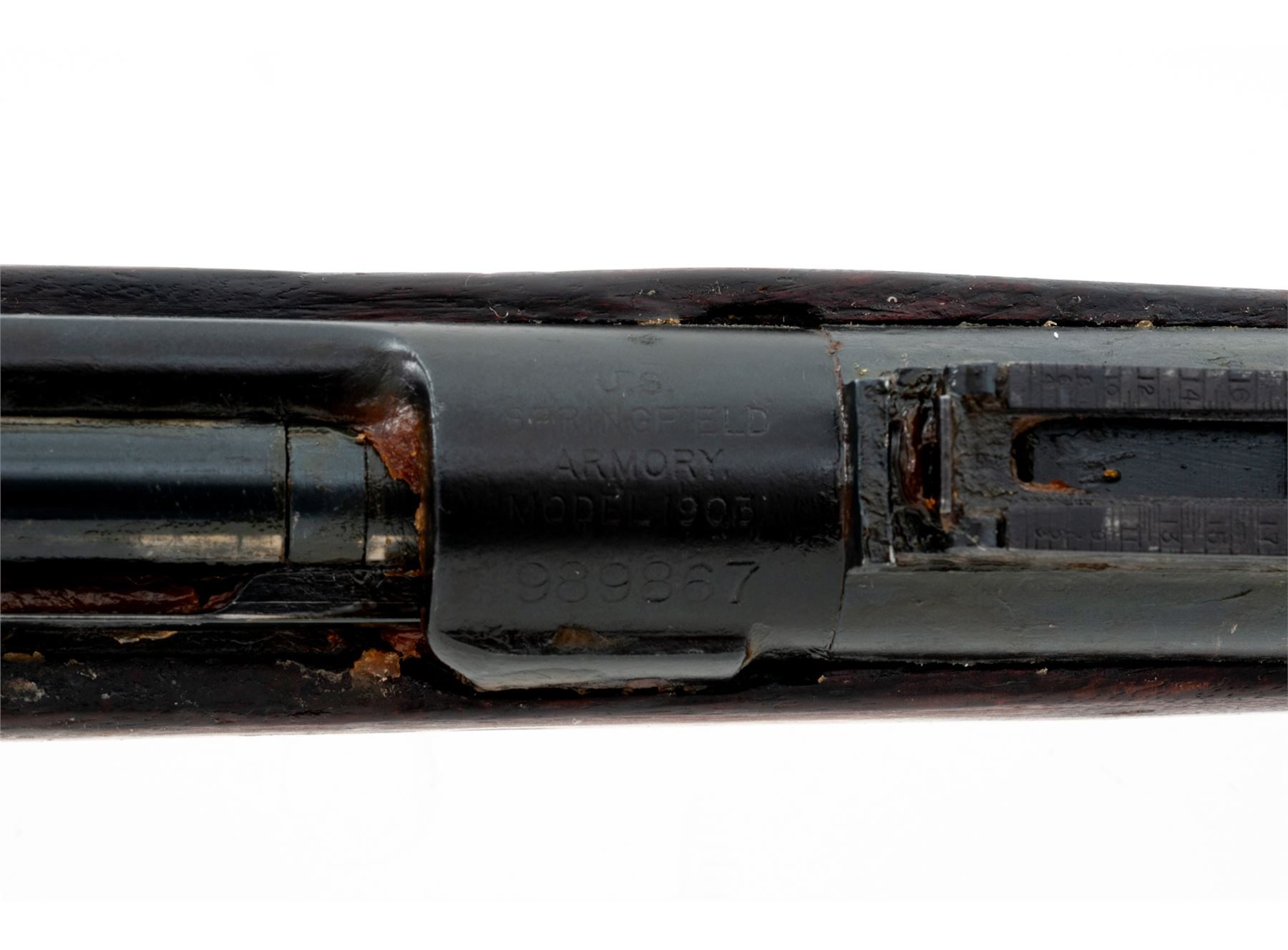 U.S. Model 1903 Bolt Action Rifle, by Springfield, #989867, .30-06 cal., 24'' barrel, black finish, hardwood scant type stock, blade front sight without hood and adjustable folding leaf rear sight. Marked on receiver ring ''U.S. SPRINGFIELD ARMORY MODEL 1903'', and on barrel behind the front sight ''(circle S)/(flaming bomb)/9 44''. Rifle appears to be a Greek Army issued rifle imported to the U.S. Non-matching serial numbers have been electric-pencil engraved on the bolt handle and stamped on right side of buttstock. Rifle is coated in cosmoline. Condition overall is very good with almost all of the black finish remaining on the metal, with light scratches on the front sight band. Wood is very good with minor handling marks. Bore is filled with cosmoline; action is smooth but safety lever is jammed (possibly with cosmoline) in the fire position. No visible import stamps. Est.: $400-$600. (C&R)