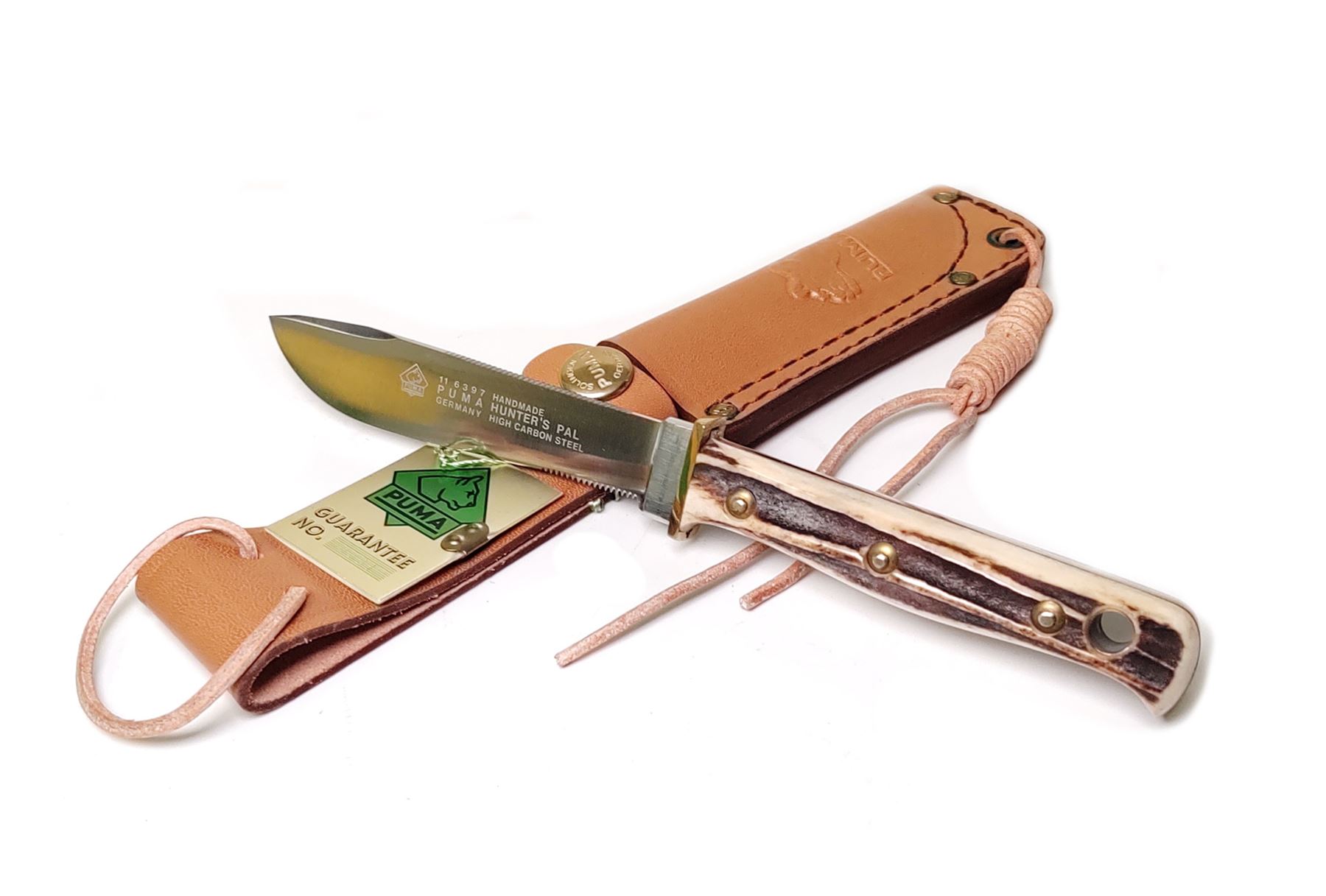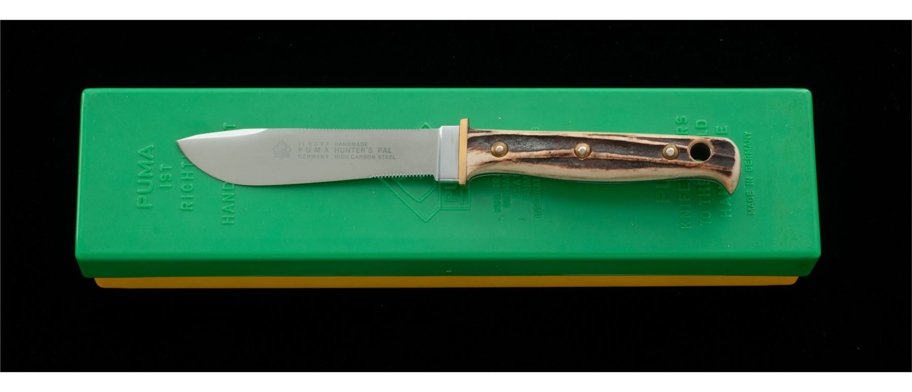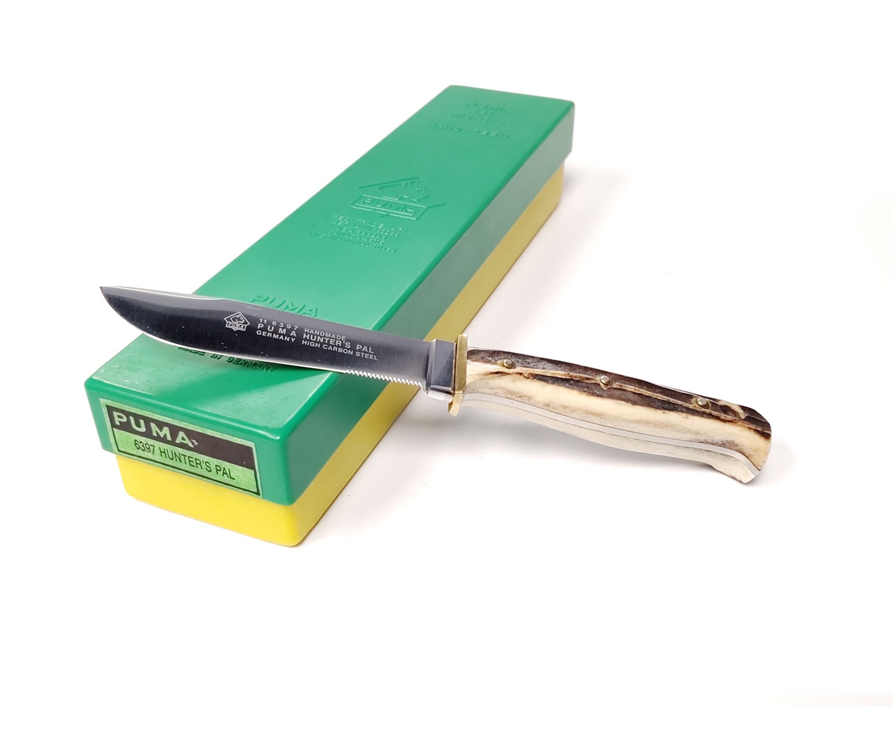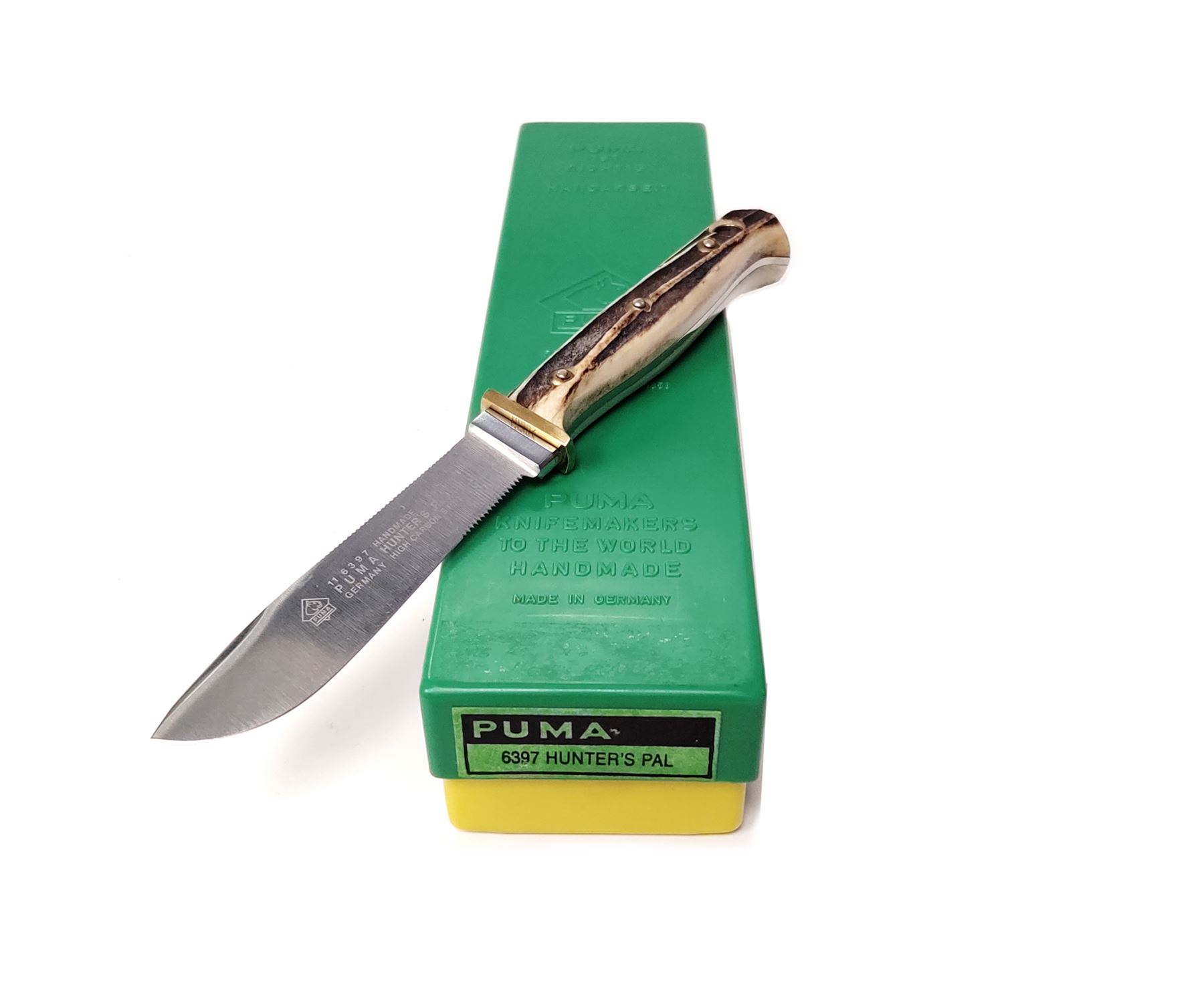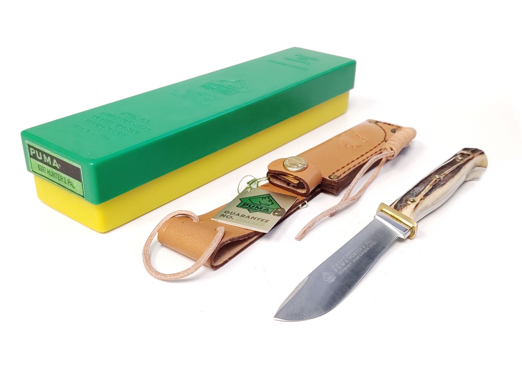Puma #6397 Hunter's Pal Fixed Blade Knife, with original box and sheath. 3.75'' drop-point high carbon steel blade; original ''Rockwell'' hardness test sticker still attached. 8'' overall length, stag handles, and brass guard. Mfg'd in 1986. Included is the original tan leather sheath with hang tag, two-piece yellow and green plastic box with correct end label, foam insert, and sharpening instructions. Overall condition is excellent, never carried, with the factory edge; blade with a few light storage and handling marks. Sheath appears as new. Est.: $150-$250.
