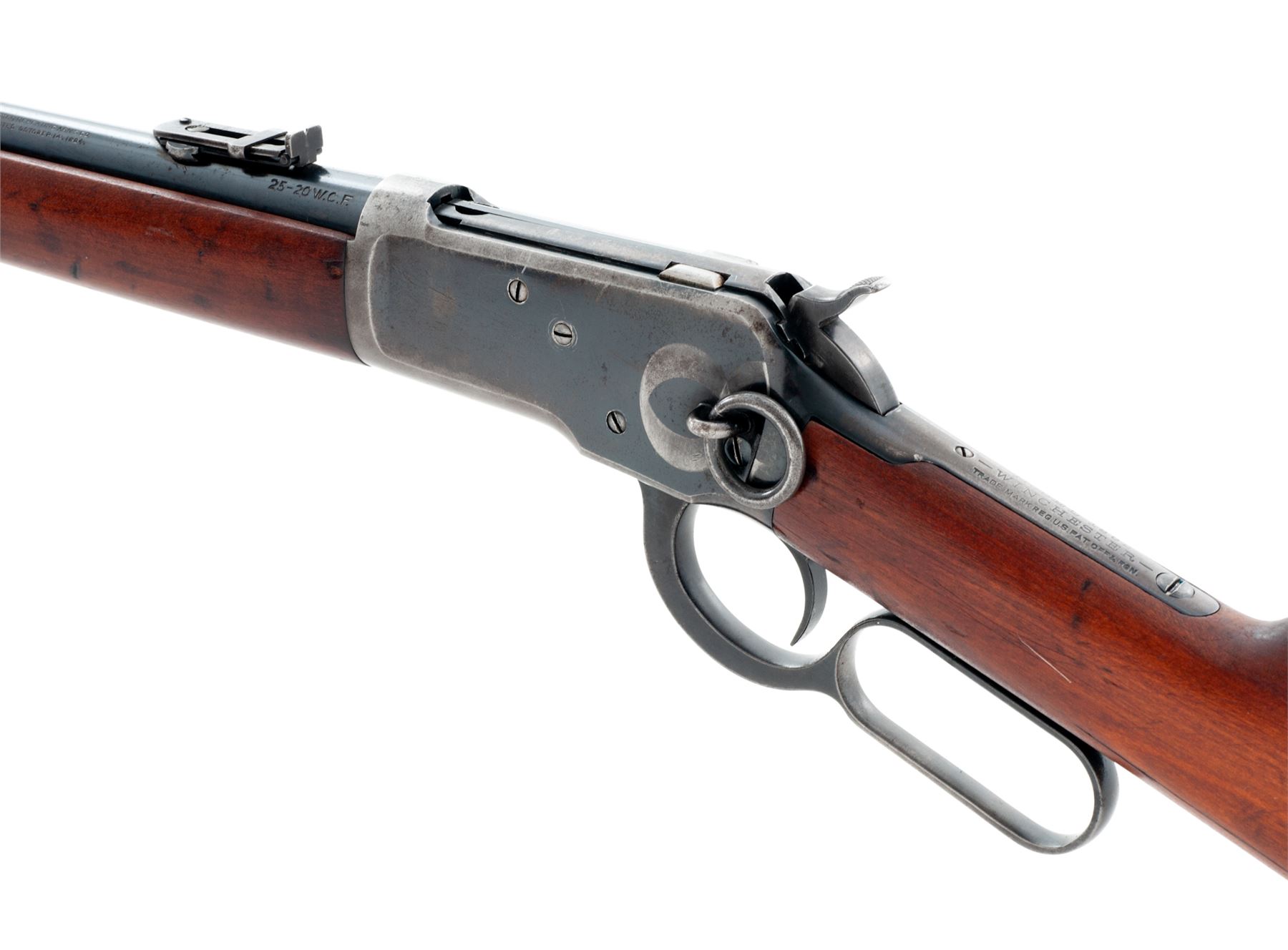 Winchester Model 1892 Lever Action Saddle Ring Carbine, #852564, .25-20 cal., 20'' barrel, blue finish, gumwood stock and forend. Mfg'd 1917. Condition is fine. Barrel and mag tube with approx. 85% thinning and toning blue; frame with approx. 70% thinning and toning blue. Gumwood stocks with moderate bruising and fissure emanating from rear portion of frame right side, terminating at lower tang. Good action and bore. Est.: $600-$800. (C&R)