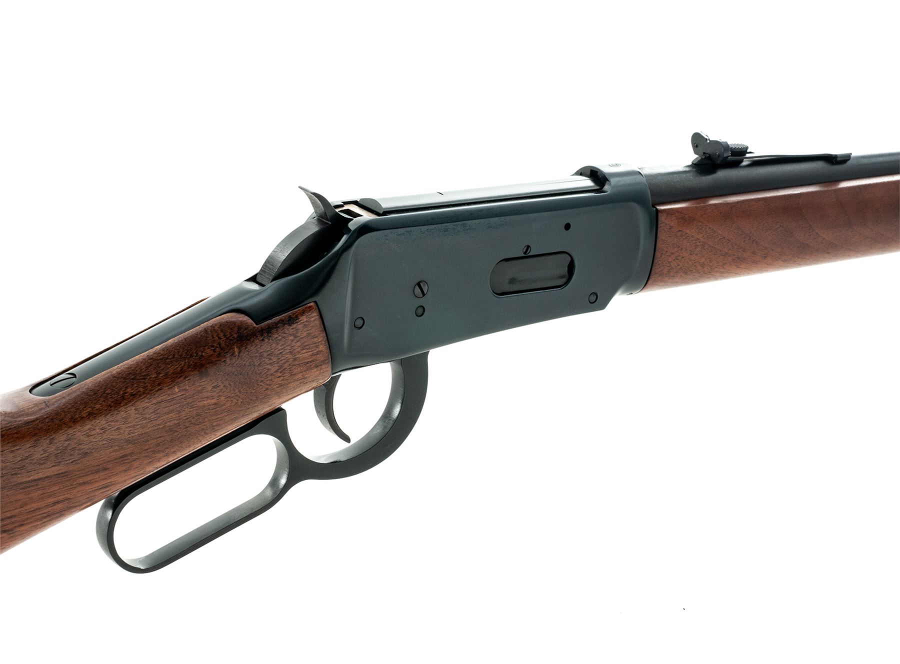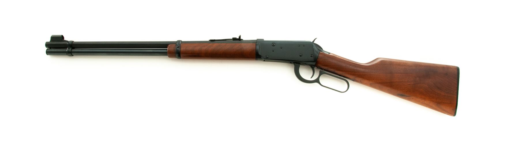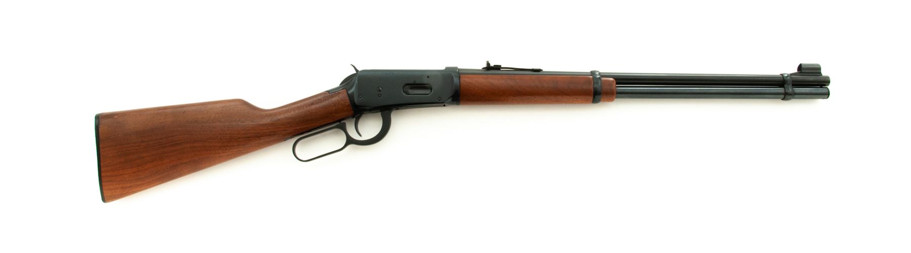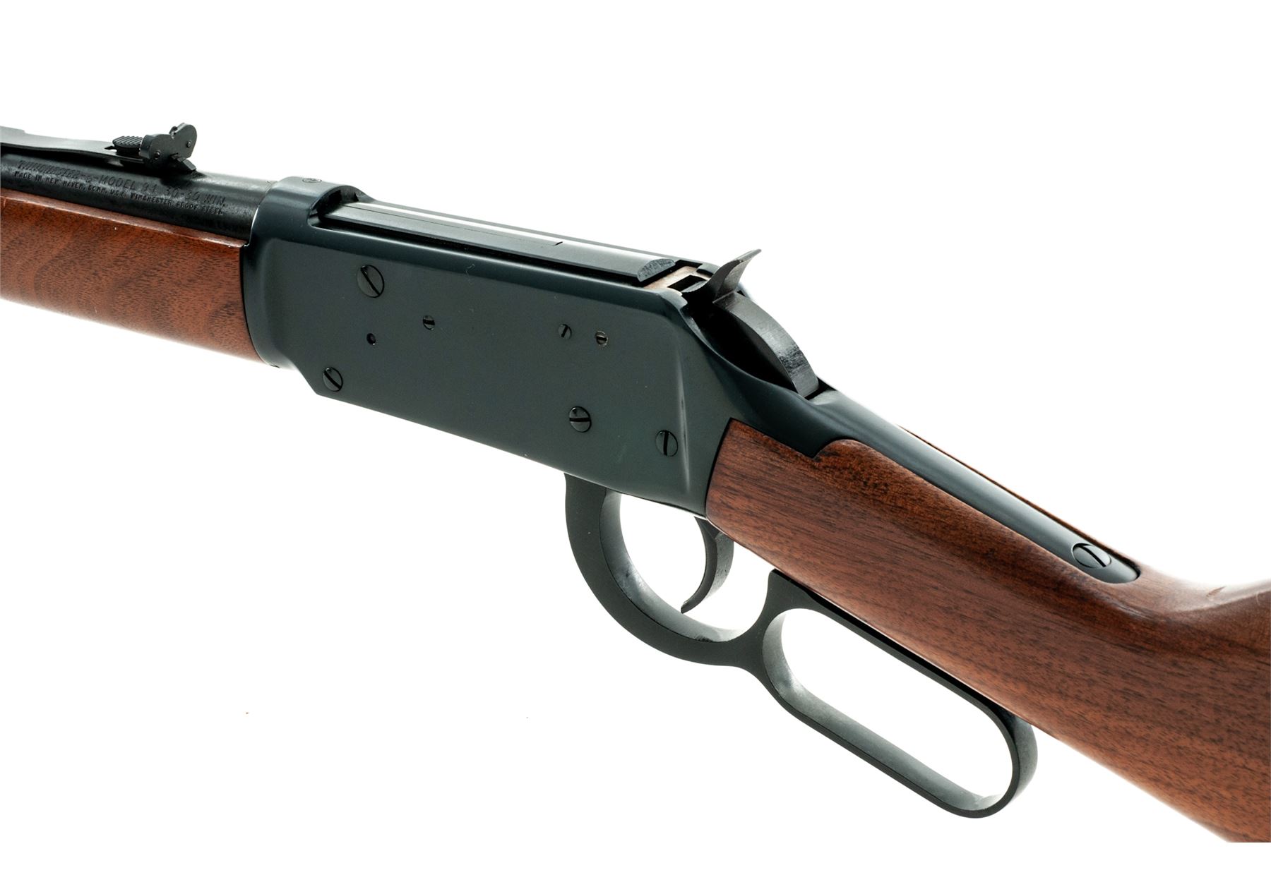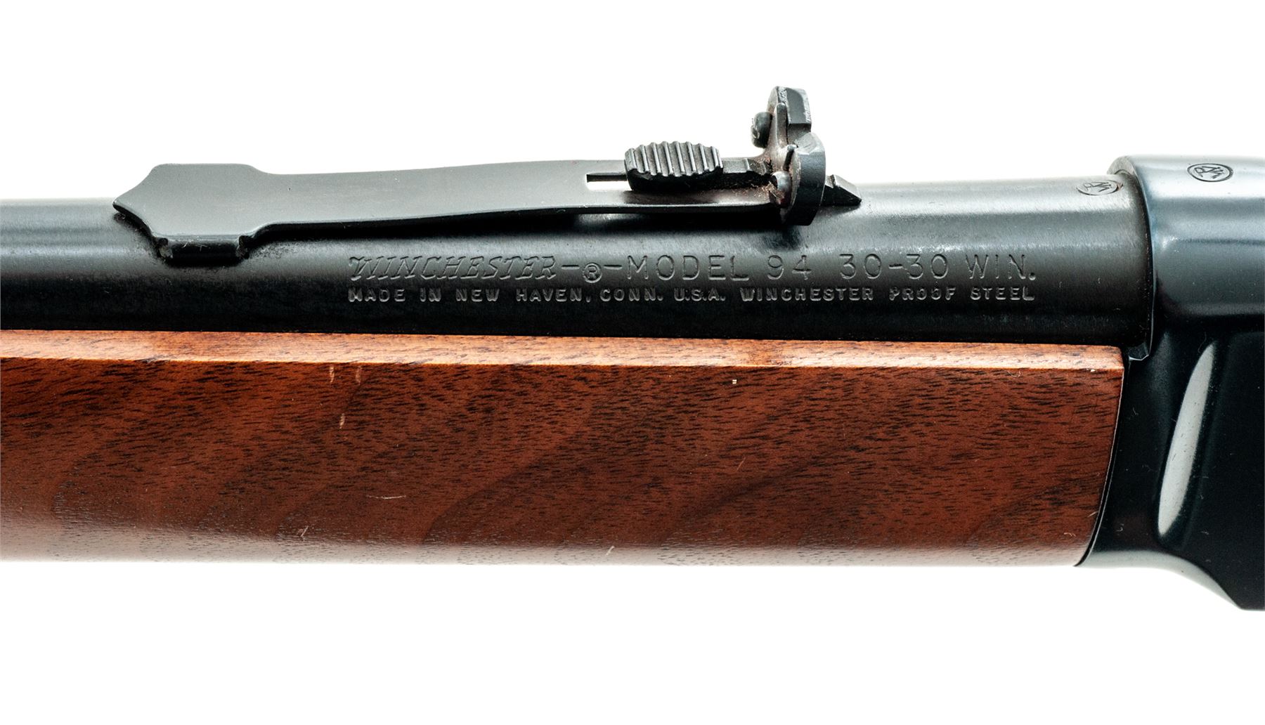 Winchester Model 94 Lever Action Repeating Carbine, #4117891, .30-30 Win. CF cal., blued 20'' round barrel with hooded Beach-type front and adjustable buckhorn sporting rear sights is marked on left side at breech, ''Winchester Model 94 30-30 Win.'' over New Haven address and ''Winchester Proof Steel'' in two lines; blued full-length under-barrel cartridge magazine tube held by 2 blued barrel bands; blued receiver is marked with an oval ''W'' proofmark at breech; blued hammer and loop operating lever; varnished walnut forend and buttstock with checkered black plastic buttplate having ''Winchester/Repeating/Arms'' within a circular panel. Mfg'd 1975. Condition is excellent, nearly new, with blued areas retaining approx. 98% original blue. Stocks are smooth with pleasing grain and color with minor handling marks to bottom edge of butt. Action is smooth and crisp; bore is brilliant with pronounced rifling. Est.: $400-$600. (Modern)