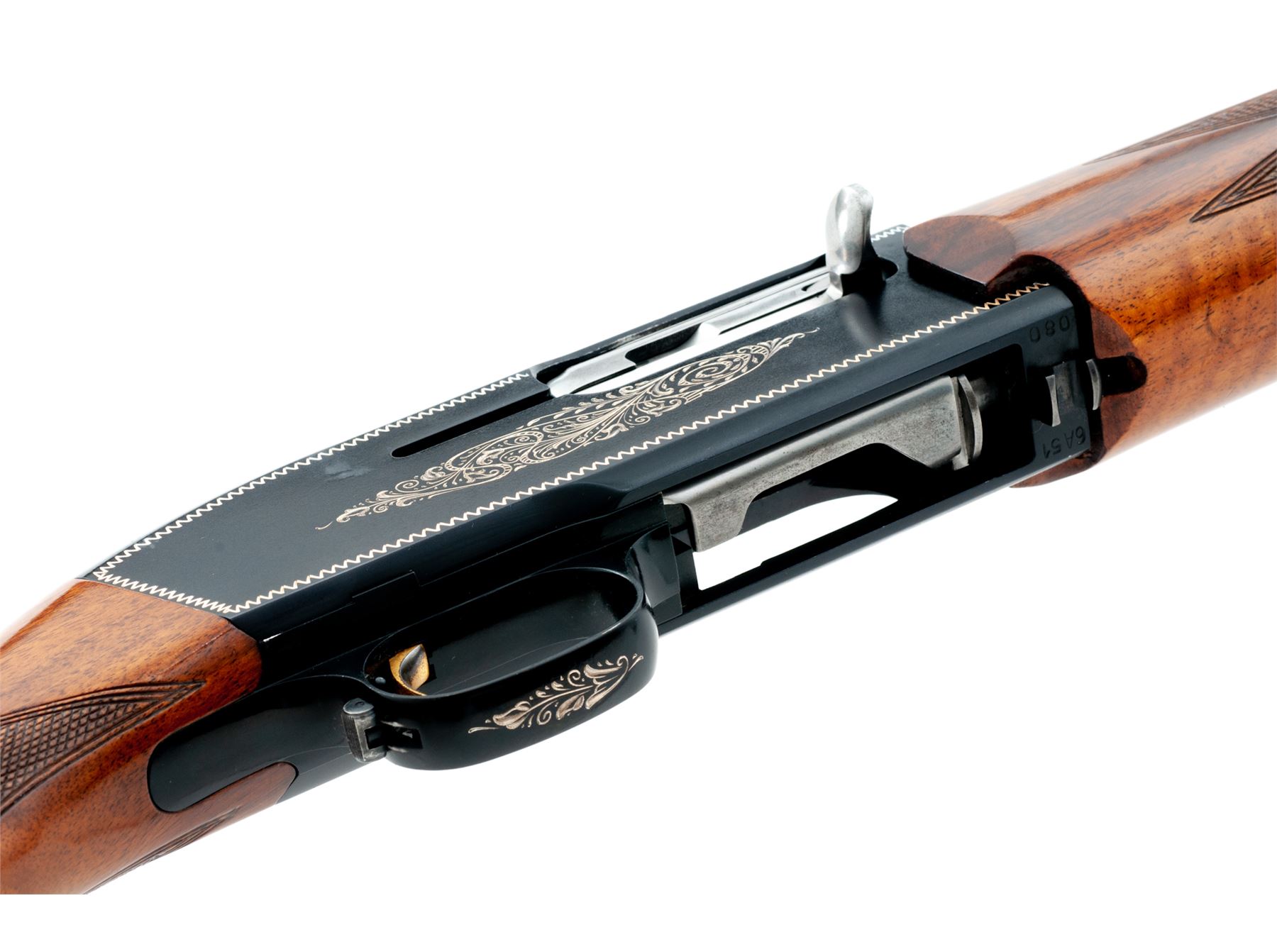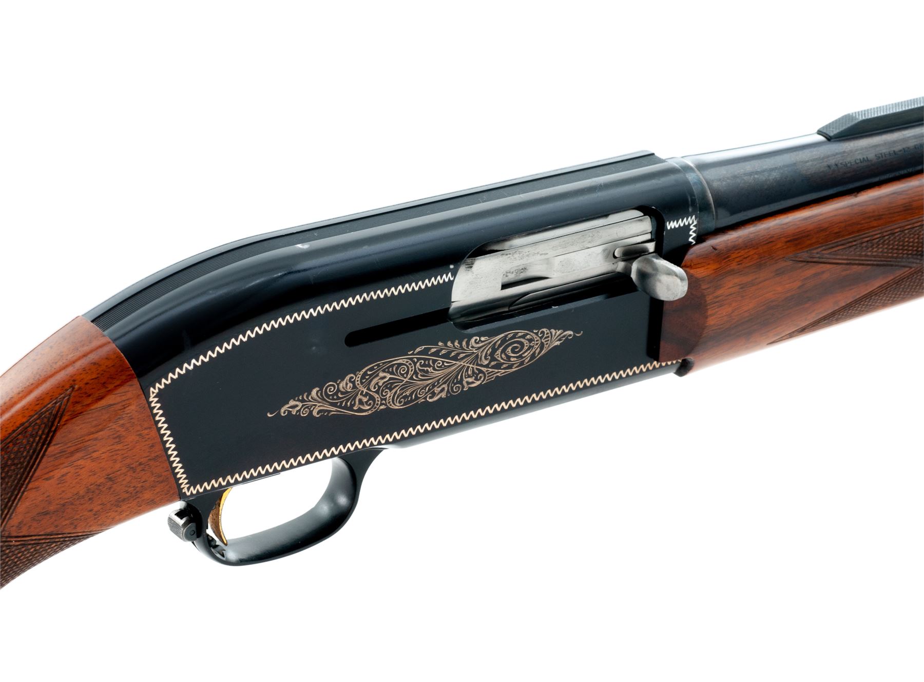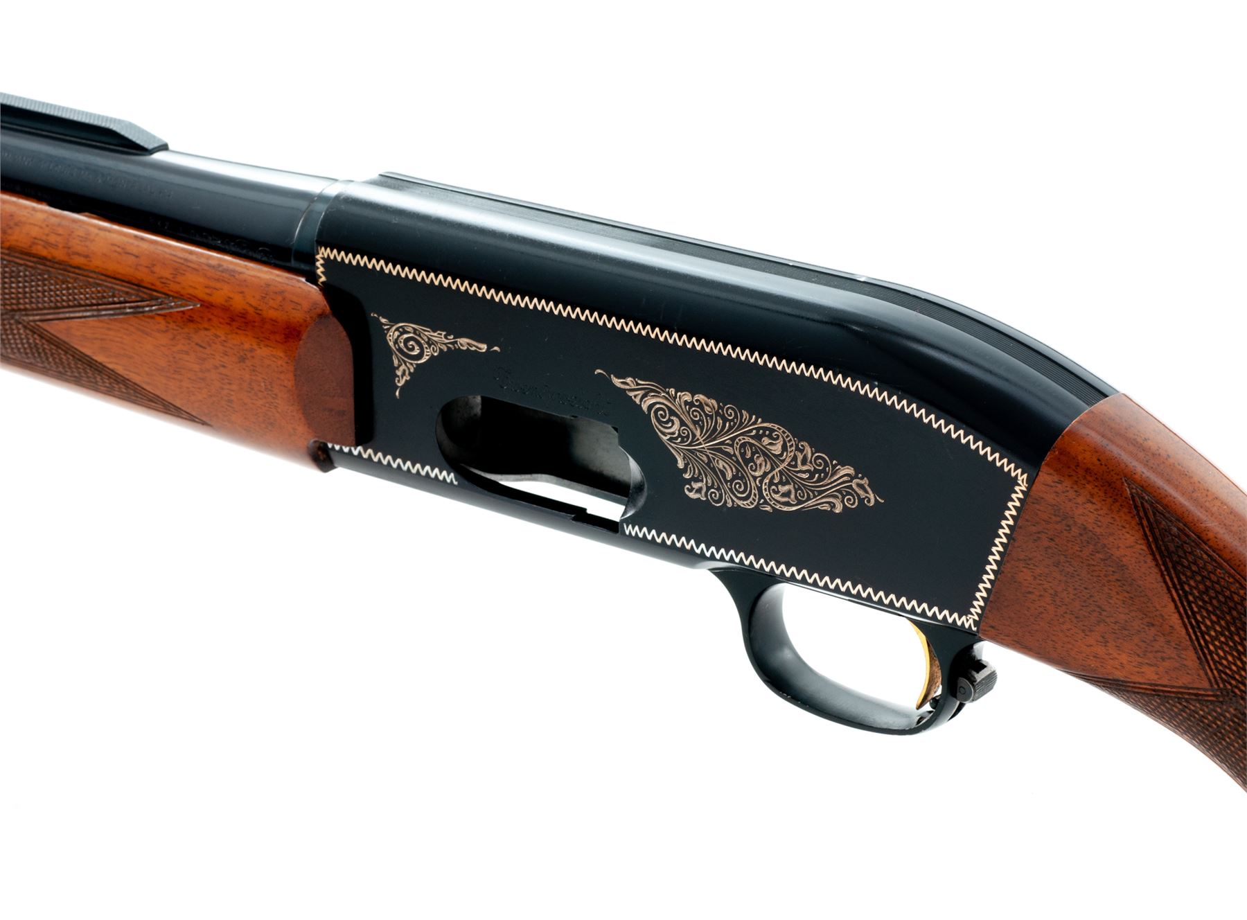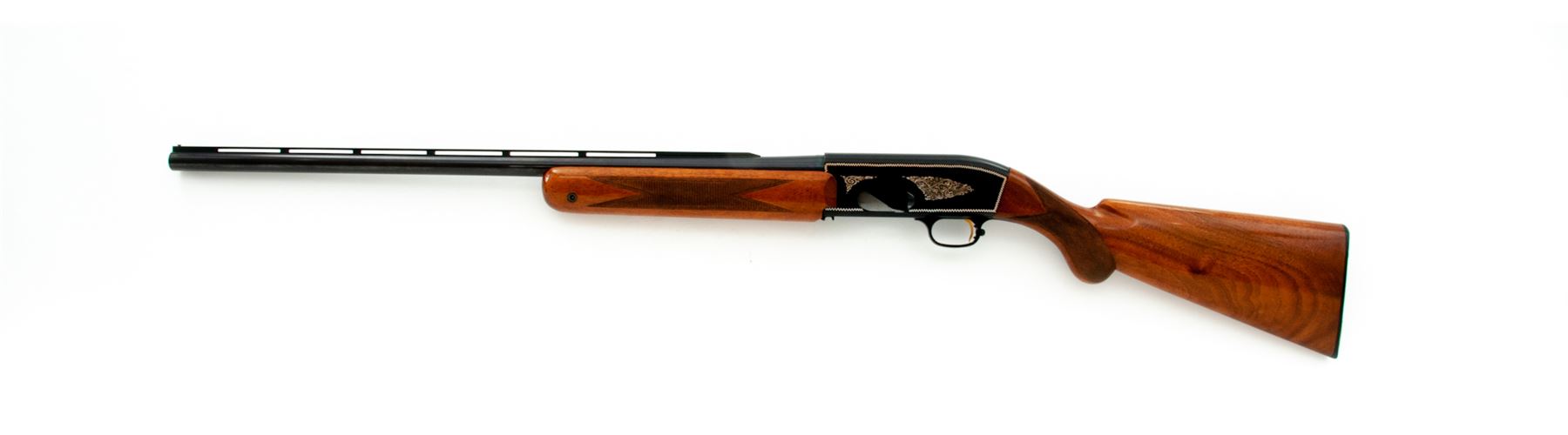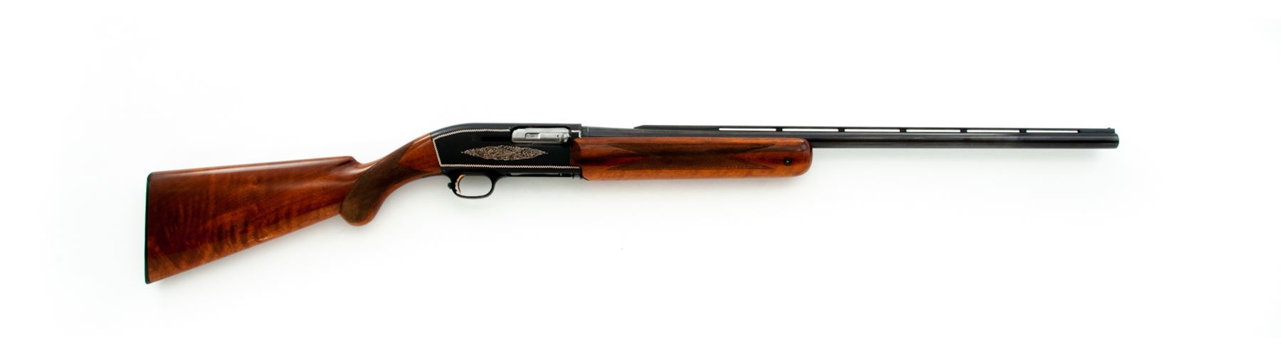 Browning Twentyweight Semi-Automatic Shotgun, #6A51080, 12 ga., 2-3/4'' chamber, 26'' vent rib barrel choked Mod., blue and anodized finish, border and scroll engraving to sideplates, checkered round-knob walnut stock and forend. Dating from the early 1960s. Condition is excellent retaining approx. 97% original finish, with some small blemishes to top of receiver, actioning area of barrel, and very light pressure dings and scratches to buttstock area. Good action, bright bore. Est.: $450-$650. (C&R)
