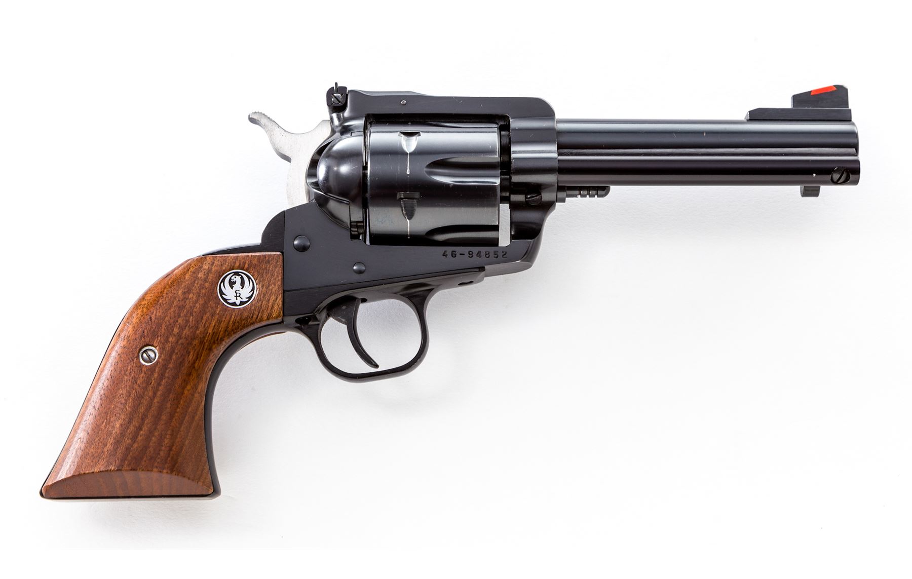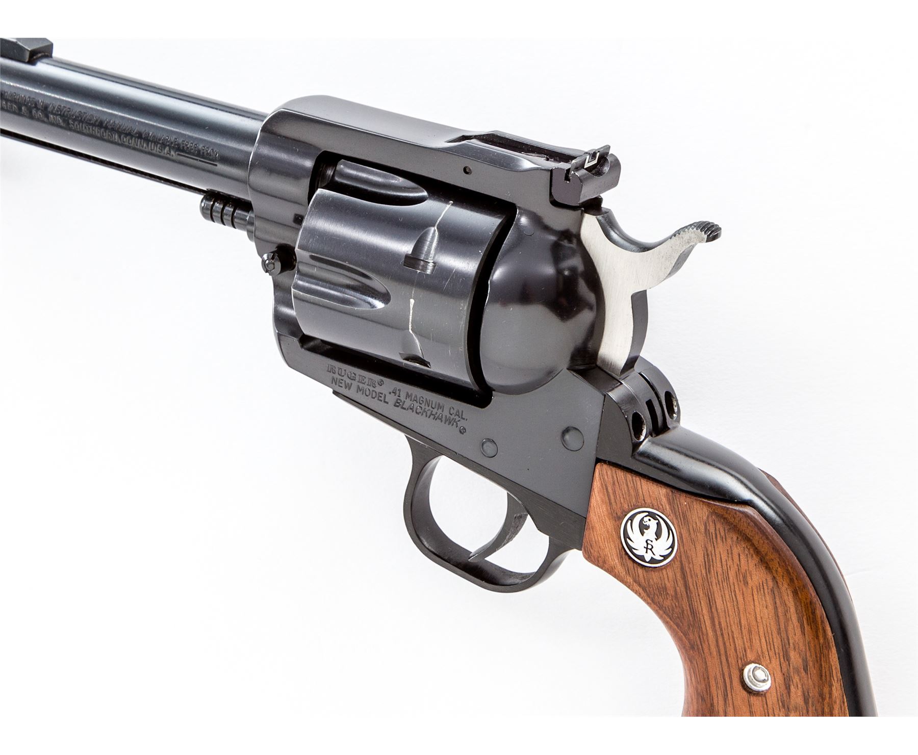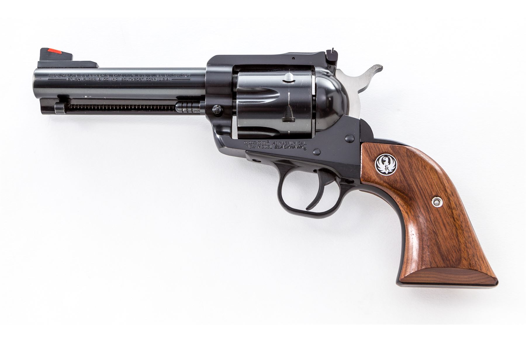 Ruger New Model Blackhawk Single Action Revolver, #46-94852, .41 mag. cal., 4-1/2'' barrel, blue finish, smooth walnut grips with Ruger medallions, white outline rear and red ramp front sight. Condition is excellent showing only light wear in actioning areas and at muzzle. Cylinder with light index mark. Action is crisp, bore is bright. Est.: $500-$750. (Modern/PPT)