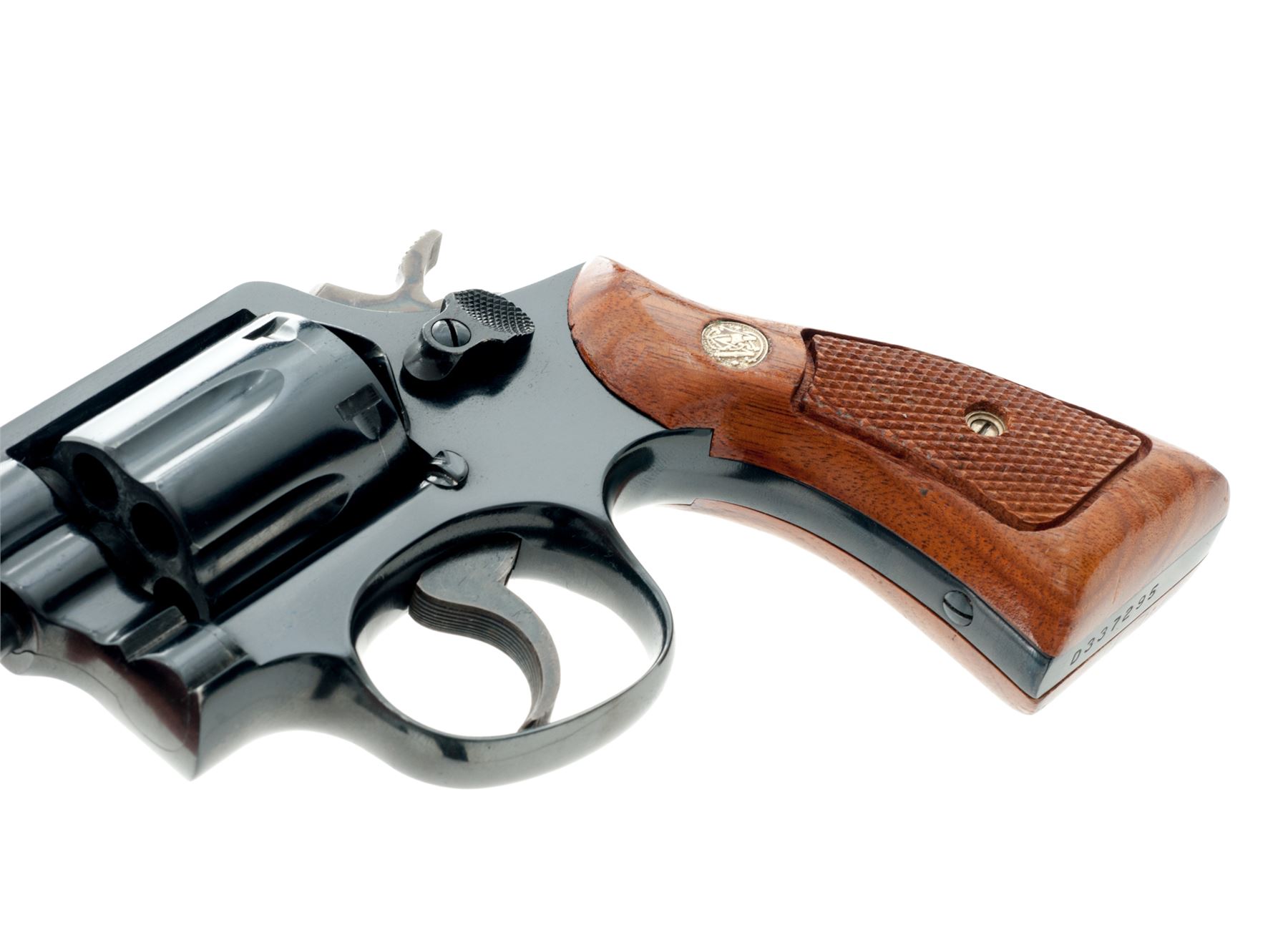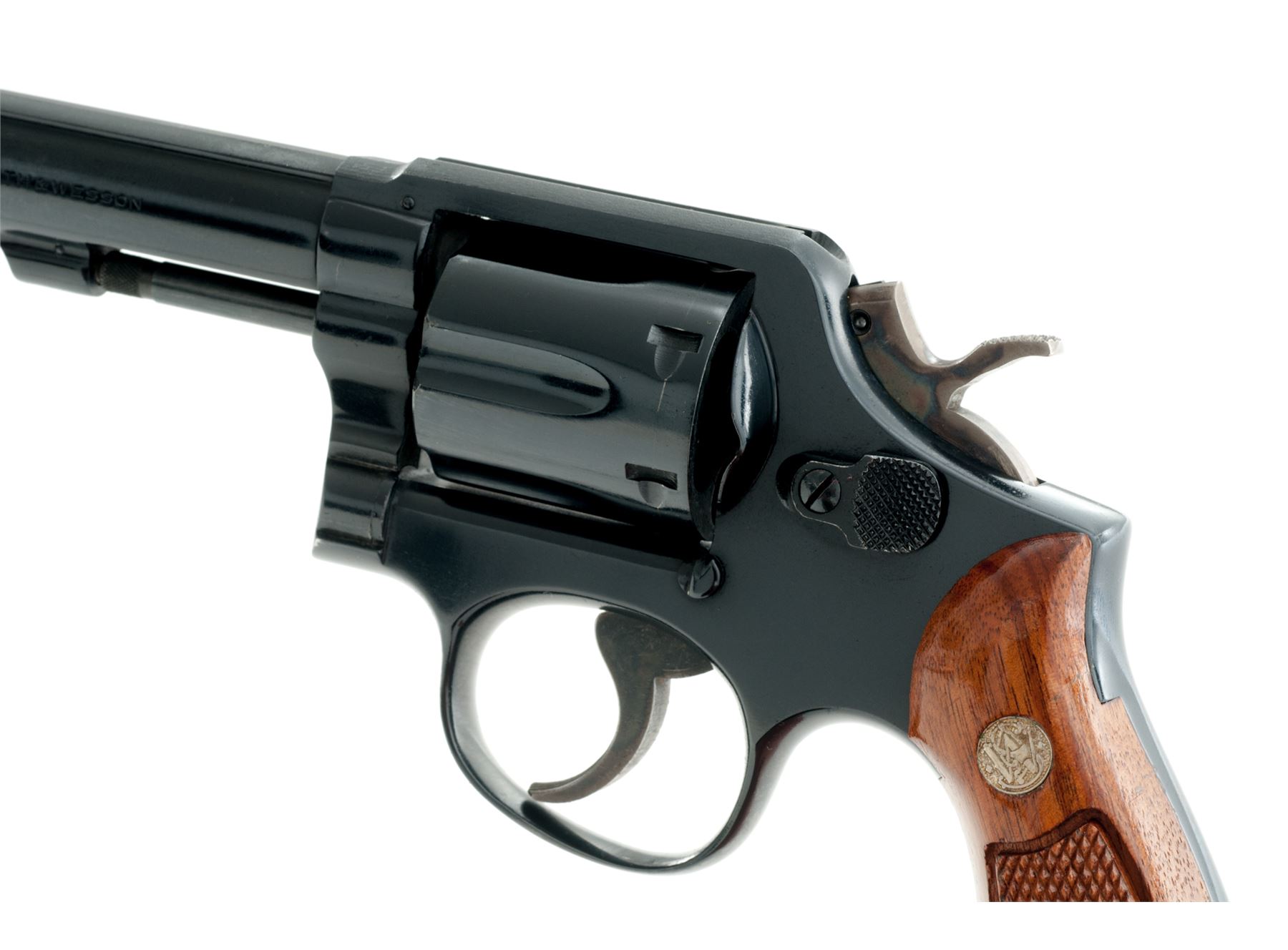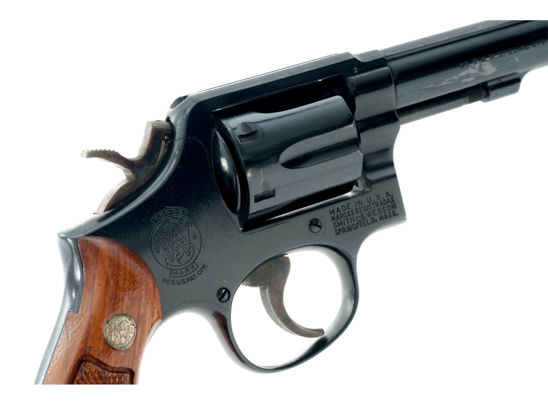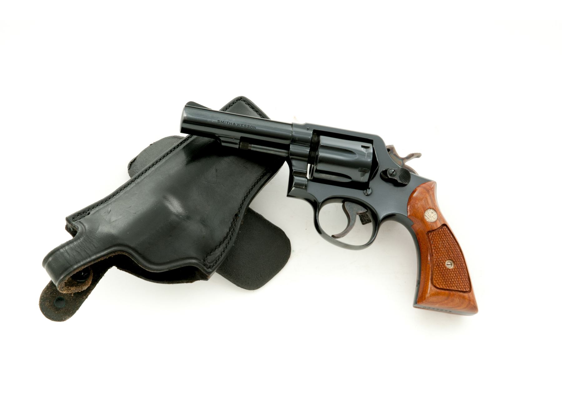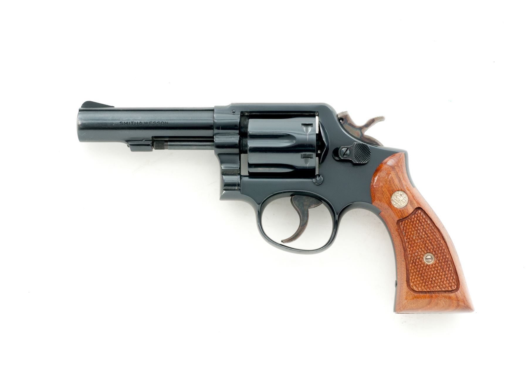 Smith & Wesson Model 10-6 Double Action Revolver, #D337295, .38 Spec. cal., 4'' heavy barrel, blue finish, factory checkered walnut grips with S&W medallions; grips are numbered to the gun, standard fixed sights, with case hardened hammer and trigger. Mfg'd circa 1971-1972. Included is a right-hand black leather Safariland holster. Approx. 97% factory polished blue finish remains and metal surfaces rate as near excellent overall. Muzzle wear accounts for most of the finish loss, metal with scattered slight scratches and small handling marks. Cylinder with a thin index line. Hammer and trigger with approx. 97% case colors. Factory lettering is clear and defined. Right grip rates very good and shows normal light to moderate wear; left grip with finish loss along the bottom edge, as well as scattered handling marks and a more noticeable impression towards the top edge, both with only a little wear to the checkering. Smooth crisp action with an excellent bore. Holster shows normal light carry wear. Est.: $350-$550. (Modern/PPT)