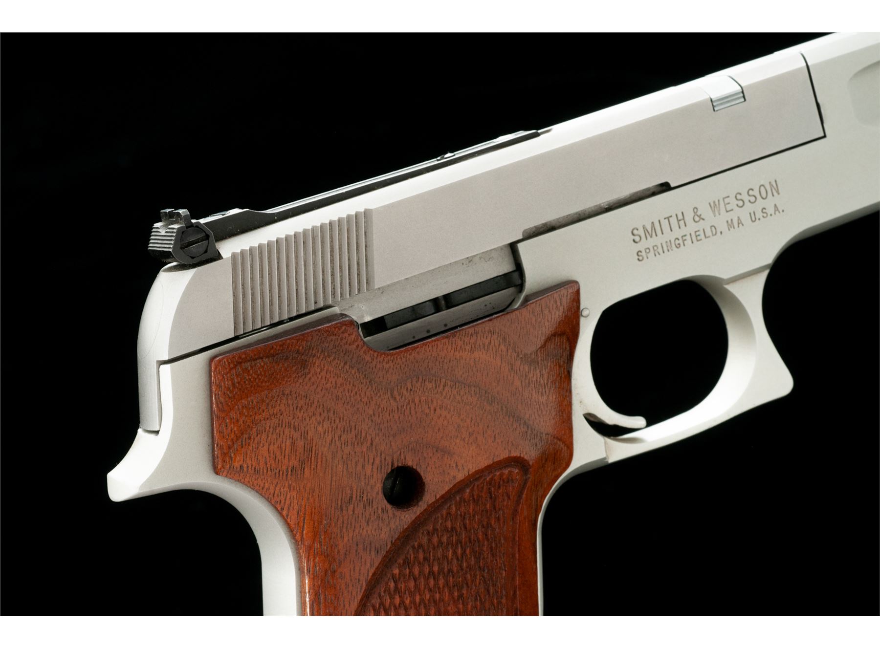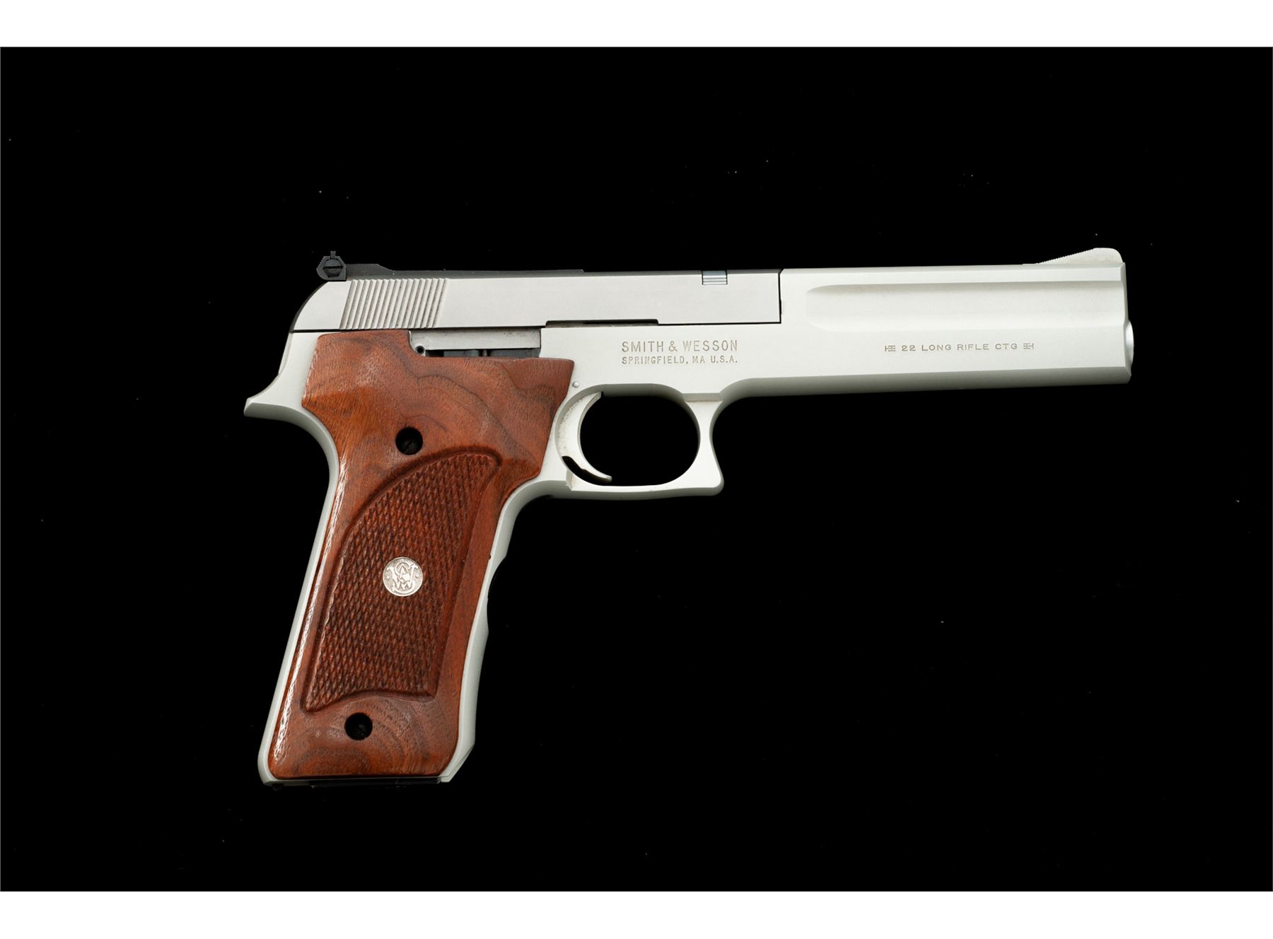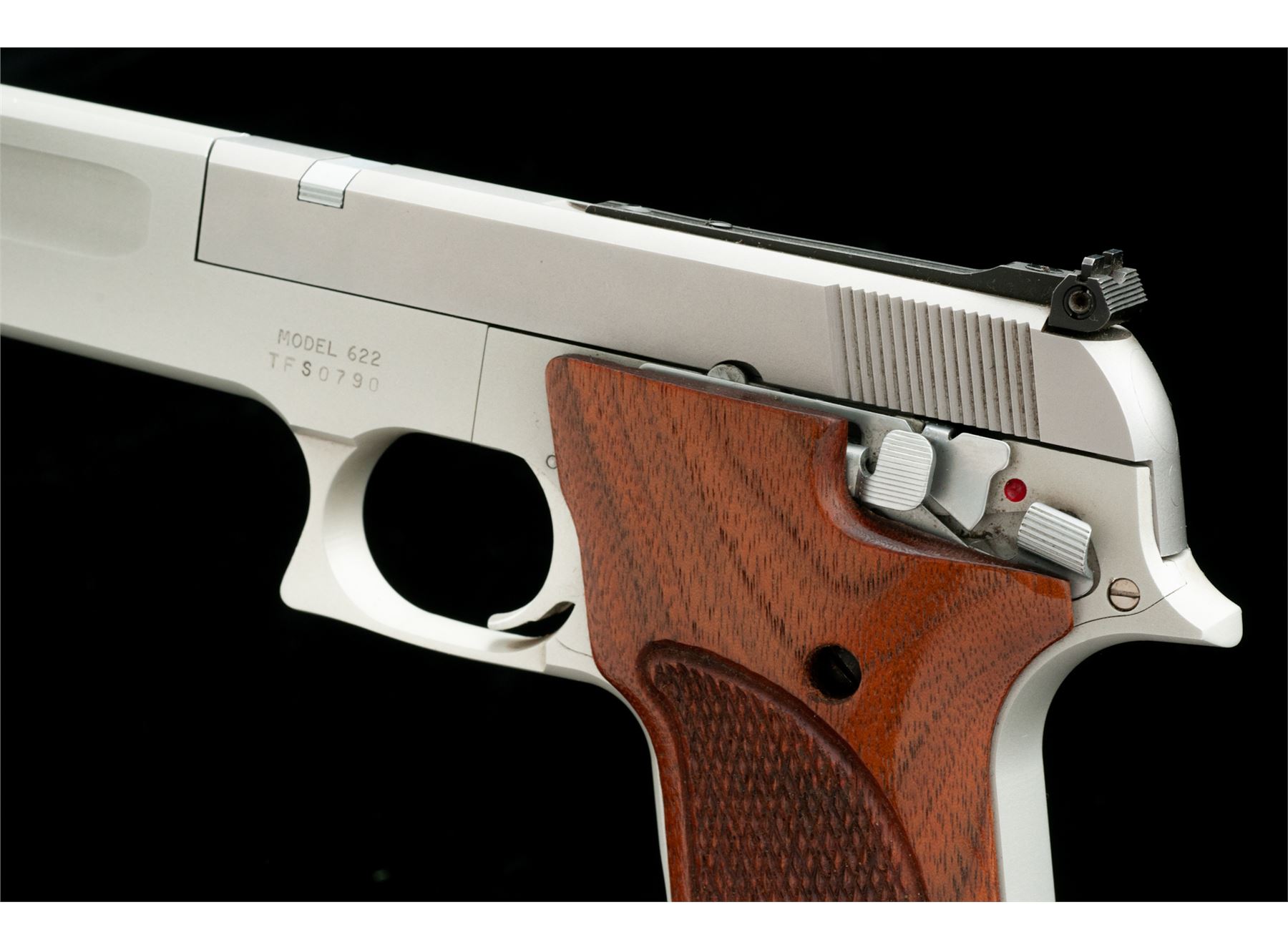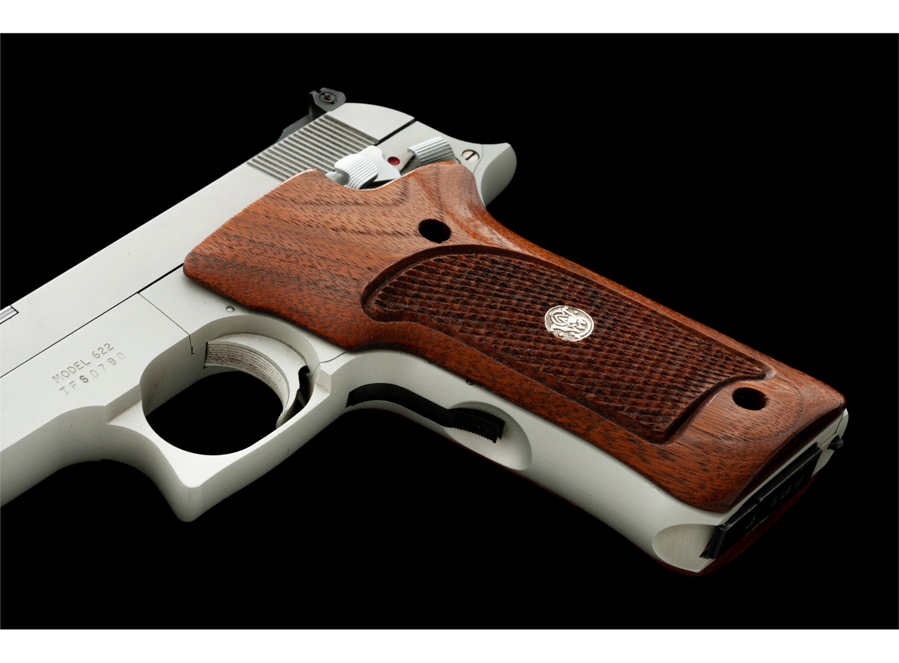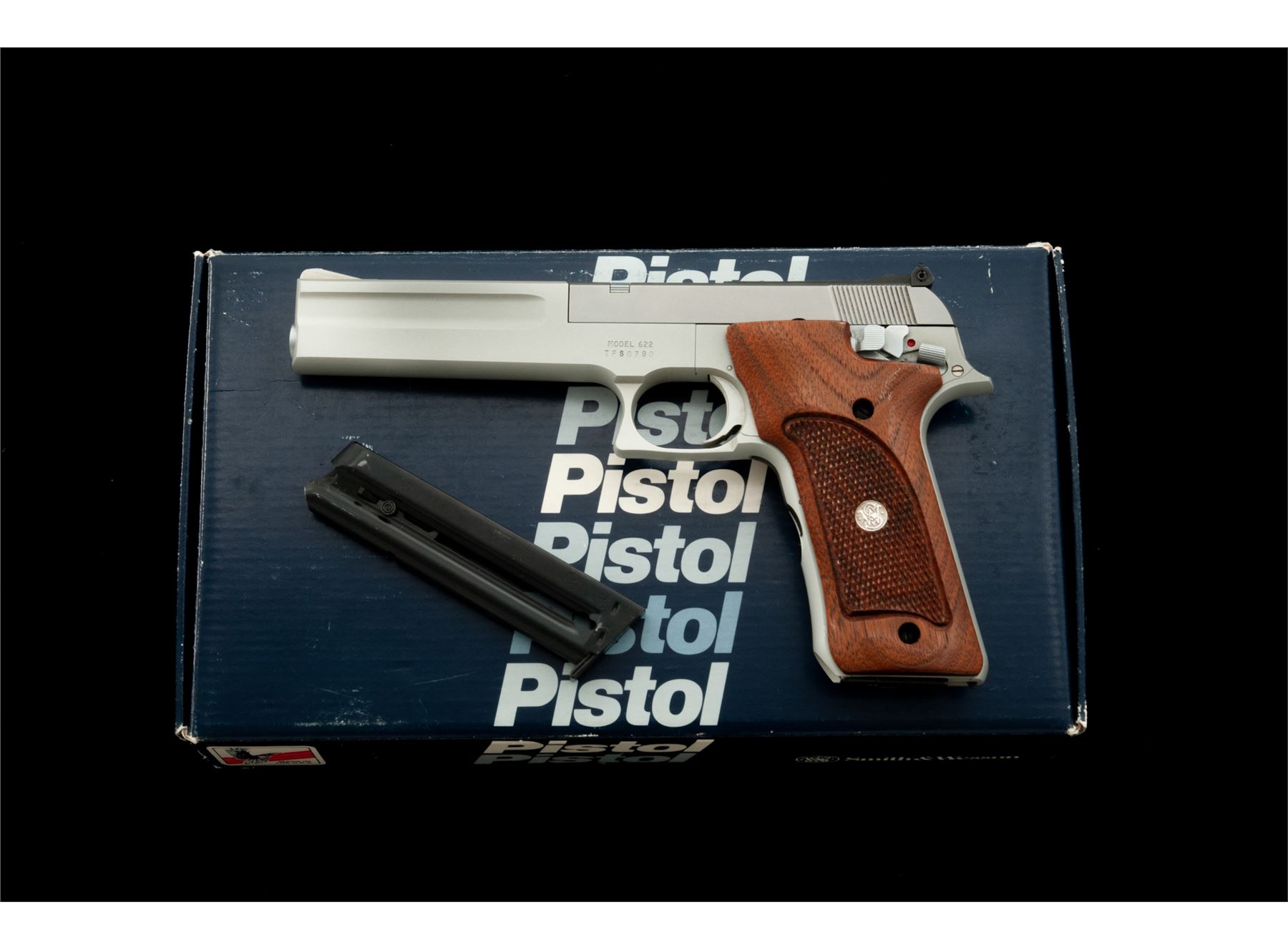 Smith & Wesson Model 622 Target Semi-Automatic Pistol, #TFS0790, .22 LR cal., 6'' barrel, matte stainless slide, alloy frame, factory checkered walnut grips with silver S&W medallions, fixed ramped front sight, rear sight is adjustable for both windage and elevation, with two (2) blued steel S&W magazines. In original one-piece box with matching end label, owner's manual, and adjustment tool. Overall the condition is excellent. Right edge of frame that abuts the slide with a moderate shallow impression, otherwise the metal surfaces show only very minor marks from handling and storage. Factory lettering with crisp raised edges. Grips retain all of their original finish, checkering is sharp and clean, medallions are bright. Excellent action and mirror bright bore. Box is very good and shows signs of light storage type wear, end label is clear. Est.: $300-$500. (Modern/PPT)
