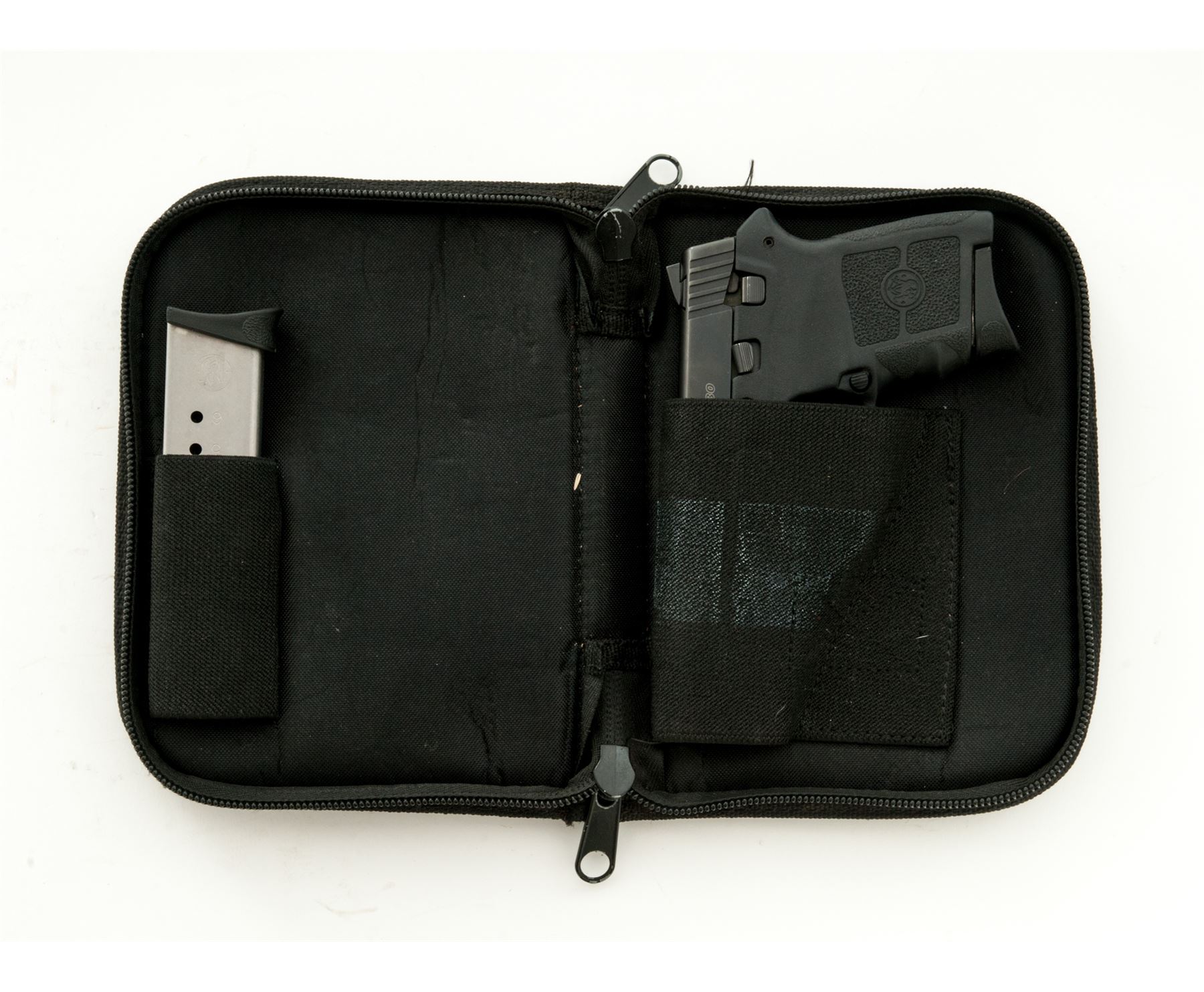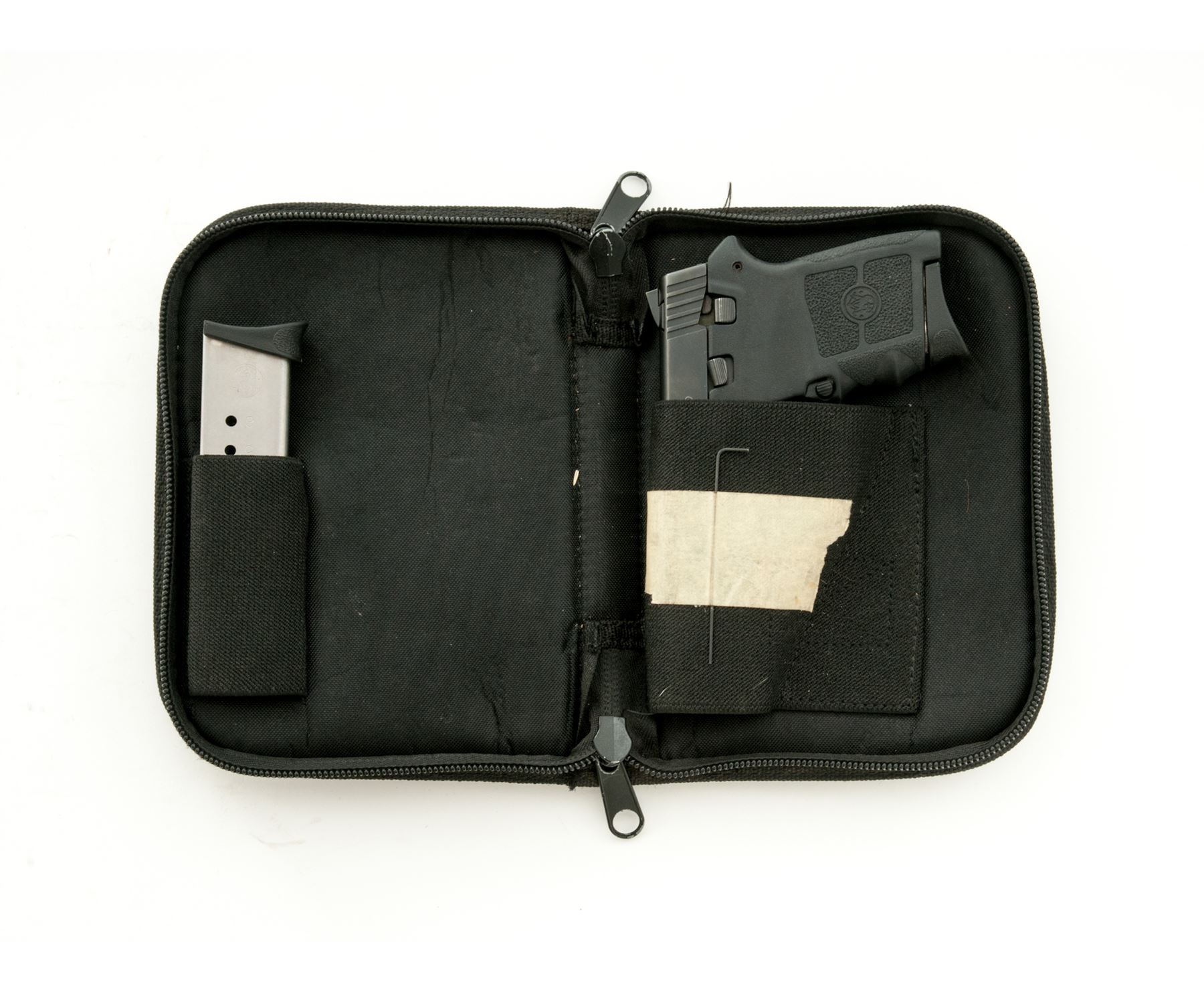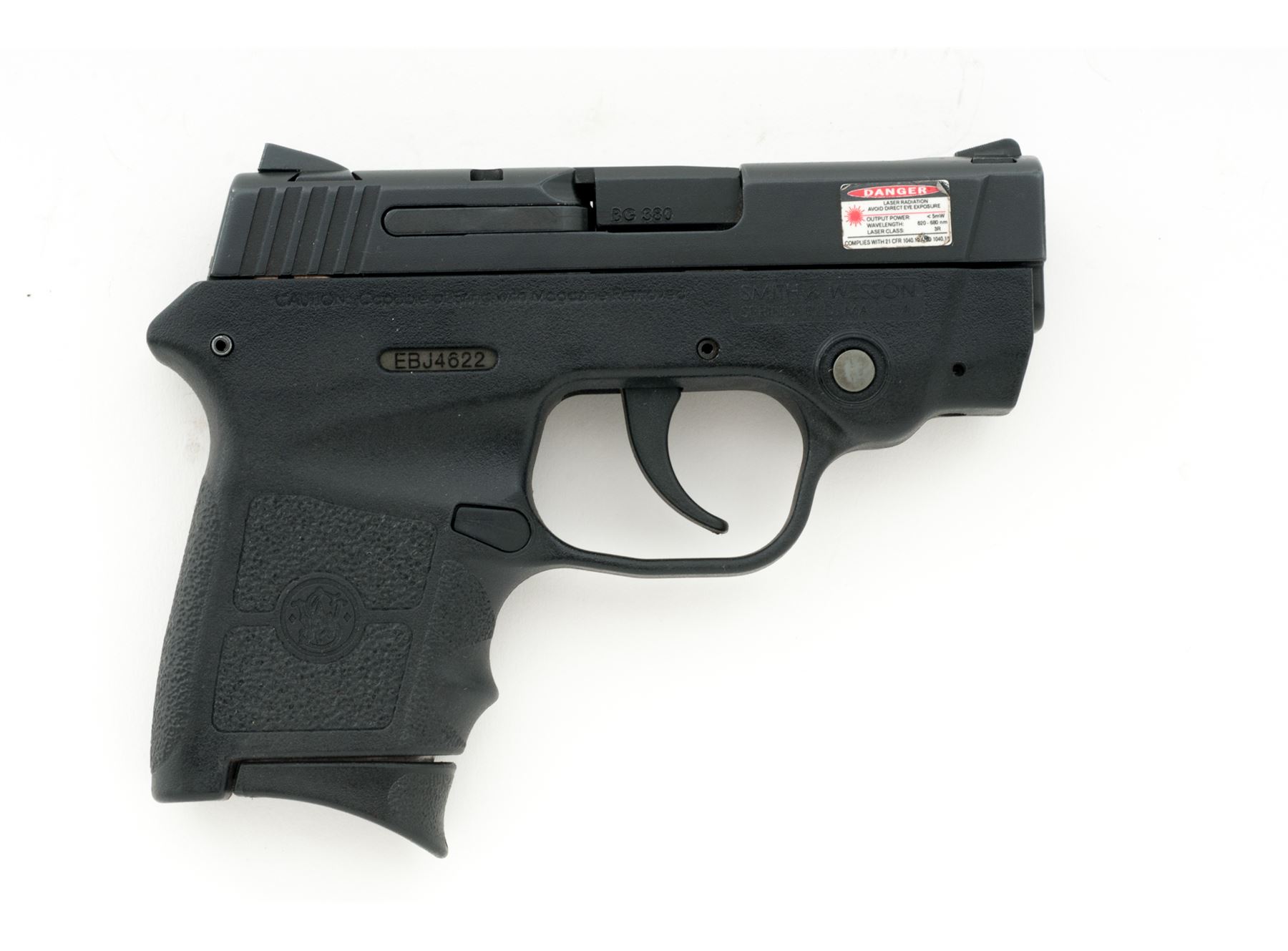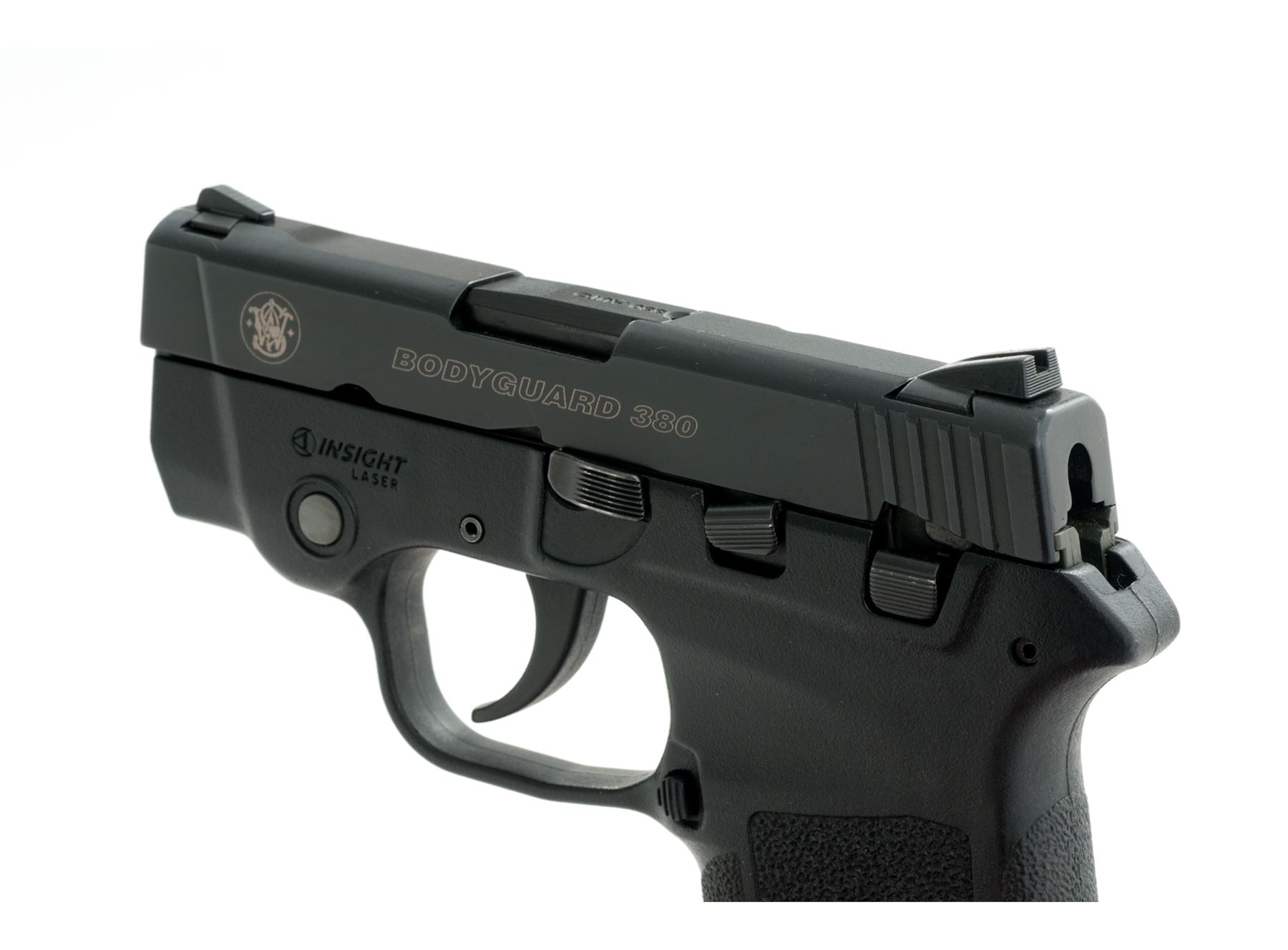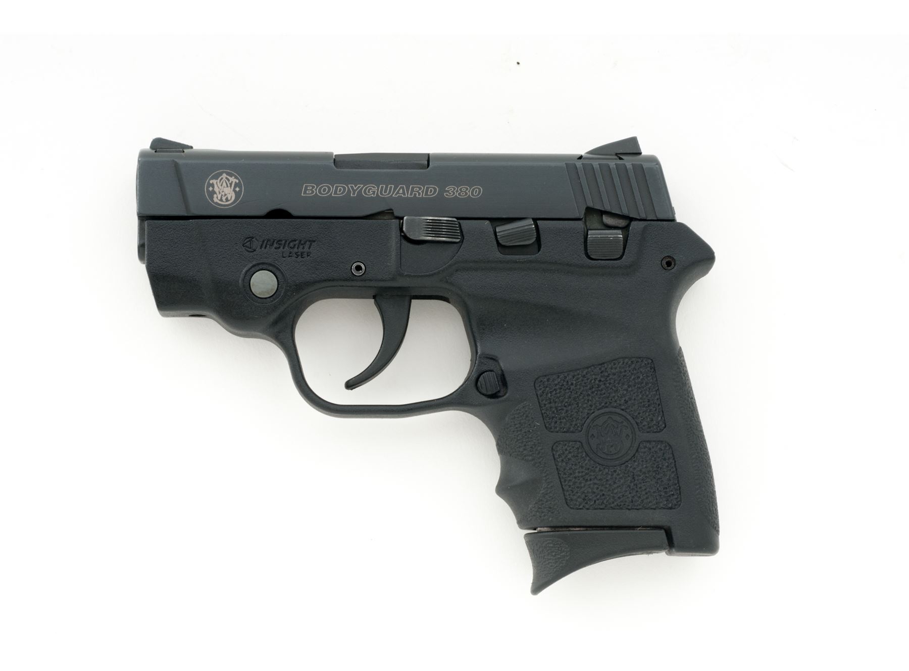 Smith & Wesson M&P Bodyguard .380 Semi-Automatic Pistol, #EBJ4622, double action, .380 ACP cal., 2.75'' barrel, black slide, black composite frame with built in Insight laser, and standard fixed sights. Included are two (2) 6-shot factory S&W magazines and padded black nylon Cordura S&W carry pouch. Condition is excellent with a few normal small handling marks. Smooth action, near excellent bore. Laser functions properly. Est.: $175-$275. (Modern)(Not available to Calif. residents.)