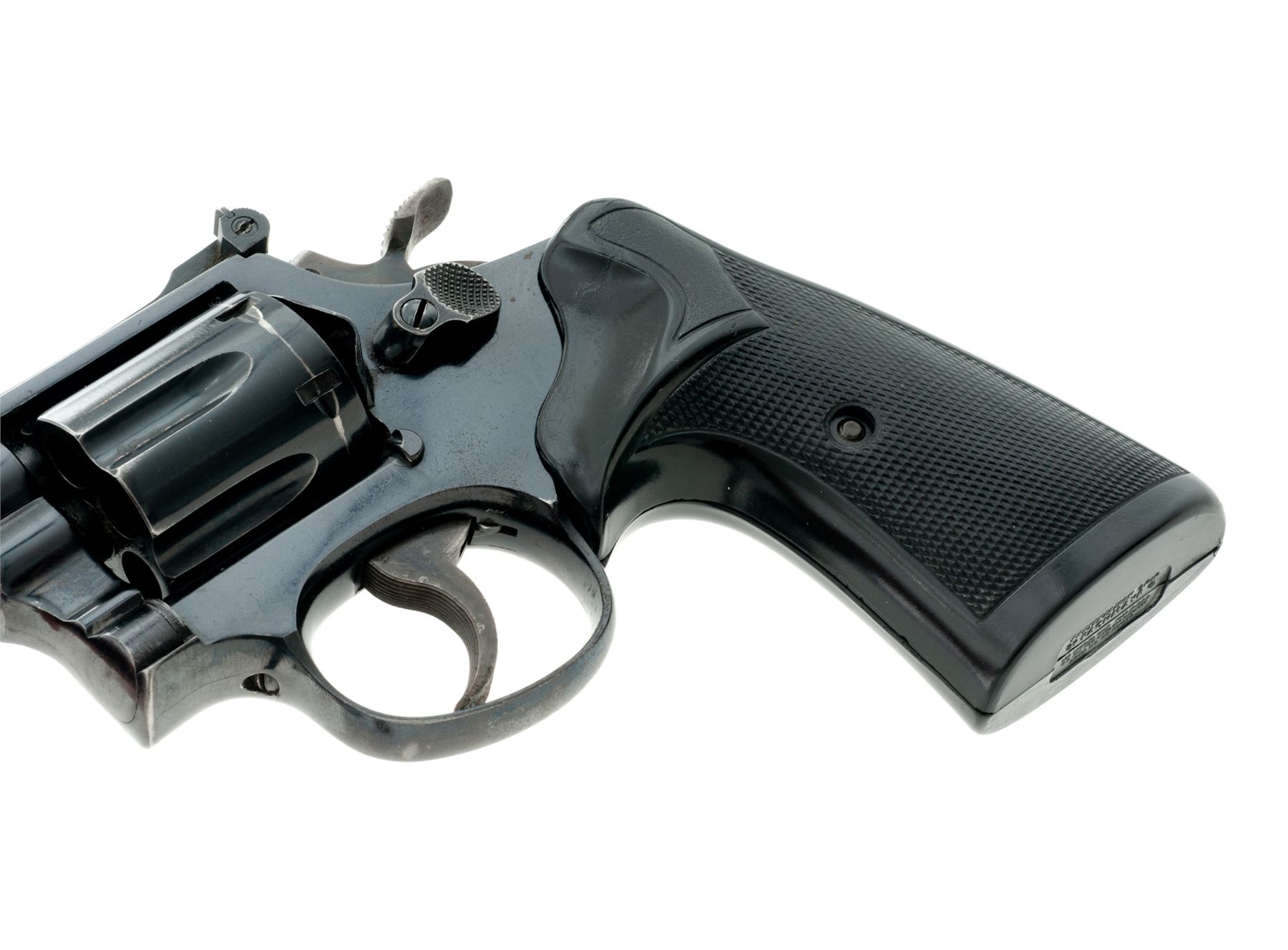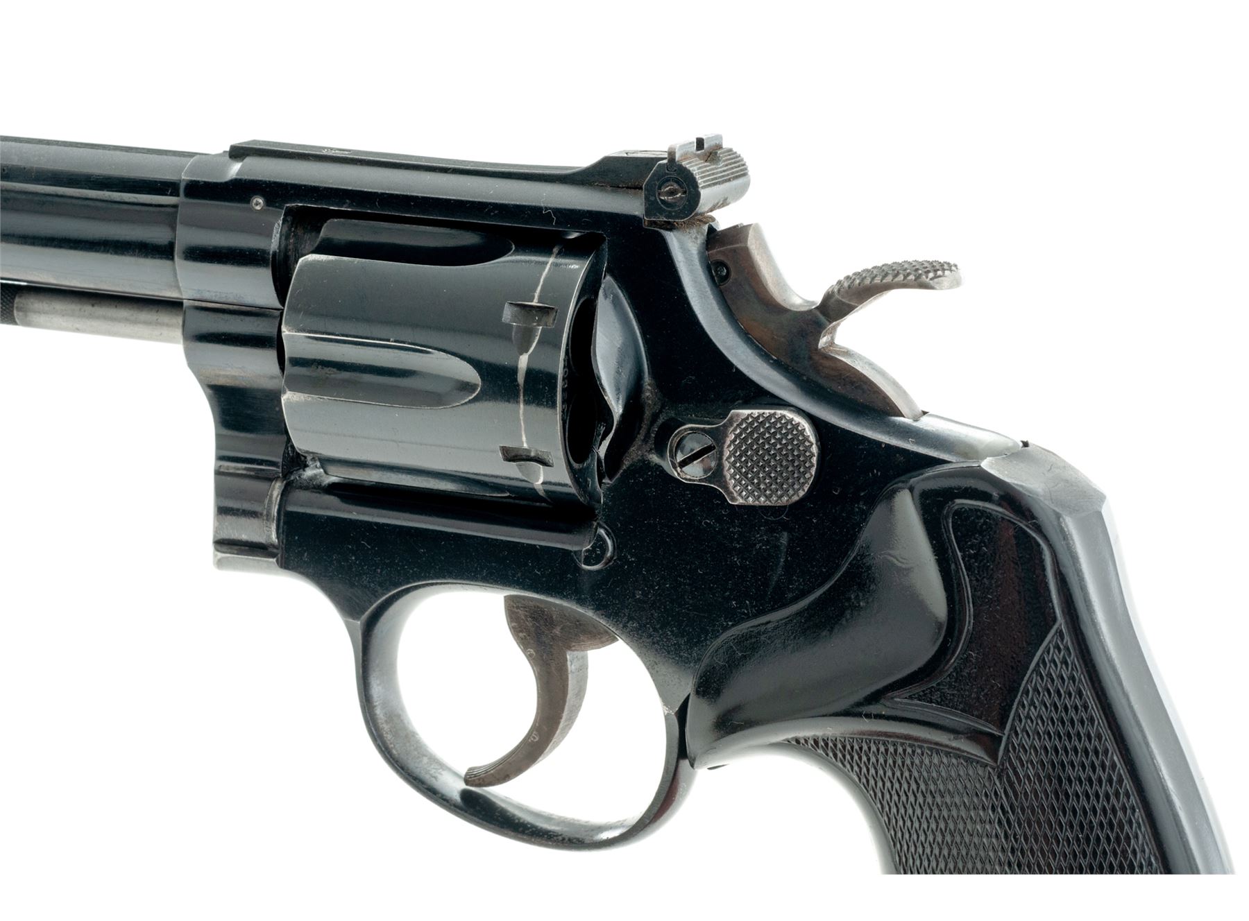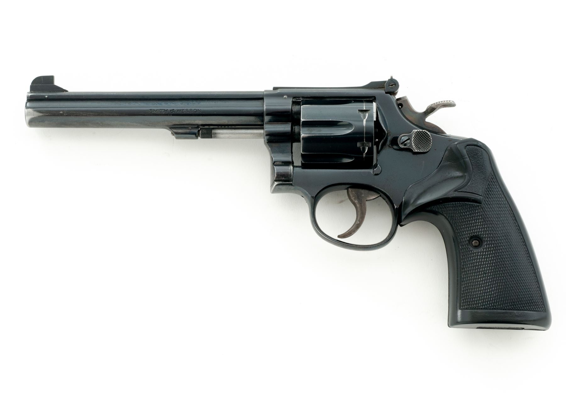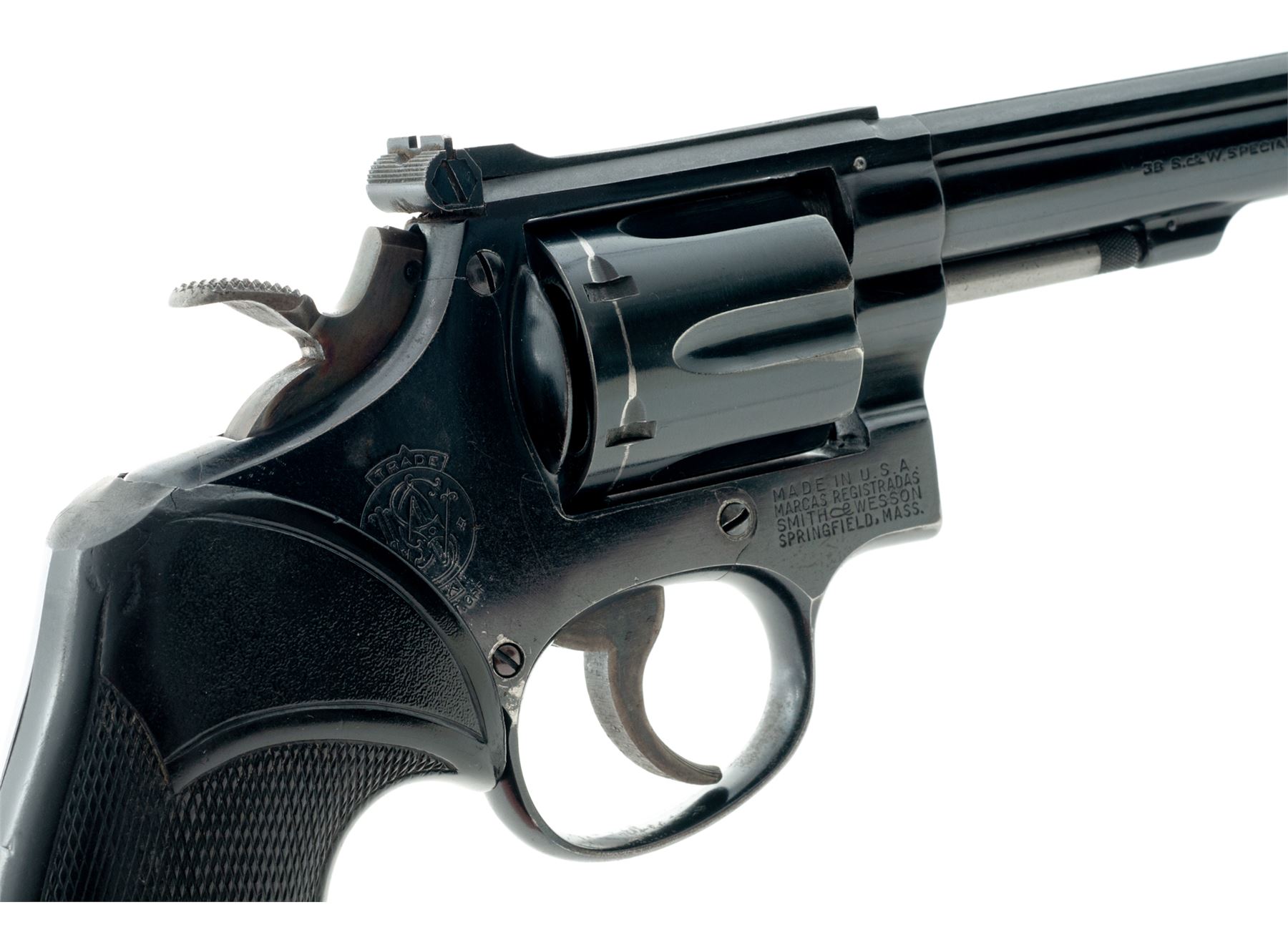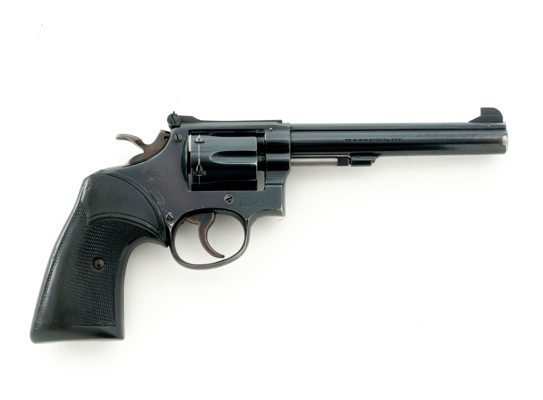 Smith & Wesson K-38 Target Masterpiece Pre-Model 14 Double Action Revolver, #K232604, .38 spec. cal., 6'' pinned barrel, blue finish, checkered black rubber Pachmayr Presentation grips, Patridge front sight, micrometer click adjustable rear sight, case-colored trigger, and wide target hammer. Mfg'd 1955. Condition is very good with approx. 85% original blue finish and 95%+ case colors. Metal with general light scratching and small marks from handling and range use; factory lettering is clear. Barrel, frame, cylinder, and cylinder star with matching numbers. Grips show age and wear consistent with the rest of the revolver; checkering has worn flat on parts of the right grip, bottom back corner with a small crack. Crisp action; bright and clean bore with near excellent rifling. What appears to be a solid shooter's grade revolver. Est.: $400-$600. (C&R/PPT)