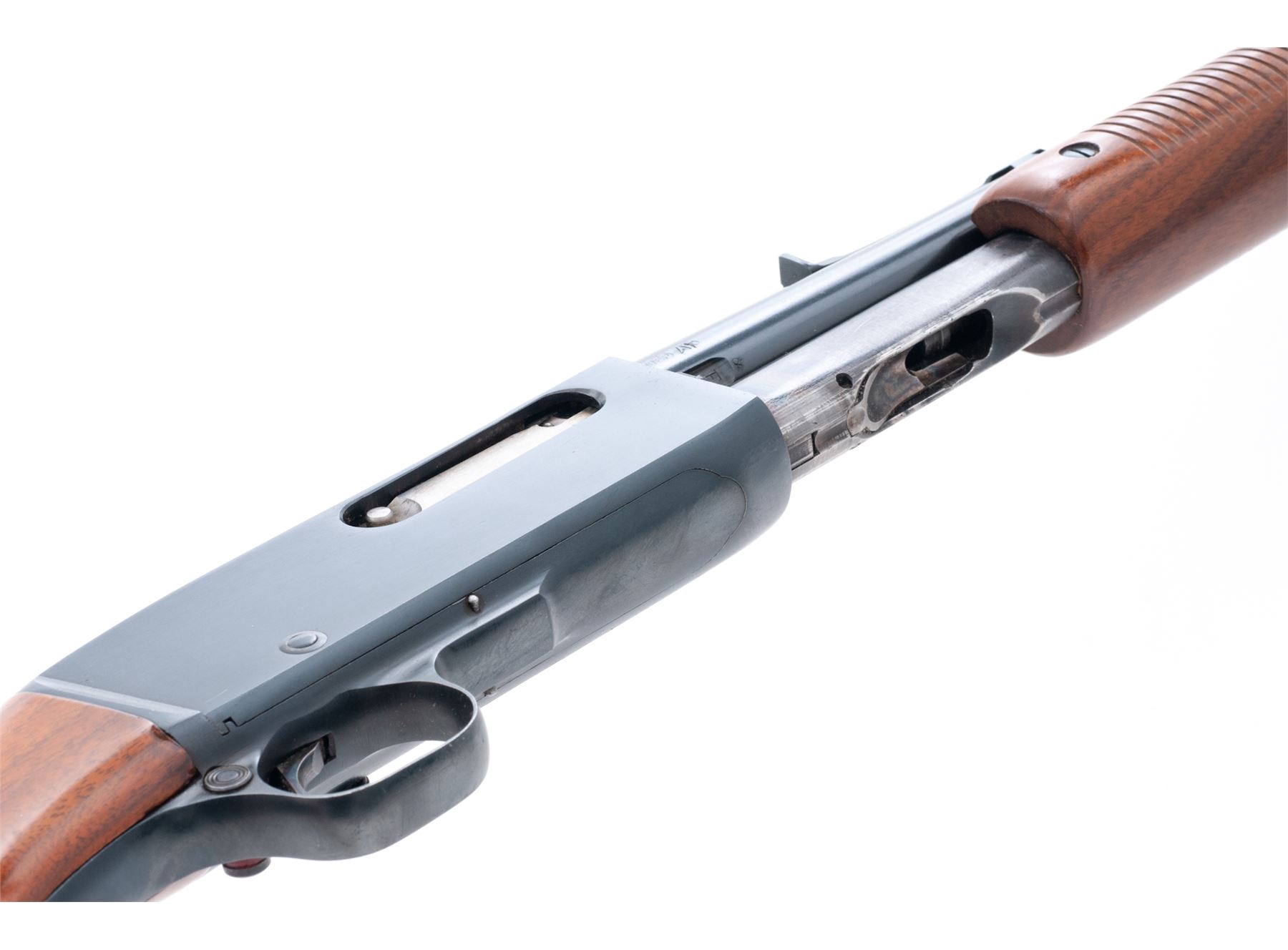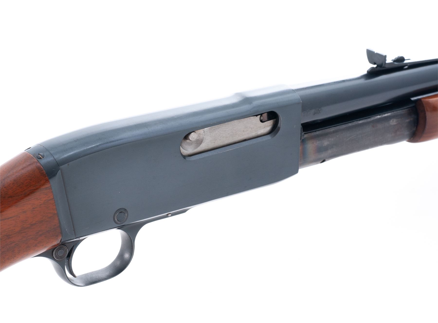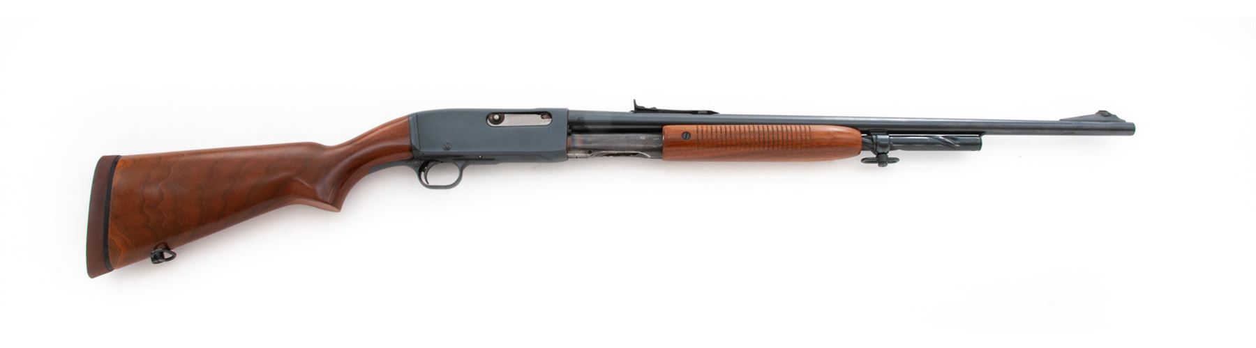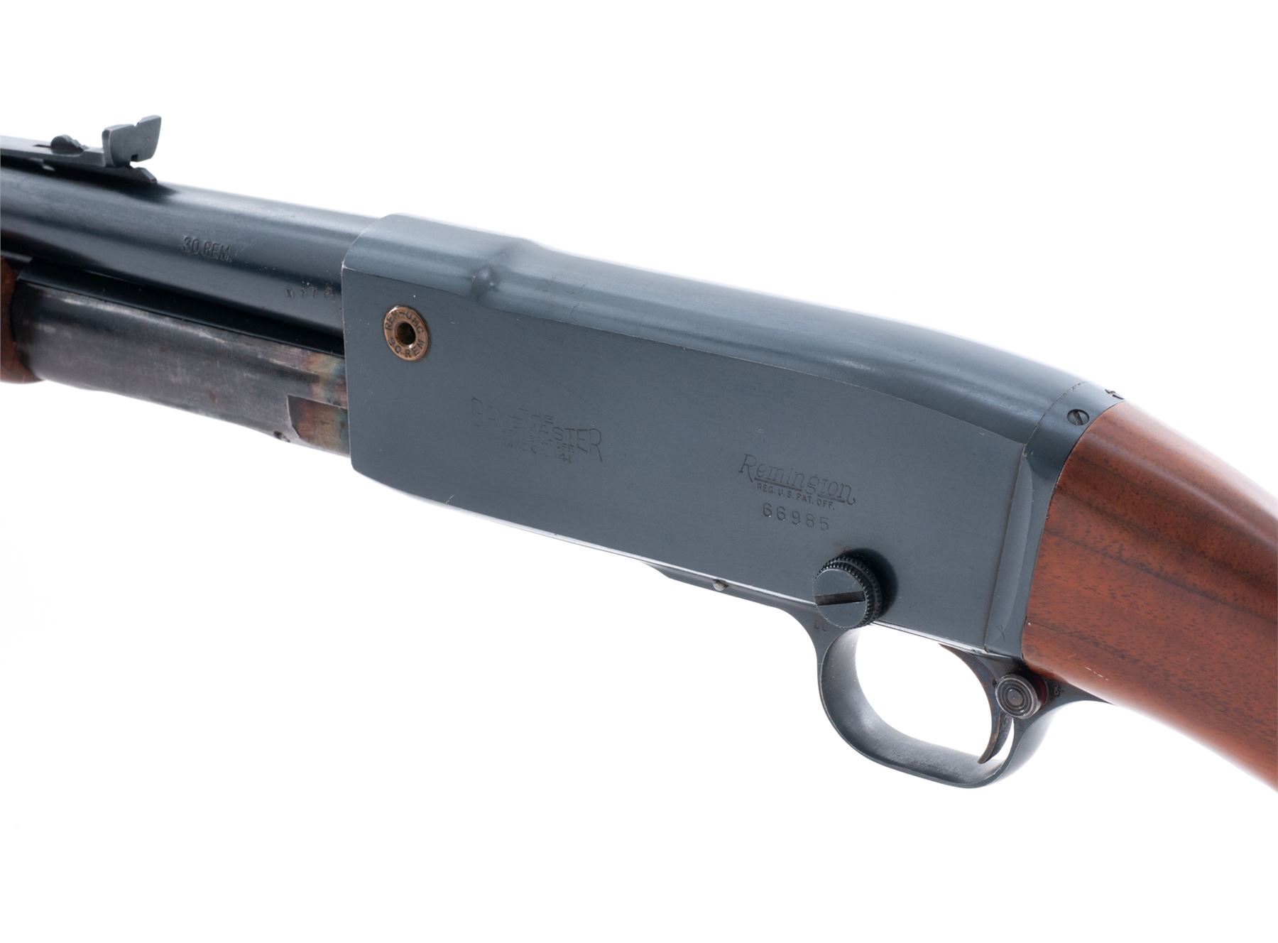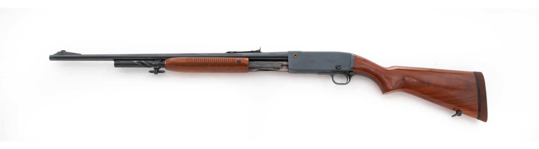 Remington Gamemaster Model 141 Pump Action Rifle, #66985, .30 Rem. cal., 24'' barrel, blue finish, walnut stock and forend, with Decelerator brown butt pad, white bead and standard rear sight, and sling swivels. Condition is excellent retaining approx. 95%+ blue with just light micro-scratching here and there. Stock and forend are excellent. Good action, mirror bright bore. Est.: $300-$500. (C&R)