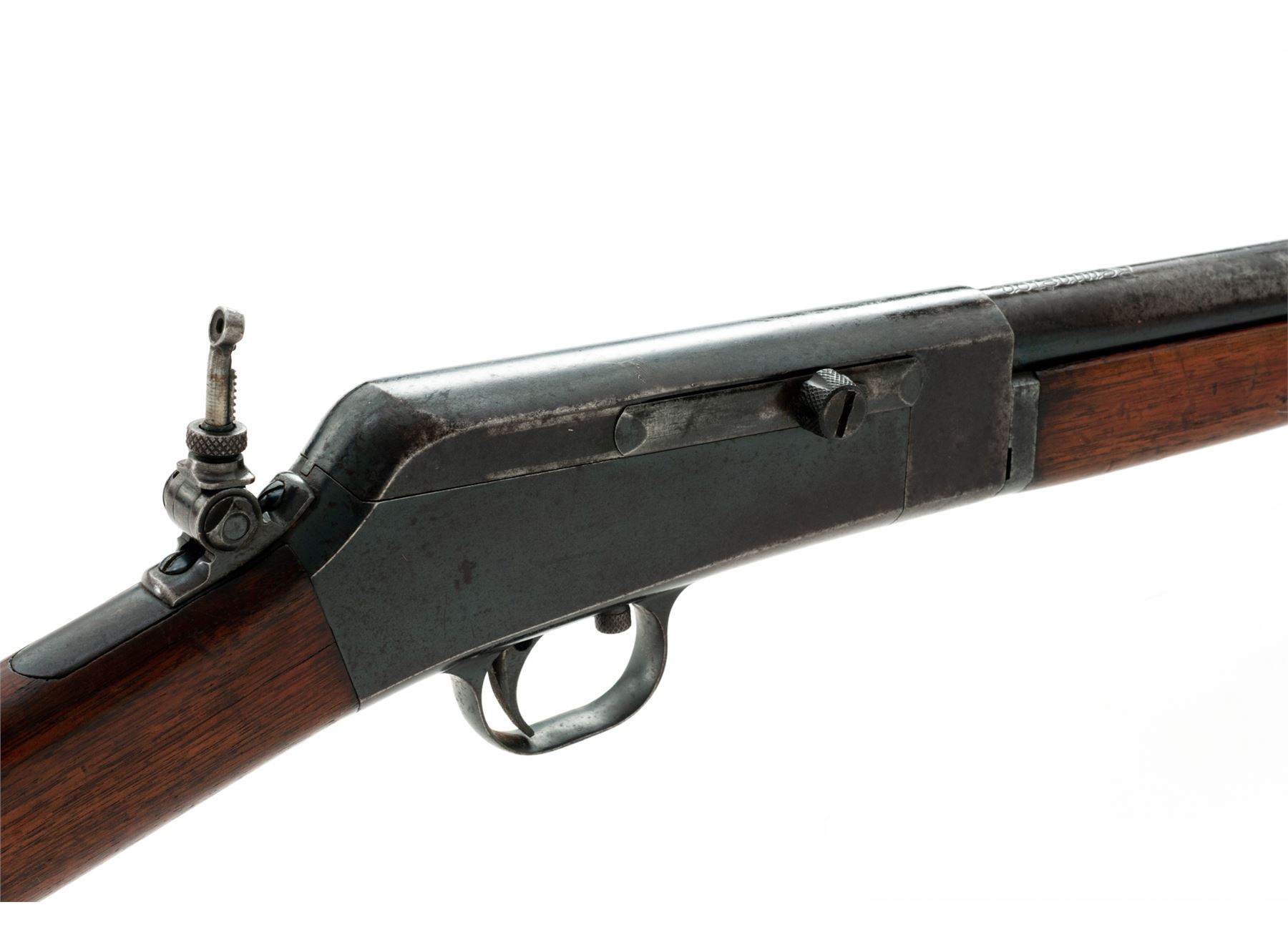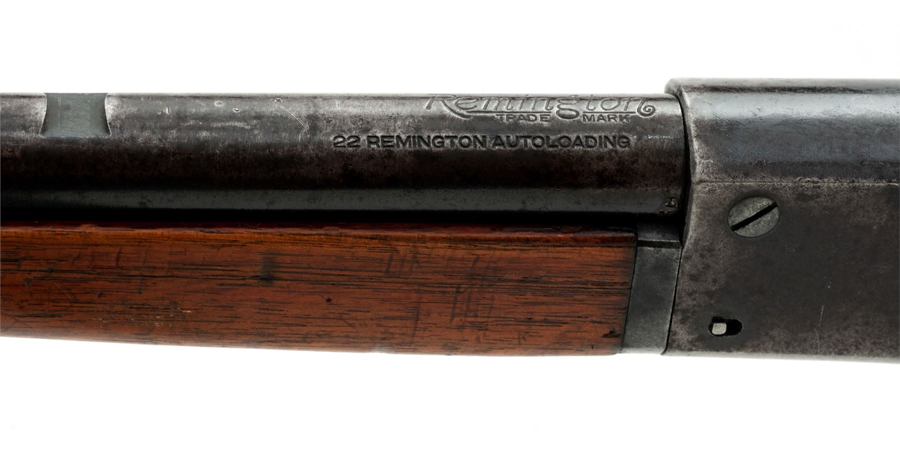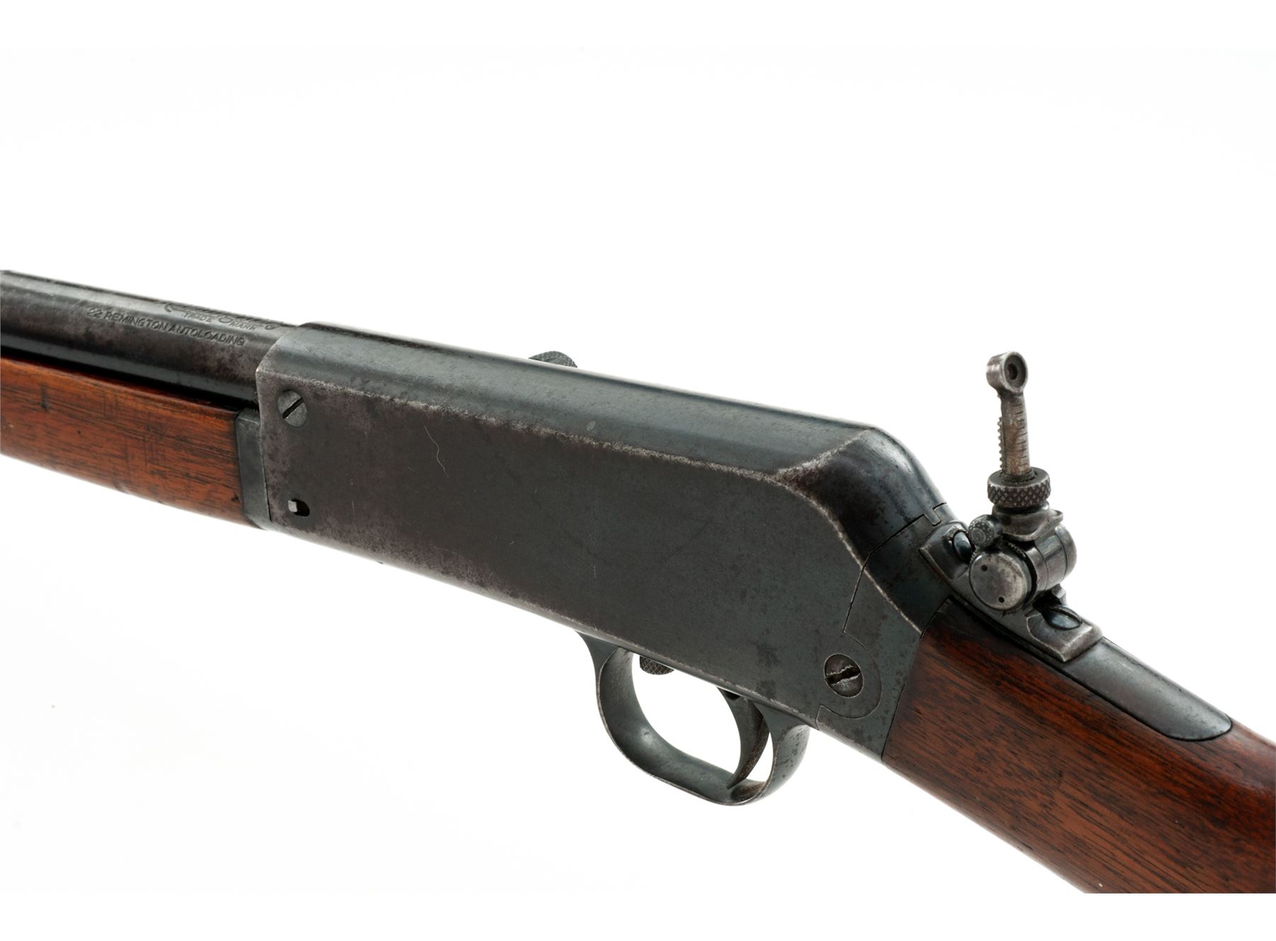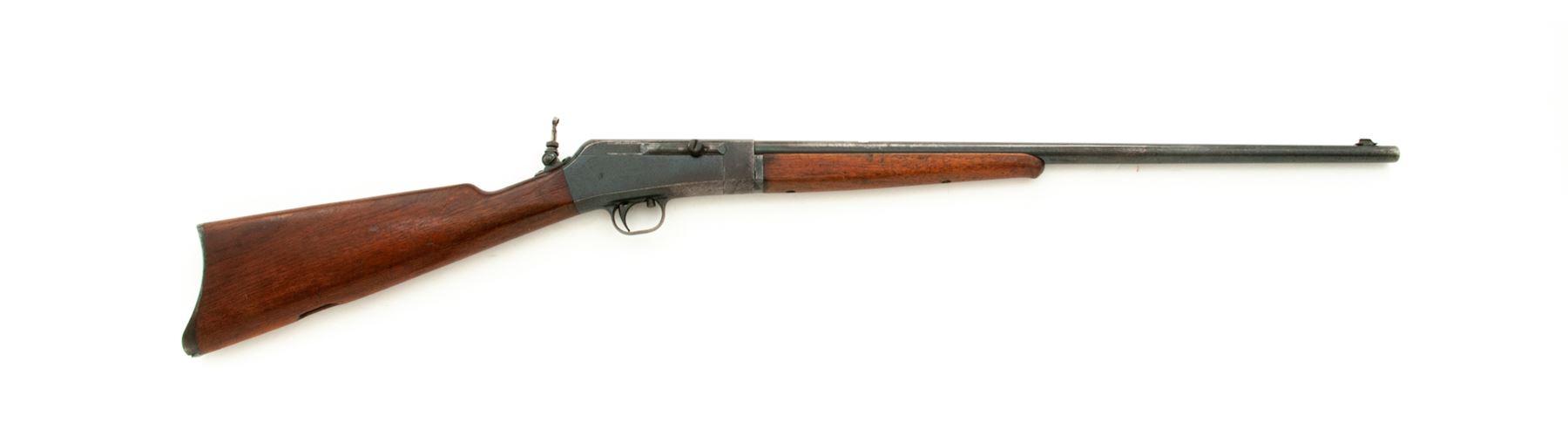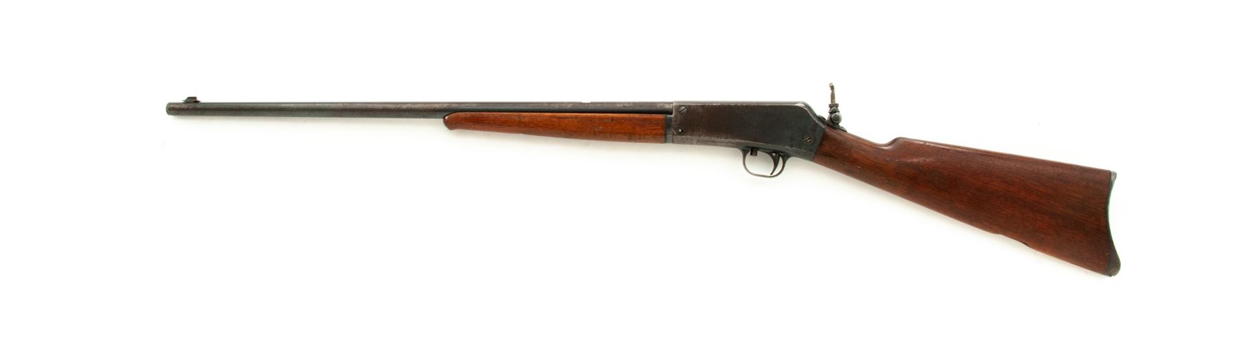 Remington Model 16 Takedown Auto-loading Rifle, #7262, .22 RF cal., blued 22'' round barrel having a dovetailed bead-blade front sight, vacant rear dovetail, and adjustable peep tang sight, blued steel receiver, which has an integral triggerguard and marked ''RB/7262'' at bottom front; grooved trigger; oil-finished thin Schnabel-style walnut forend and buttstock with internal tubular brass cartridge magazine and steel buttplate having the circular ''Remington/UMC/Trade Mark'' logo. Condition is very good, the barrel retaining approx. 50% original deep blue mixing with brown patina and scattered dings/scratches, the receiver and triggerguard with 50% smooth blue, the buttplate gunmetal gray. Stocks are sound and retaining much oil finish with scratches and dings, especially on forend, but solid and fit well. Action functions as designed; bore is shiny with sharp rifling. Est.: $250-$450. (C&R)