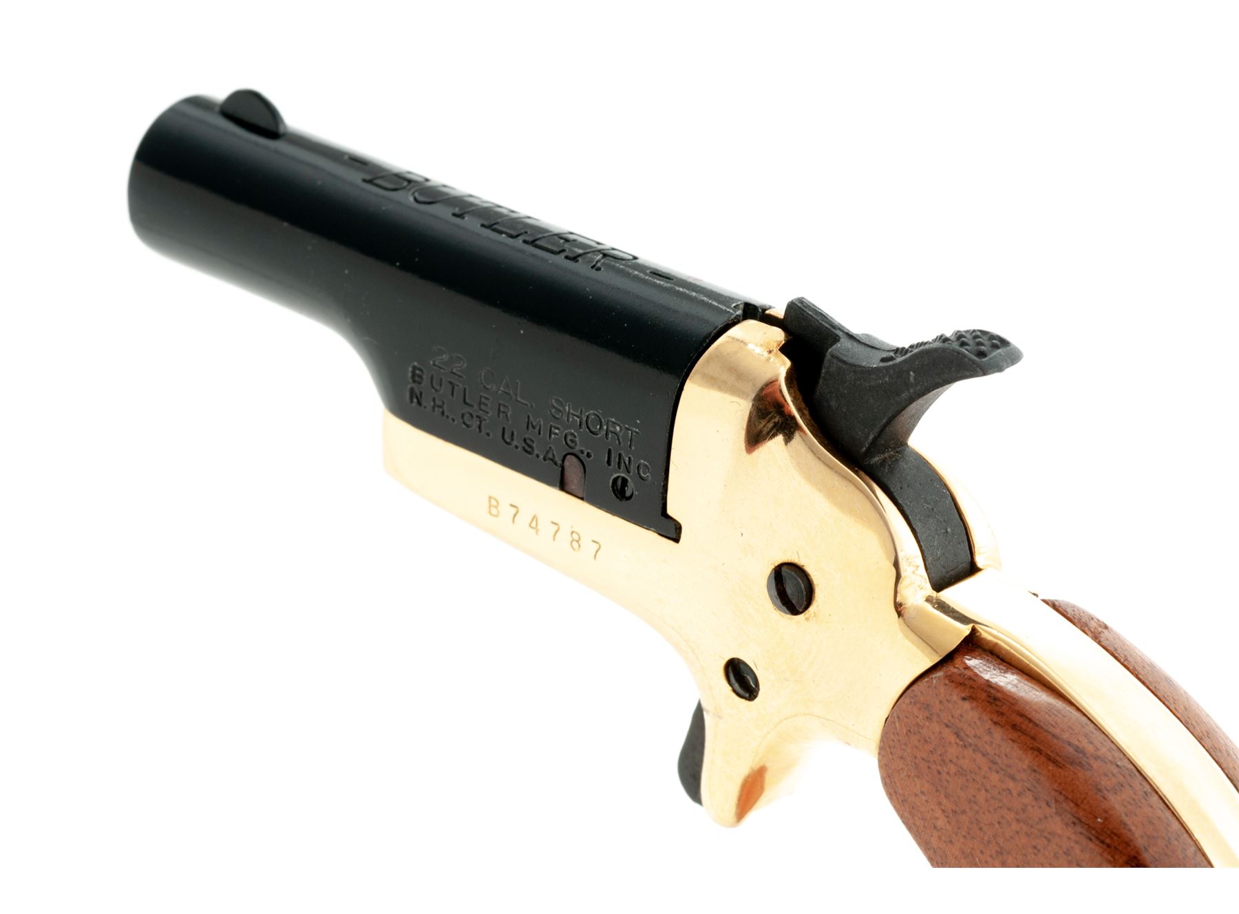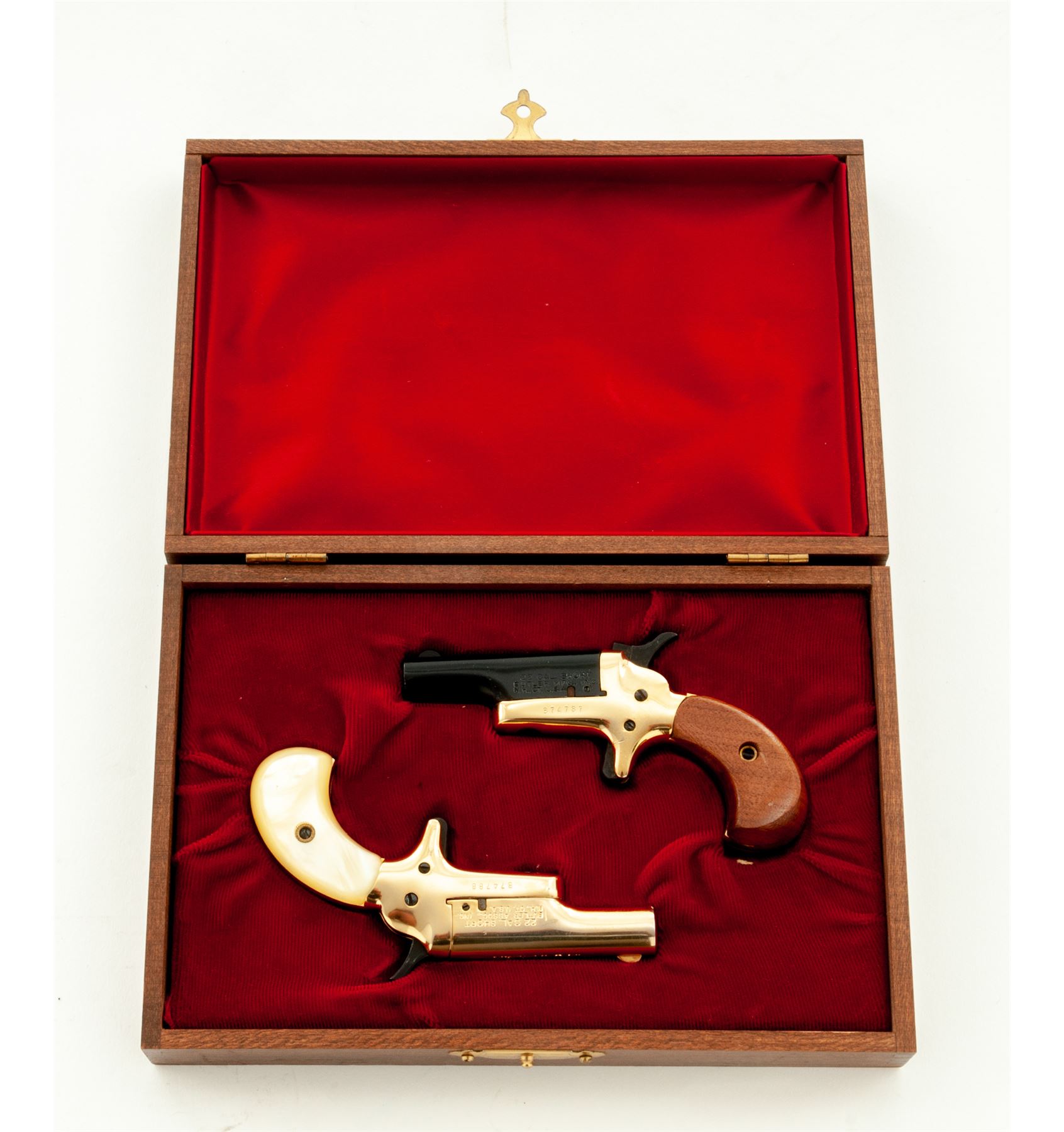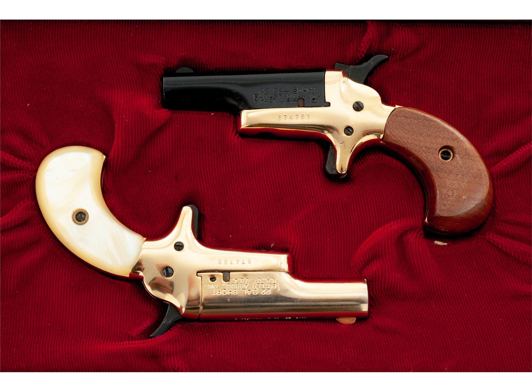 Cased Set Butler Assoc., Inc. Lord & Lady Derringers, consecutively numbered #B74787 and #B74788, both are single shot, chambered in .22 short, with pivoting Thuer action, gold-colored frames; one with a black finish and walnut grips, the other with a gold-colored barrel and faux pearl grips. In wood display case with cranberry colored lining. Metal surfaces rate in fine condition with just a little wear to the highpoints on the side that is face down in the case, as well as normal slight handling marks. Grips are excellent and with the exception of one small mark to the left walnut grip, both appear as new. Excellent action and bores. Case with scattered moderate storage type marks to the lid, with a nice even finish and color; interior with a little rub wear to the fabric. Est.: $250-$450. (Modern/PPT)