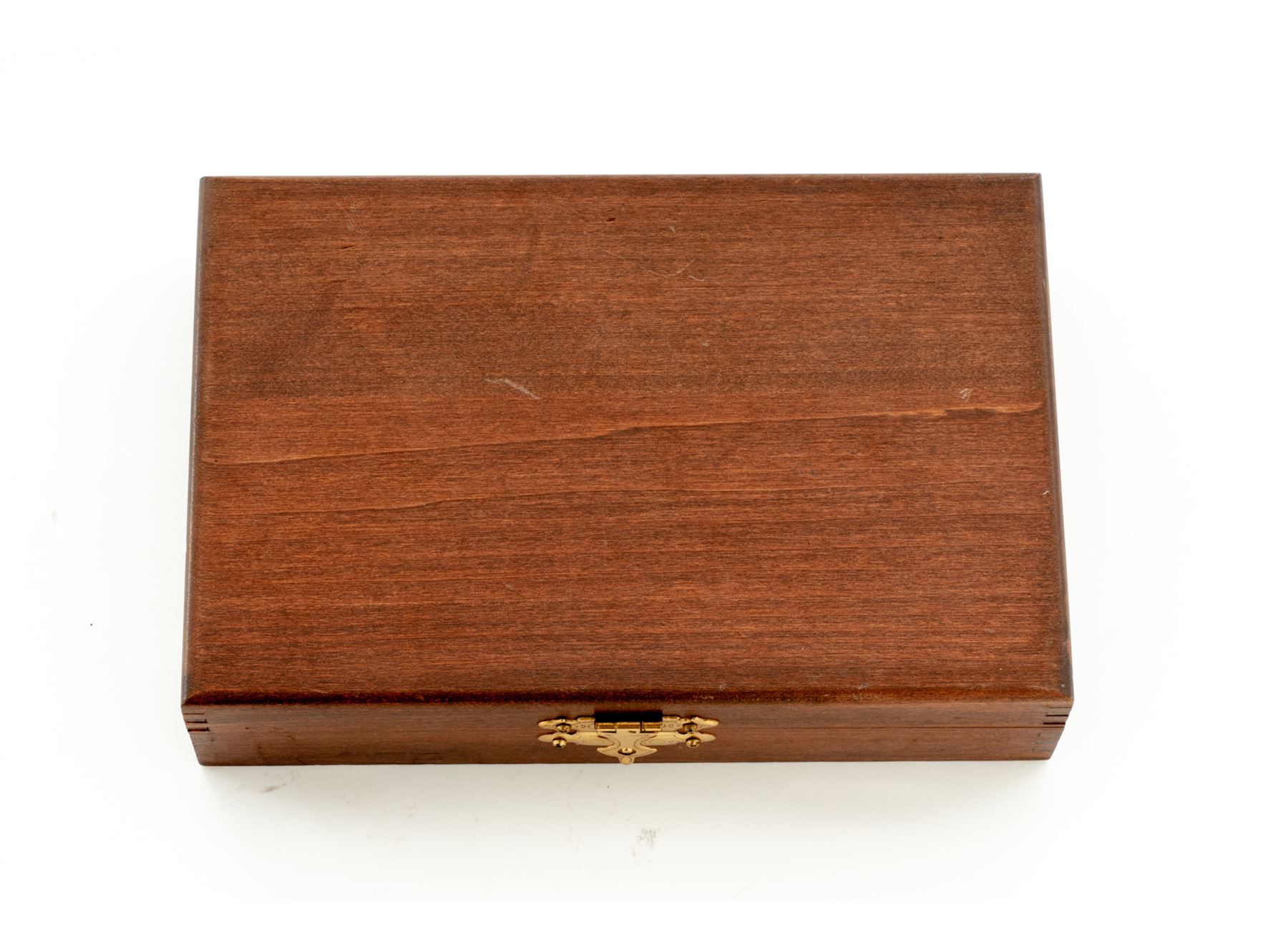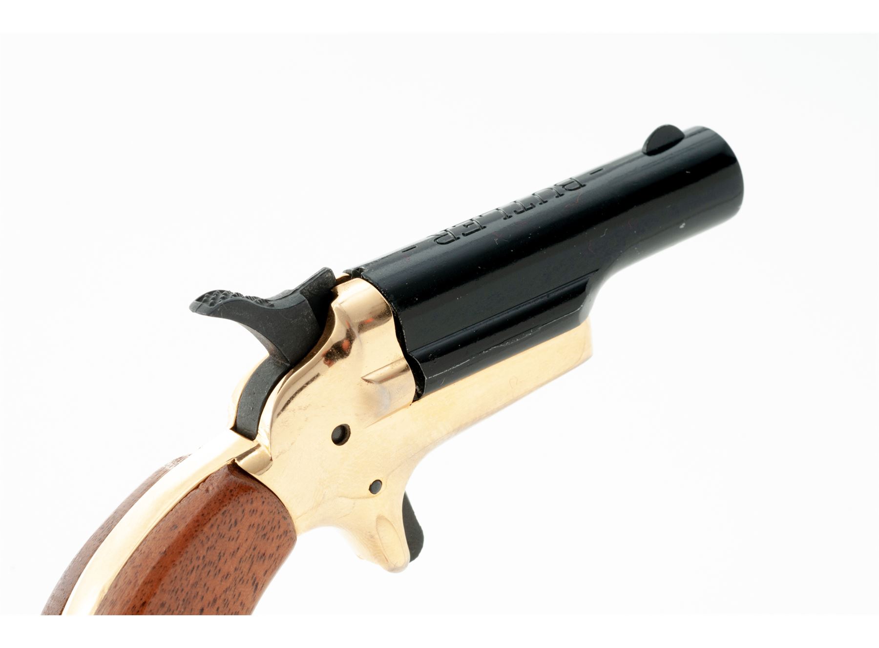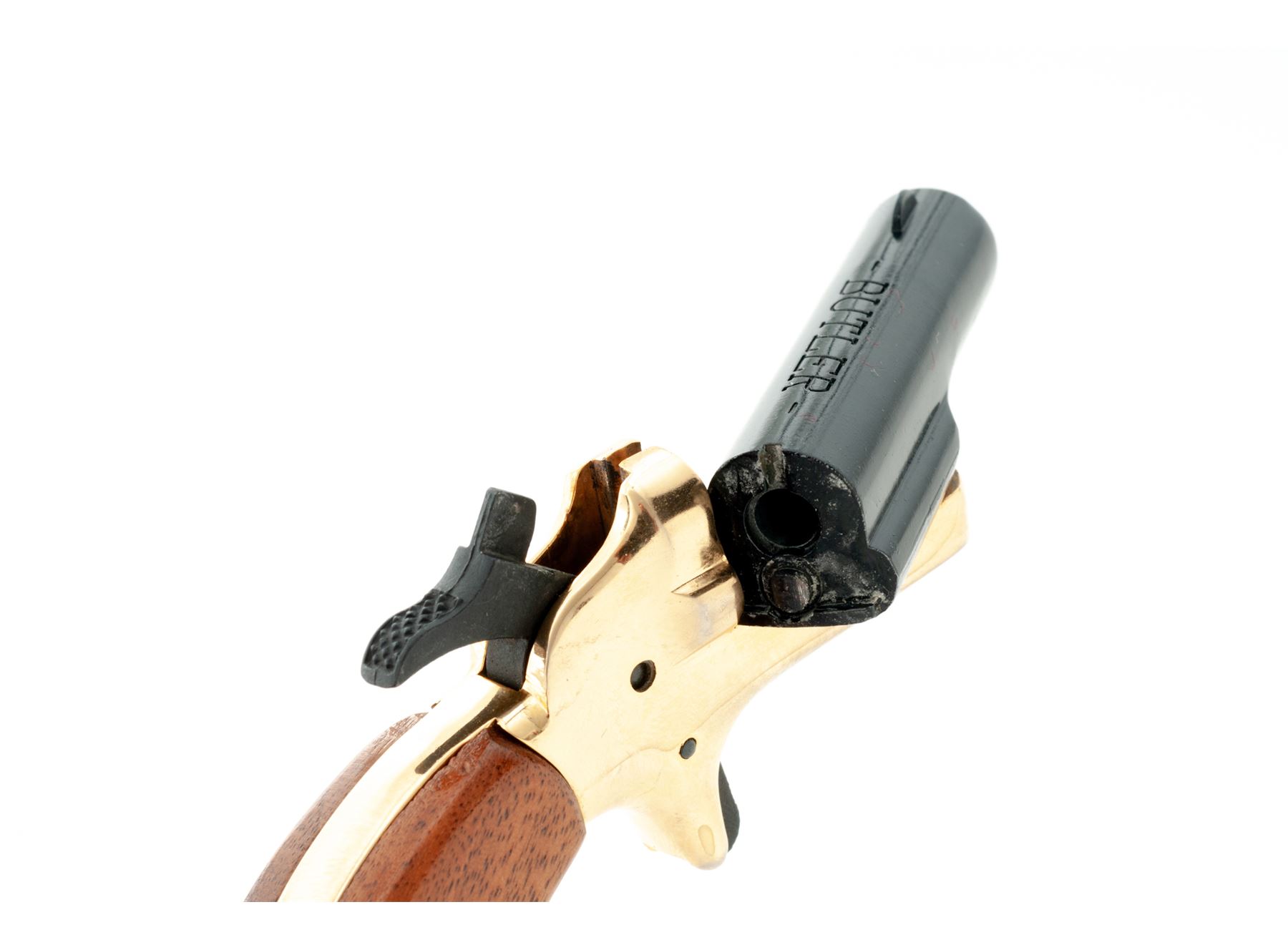Cased Set Butler Assoc., Inc. Lord & Lady Derringers, consecutively numbered #B74787 and #B74788, both are single shot, chambered in .22 short, with pivoting Thuer action, gold-colored frames; one with a black finish and walnut grips, the other with a gold-colored barrel and faux pearl grips. In wood display case with cranberry colored lining. Metal surfaces rate in fine condition with just a little wear to the highpoints on the side that is face down in the case, as well as normal slight handling marks. Grips are excellent and with the exception of one small mark to the left walnut grip, both appear as new. Excellent action and bores. Case with scattered moderate storage type marks to the lid, with a nice even finish and color; interior with a little rub wear to the fabric. Est.: $250-$450. (Modern/PPT)