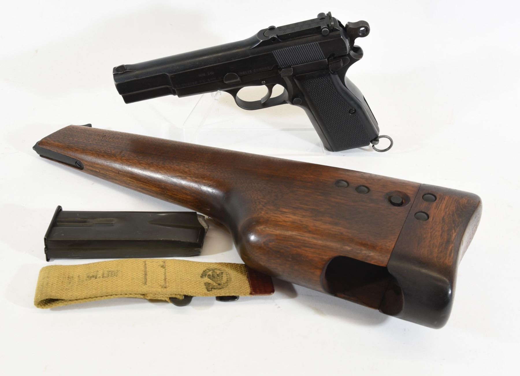 Restricted, semi auto, 9mm Luger, 118mm barrel, SN 4CH2431. Grips have some marks, flat matte finish is worn on frame, bore has some pitting. Wood stock has some dents and small scratches, stamped S.A.LTD. 1945. Firearm made at Inglis Canada. Comes with frog.