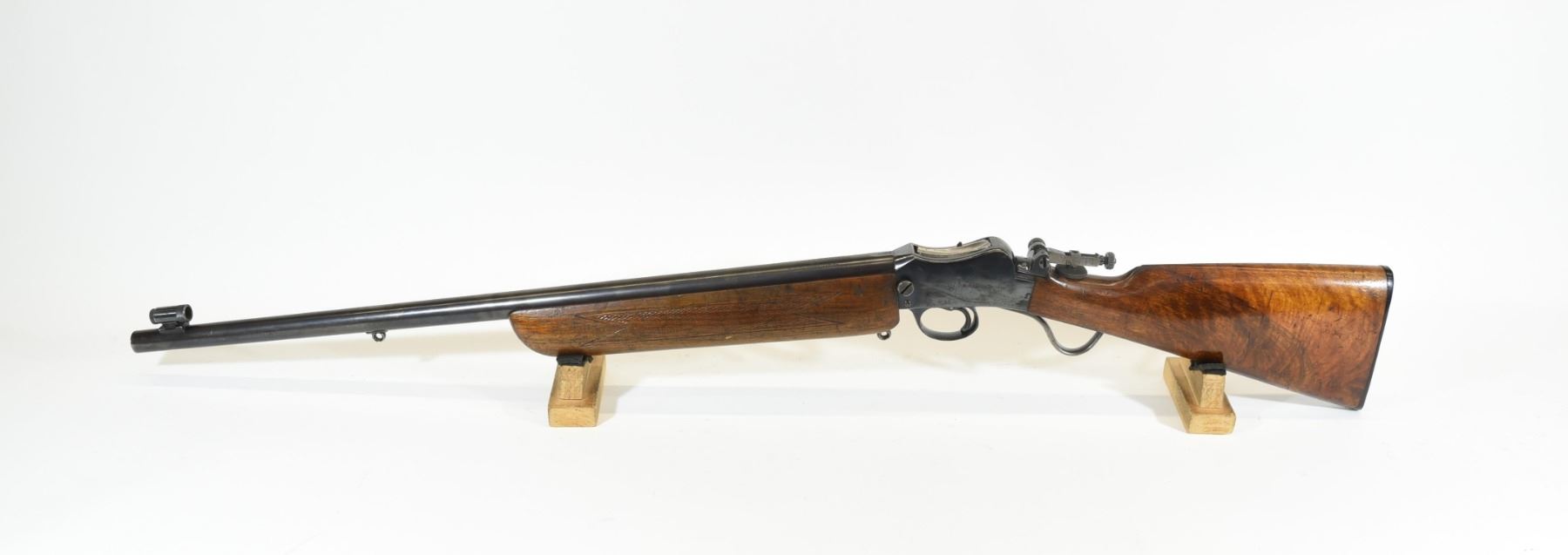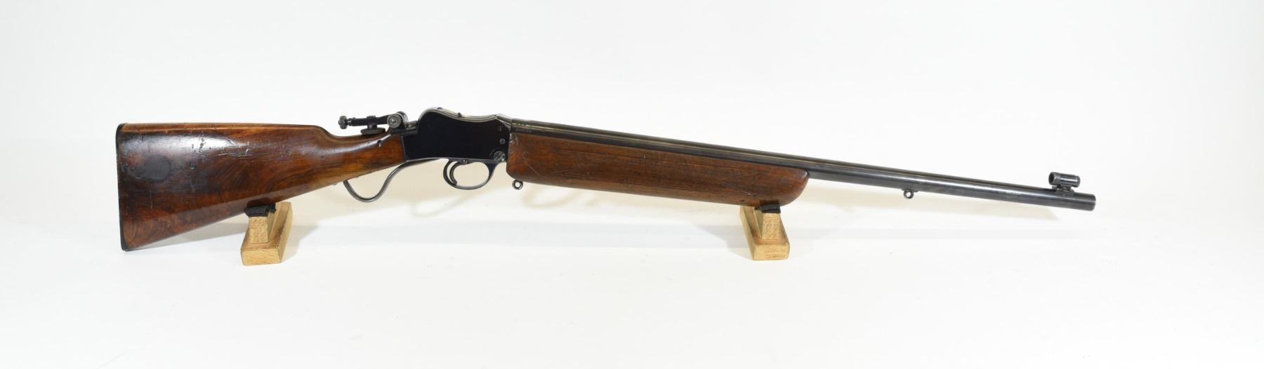 Non-restricted, single shot falling block action, 22 lr, 25" heavy barrel, SN 30432. Wood has a number of light scratches and dents, bluing is starting to turn grey, bore is excellent.