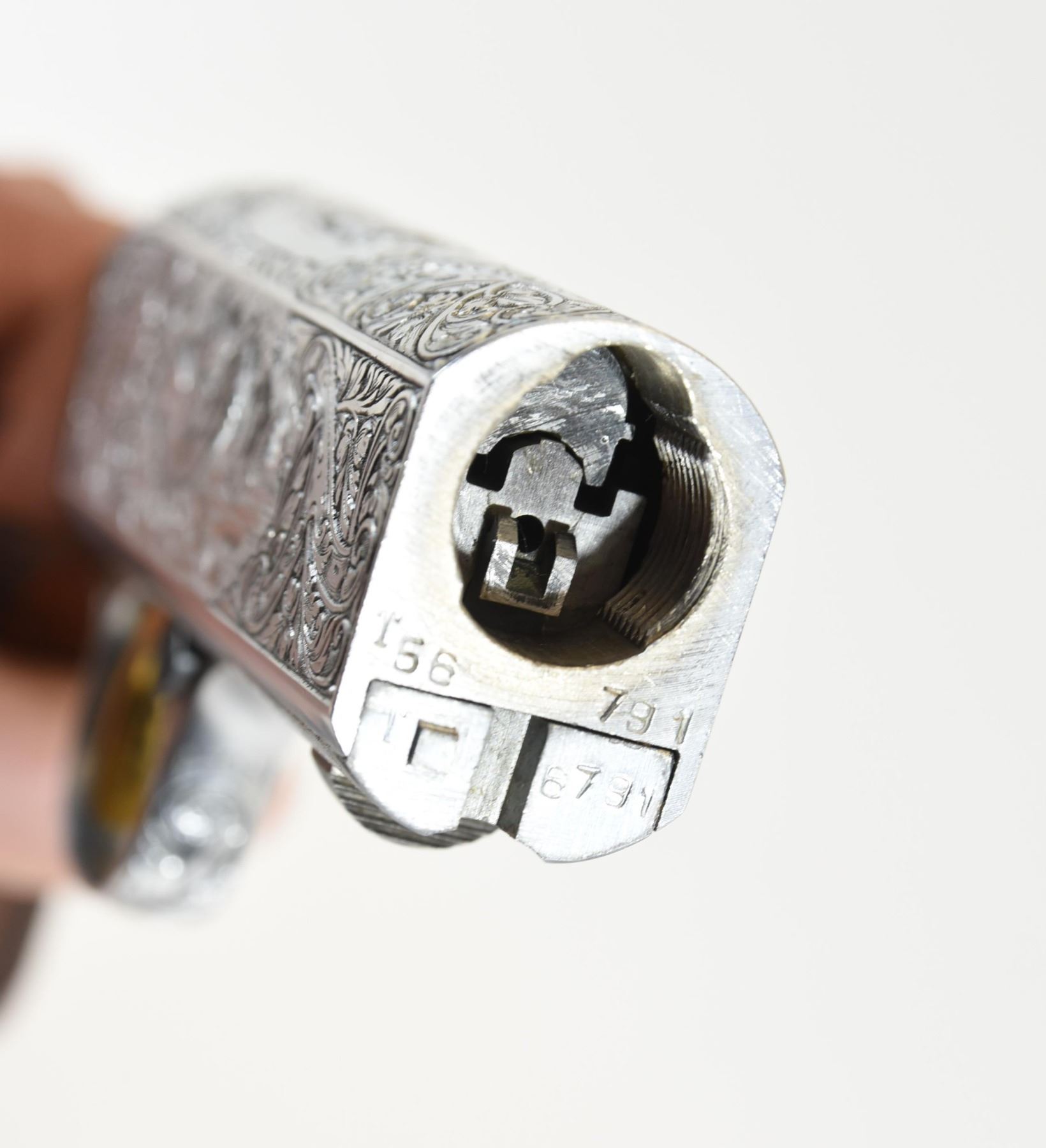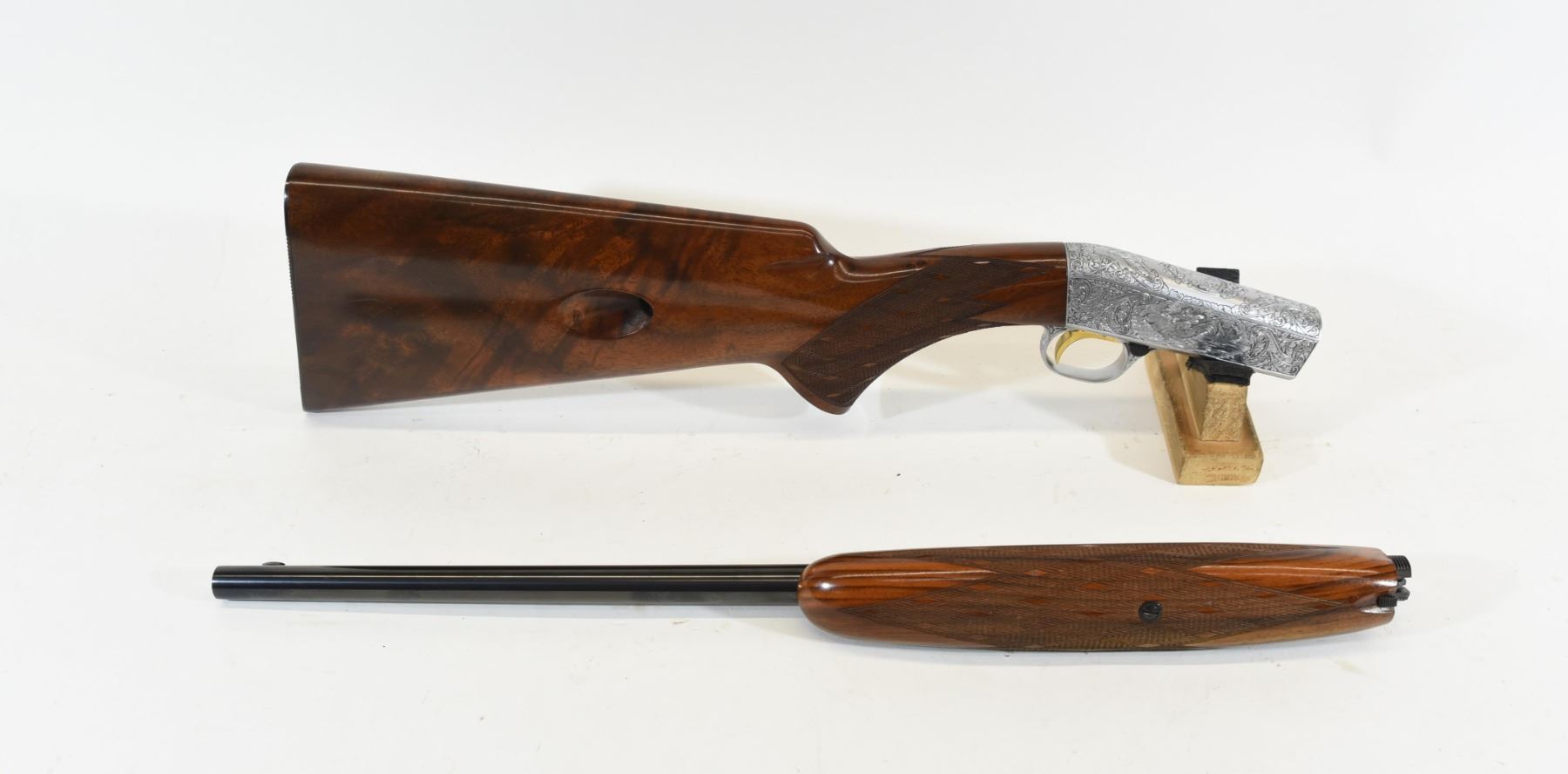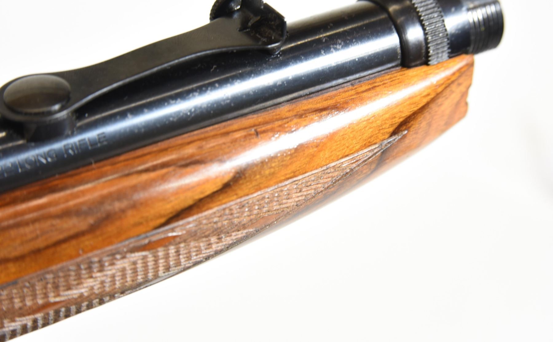 Non-restricted, semi auto, .22 cal. lr, 19 1/4" barrel, SN T56791. Rosewood has 8 or 10 light scratches with one small dent in the butt stock, the fore stock has 2 very small dents, bluing has some very fine surface rust on the barrel, bore is excellent. Comes in a leather Browning takedown case that is in good condition with keys. There is a bit of freckling on the bolt, the gun is beautifully engraved, the gun has been fired. Overall the gun is in very good condition.