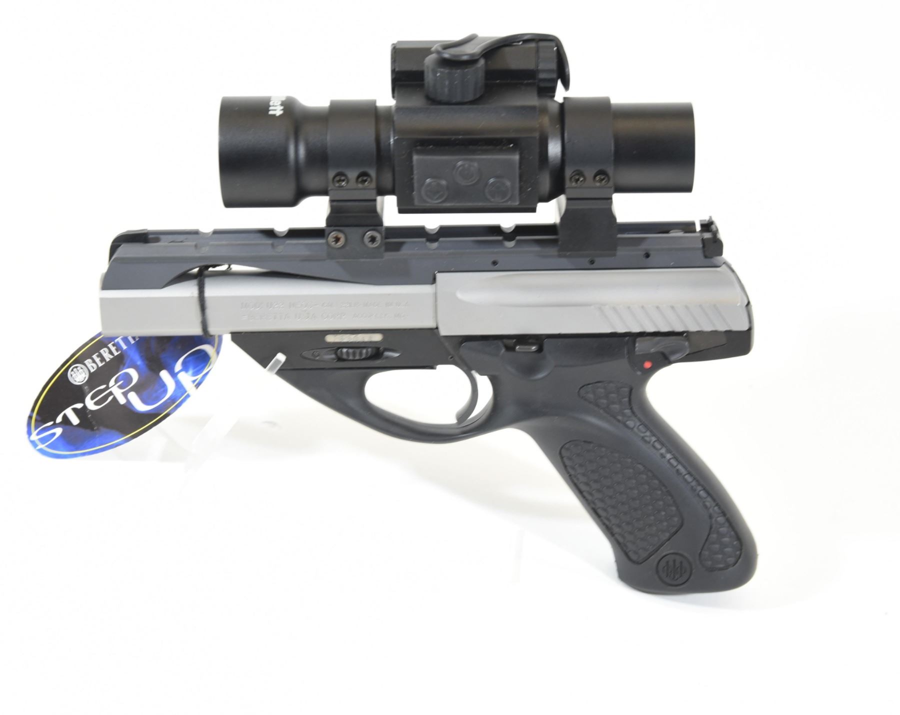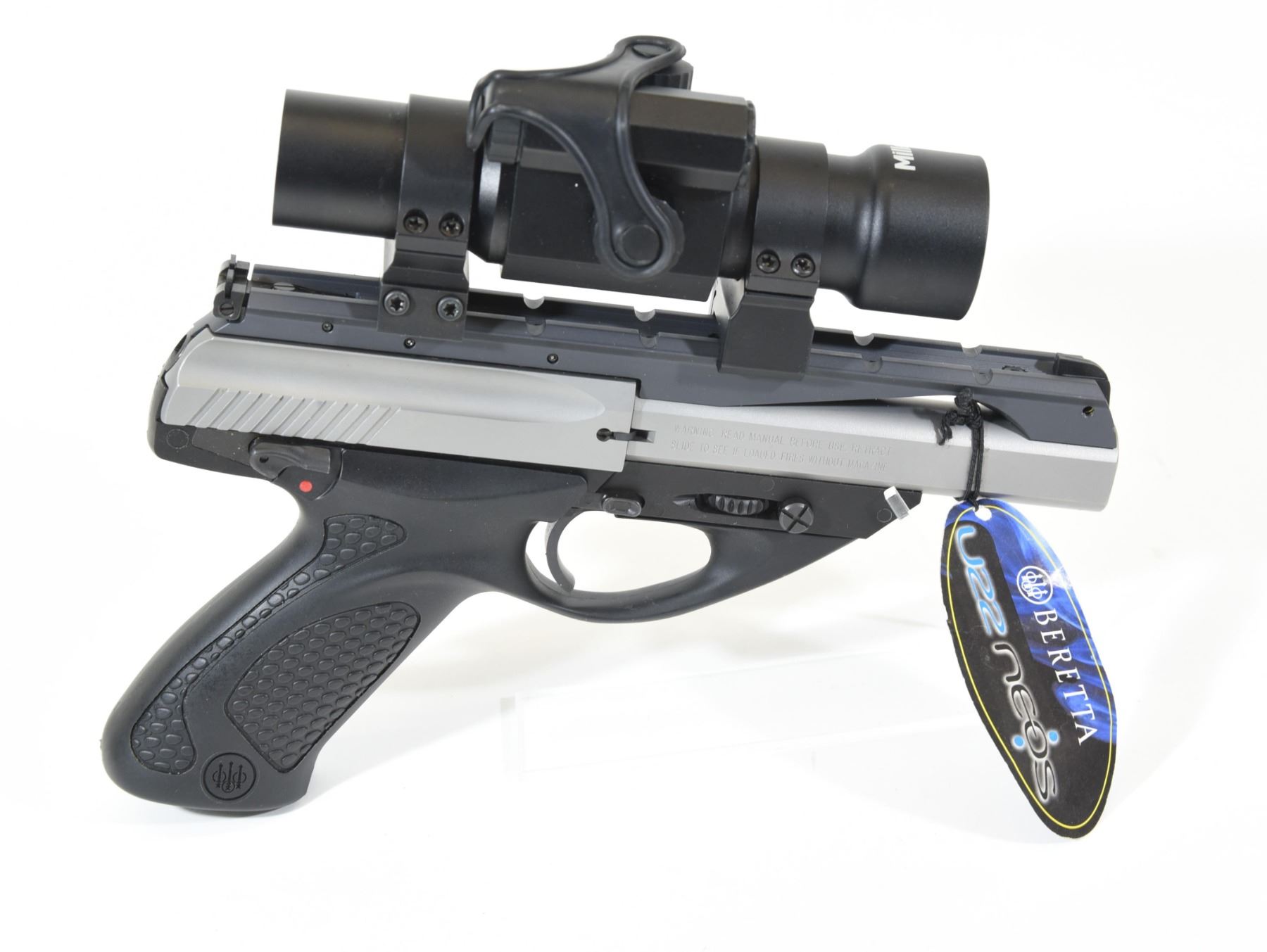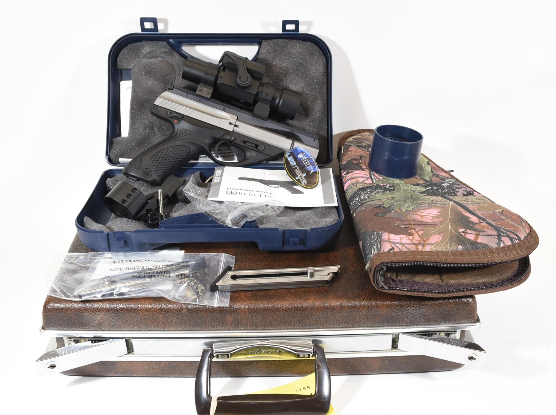 Restricted, semi auto, 22LR, 114mm barrel, SN T33644. Excellent condition. Comes with extra mag, hard case, soft case, brief case, extra scope mount, millett Red Dot.