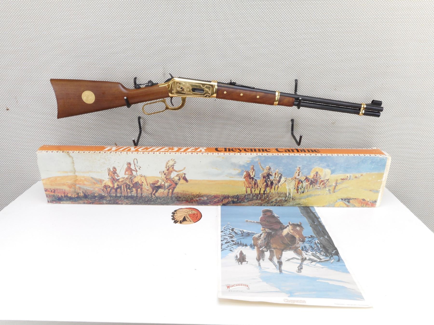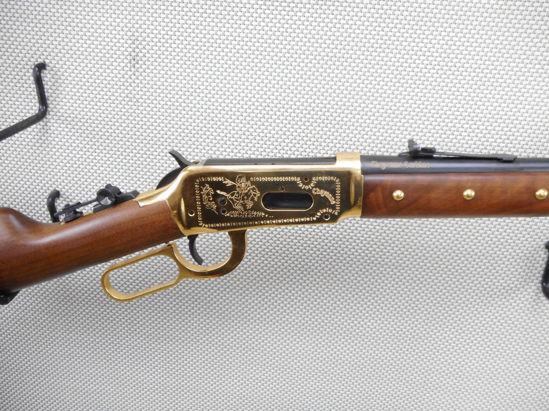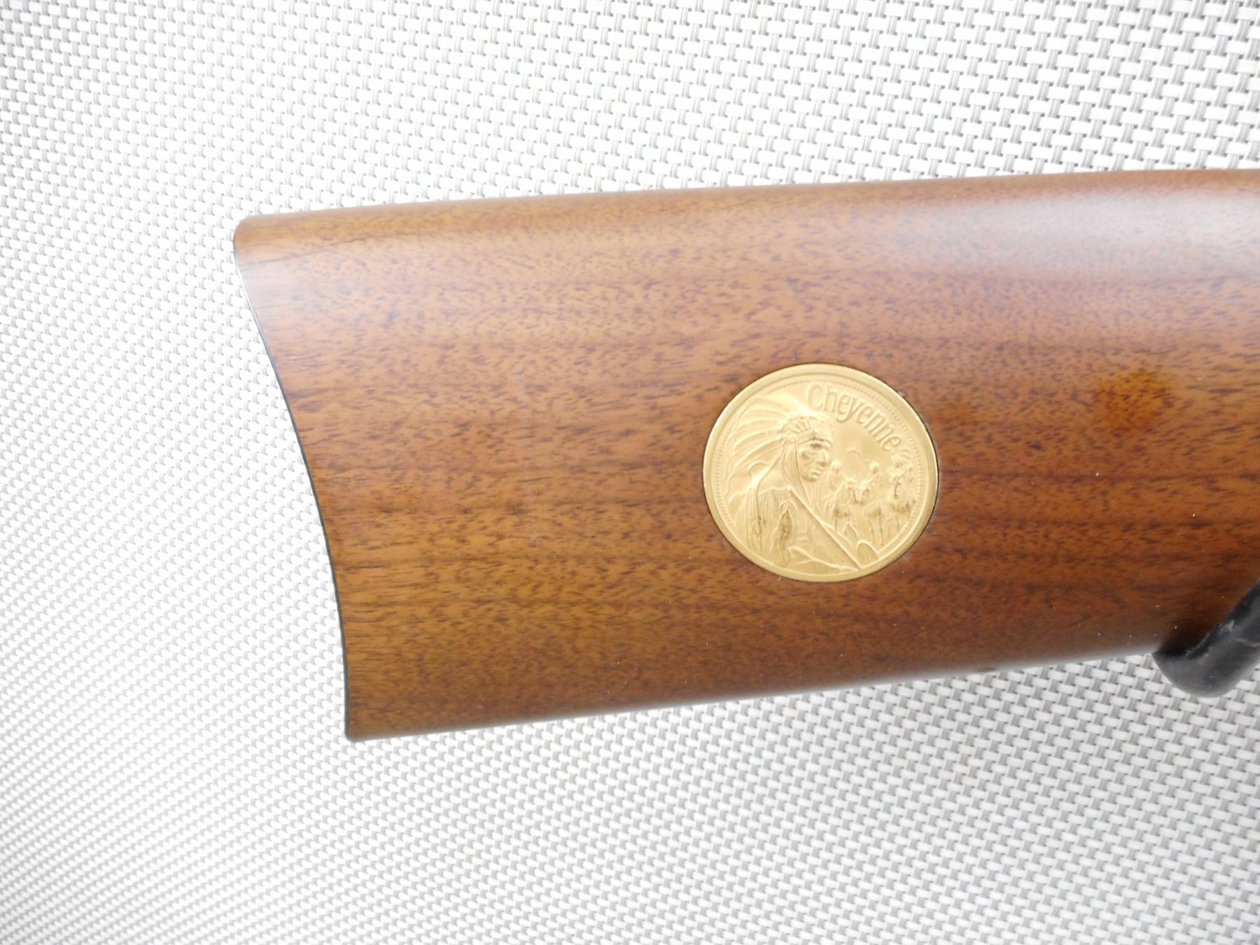 WINCHESTER , MODEL: 94 CHEYENNE COMMEMORATIVE , CALIBER: 44-40 WIN , COMES WITH BOX (DAMAGED) AND POSTER. BORE IS EXCELLENT, APPEARS AS NEW, MAY HAVE BEEN TEST FIRED. HOODED FRONT SIGHT, ADJUSTABLE MID AND REAR TANG SIGHT. TWO PIECE HARDWOOD STOCK WITH 6 TACKS IN THE FOREND. BRASS DISK IN THE BUTT. GOLD ACCENT BARREL BANDS, RECEIVER, LEVER. SADDLE RING. STEEL BUTT PLATE. SHOWS VIRTUALLY NO HANDLING MARKS. ACTION: LEVER ACTION RIFLE , BARREL LENGTH: 20" , SERIAL # CHO2094 , CONDITION: AS NEW IN BOX , CLASS: CANADIAN NON RESTRICTED CLASS