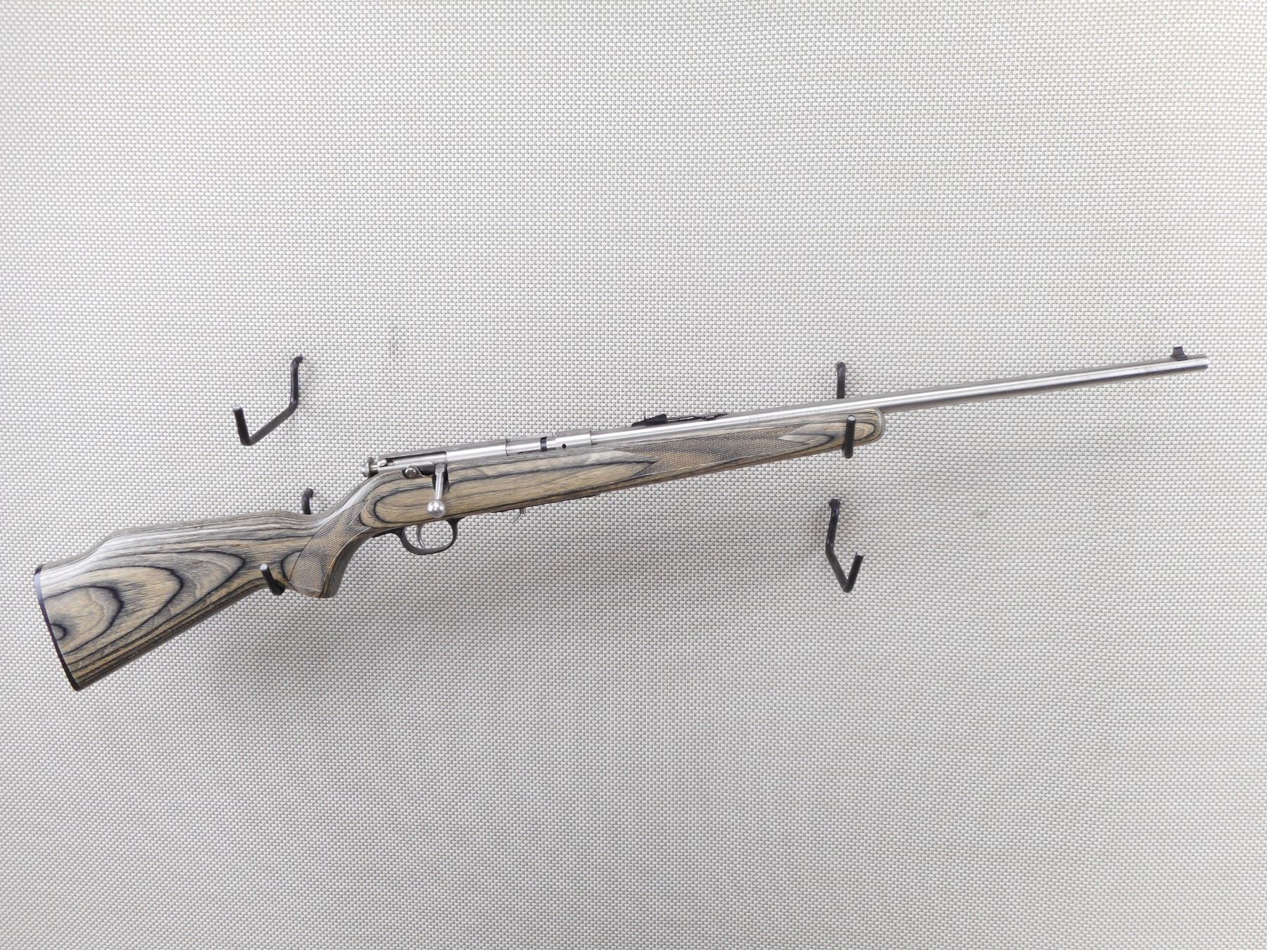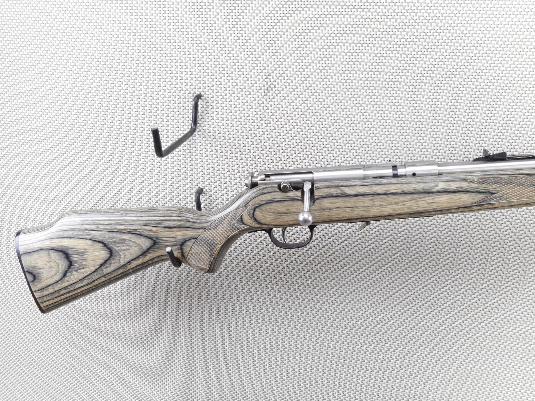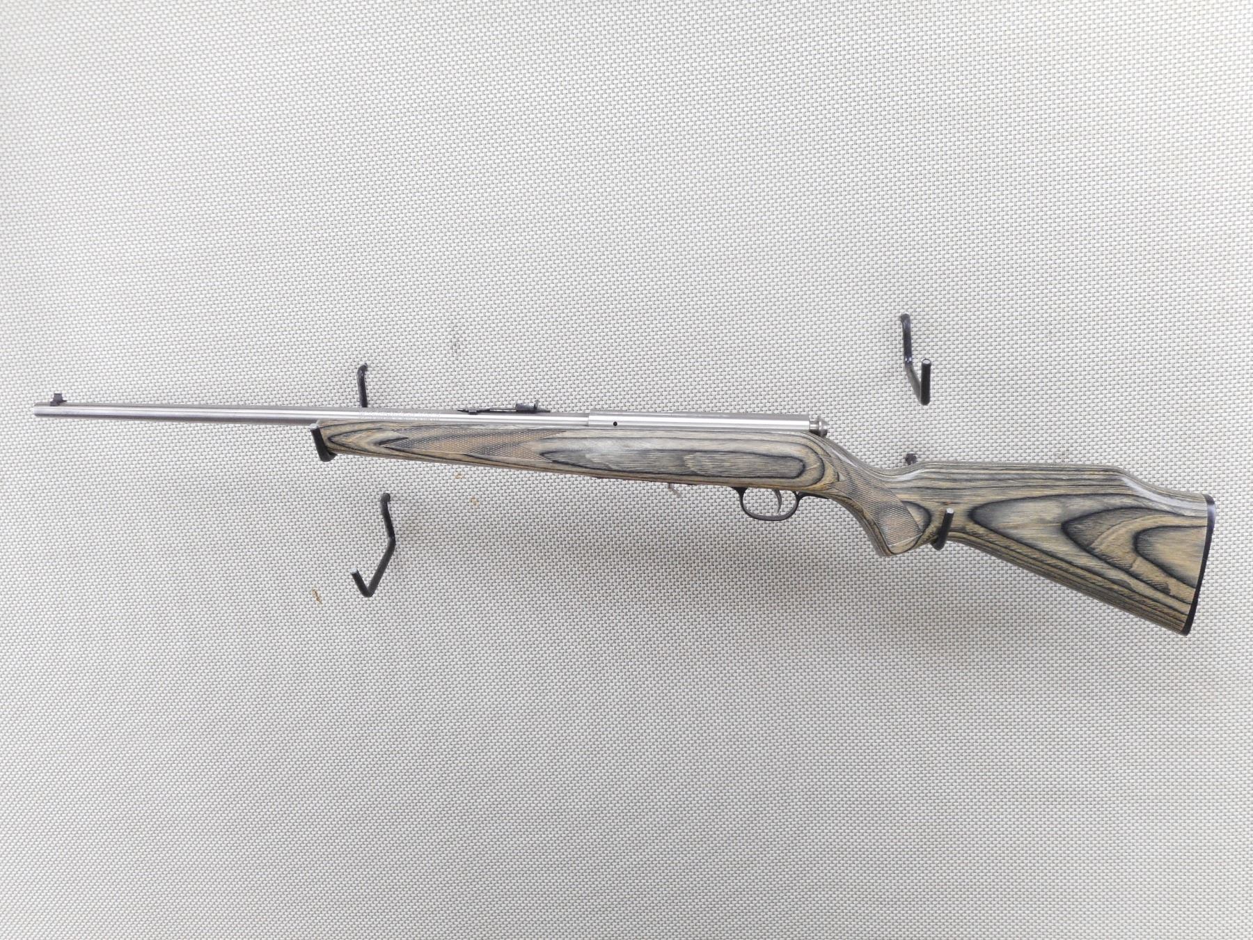 SAVAGE , MODEL: 93 , CALIBER: 22 MAG , MISSING THE MAGAZINE. BORE IS VERY GOOD. BLADE FRONT AND ADJUSTABLE REAR SIGHTS. ONE PIECE GREY LAMINTATED HARDWOOD STOCK WITH PLASTIC BUTT PLATE. SHOWS SOME HANDLING MARKS. ACTION: BOLT ACTION RIFLE , BARREL LENGTH: 20" , SERIAL # 0050322 , CONDITION: 6/10 , CLASS: CANADIAN NON RESTRICTED CLASS