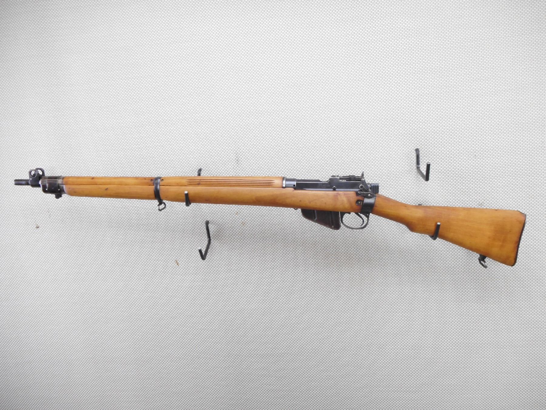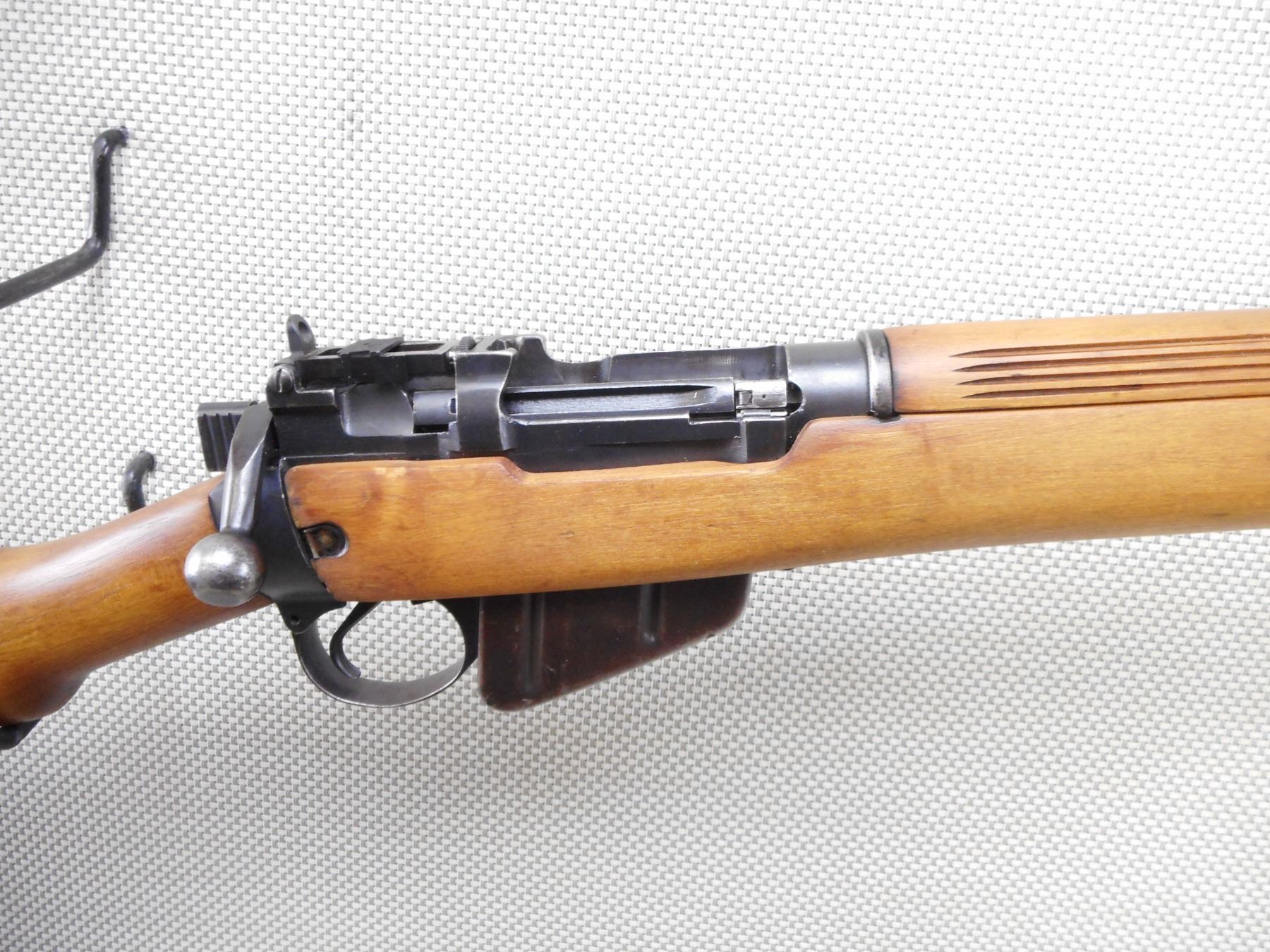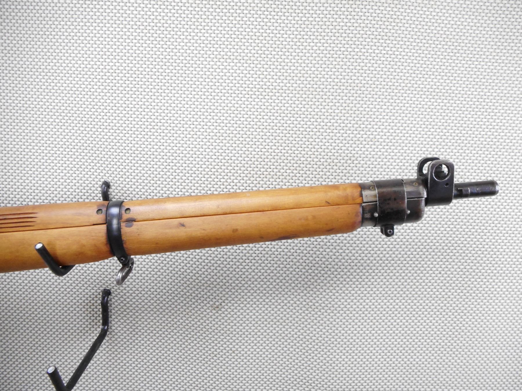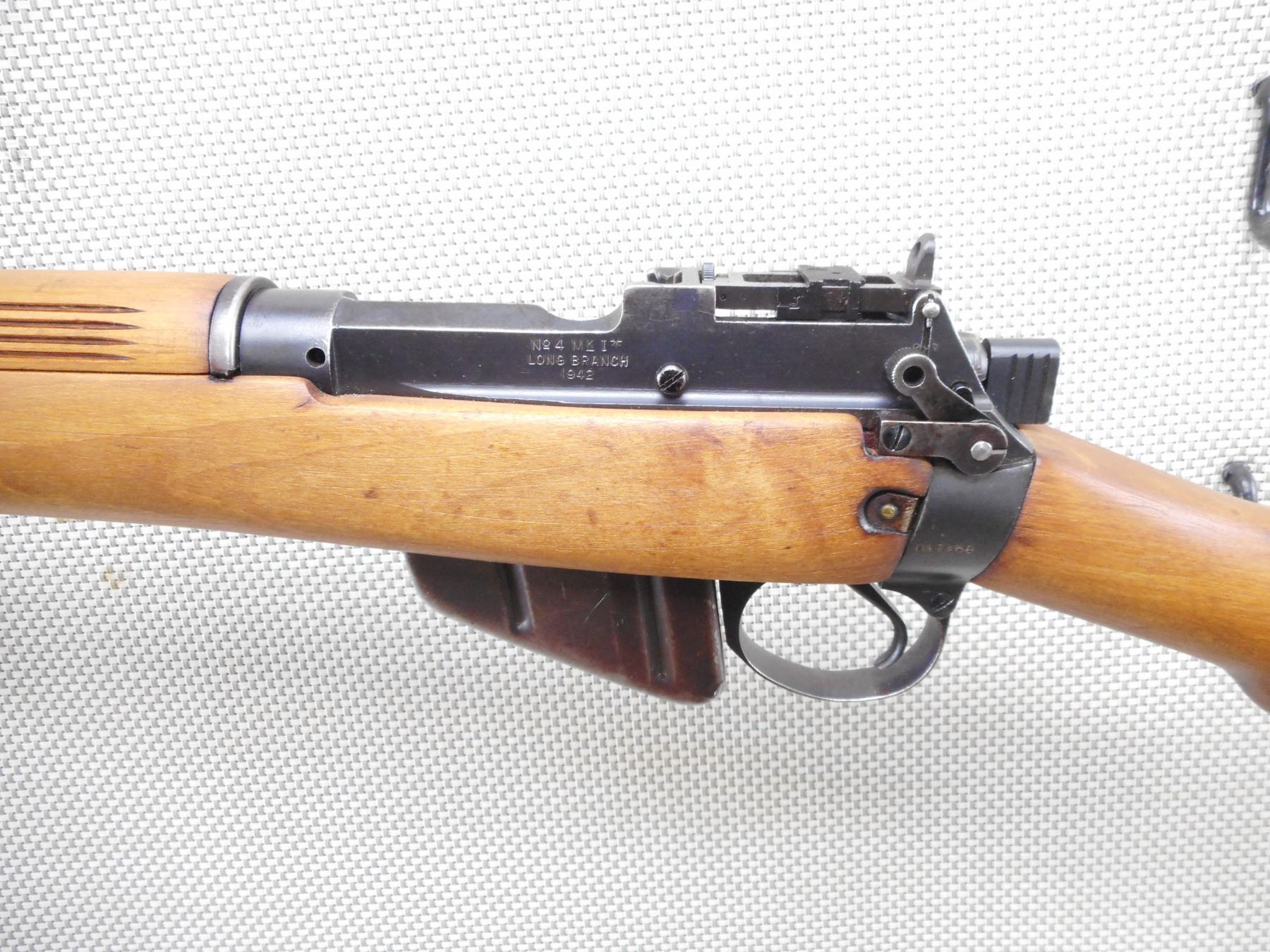 WWII ERA, LEE ENFIELD , MODEL: NO 4 MKI* LONG BRANCH , CALIBER: 303 BR , COMES WITH MAGAZINE. BORE IS EXCELLENT. BOLT AND RECEIVER ARE MATCHING BY SERIAL #'S. DATED 1942. VERY GOOD BORE. 2 GROOVE BARREL. PROTECTED FRONT SIGHT AND PEEP REAR SIGHT. 4 PIECE HARDWOOD STOCK WITH LARGE CRACK ON THE FRONT FOREND COVER. STEEL BUTT PLATE WITH CRACK AT THE HEAL. STOCK APPEARS TO HAVE BEEN REFINISHED. SLING SWIVLE LOOPS. SHOWS SOME HANDLING MARKS. ACTION: BOLT ACTION RIFLE , BARREL LENGTH: 25" , SERIAL # 6L7261 , CONDITION: 7/10 , CLASS: CANADIAN NON RESTRICTED CLASS