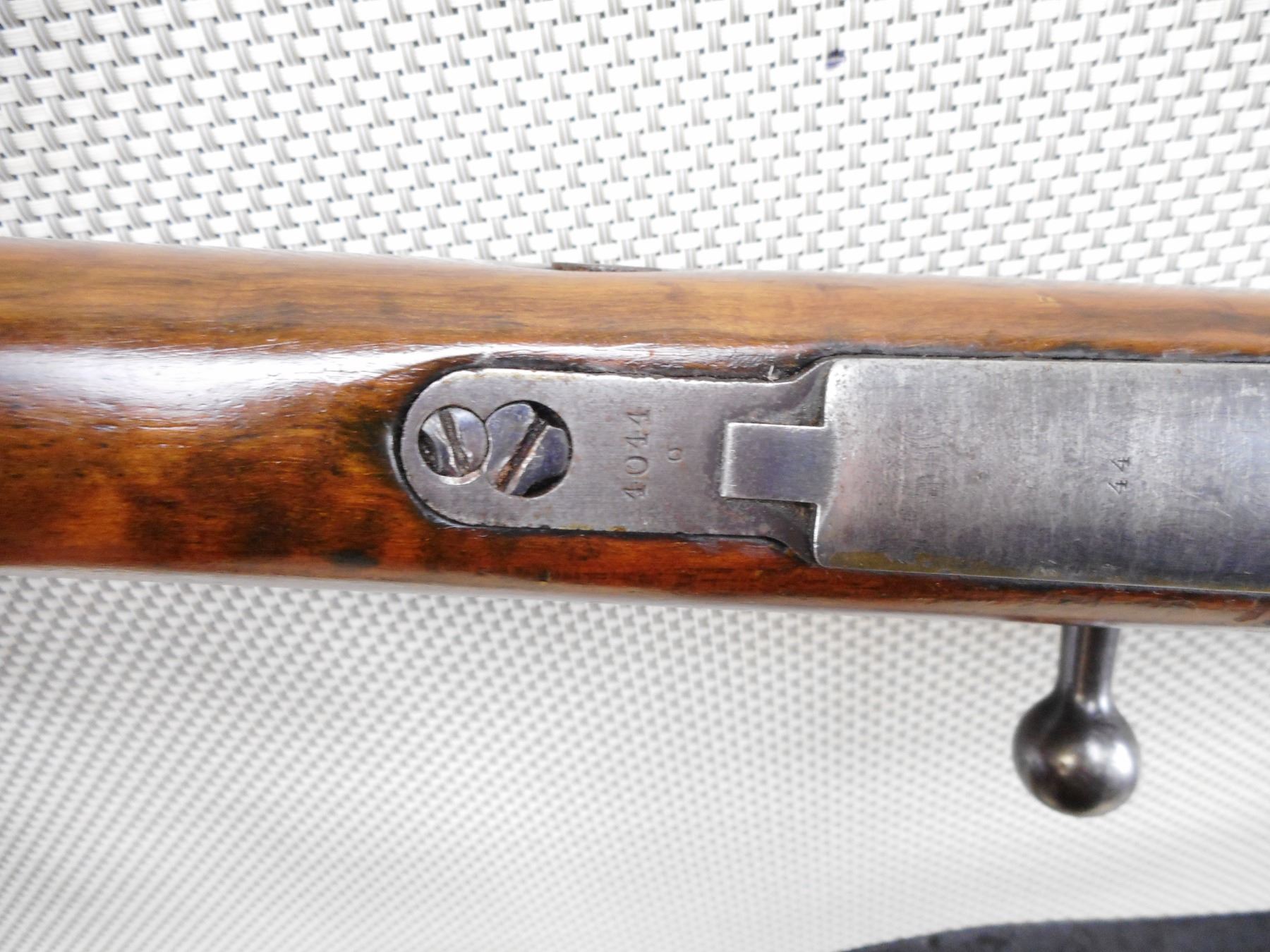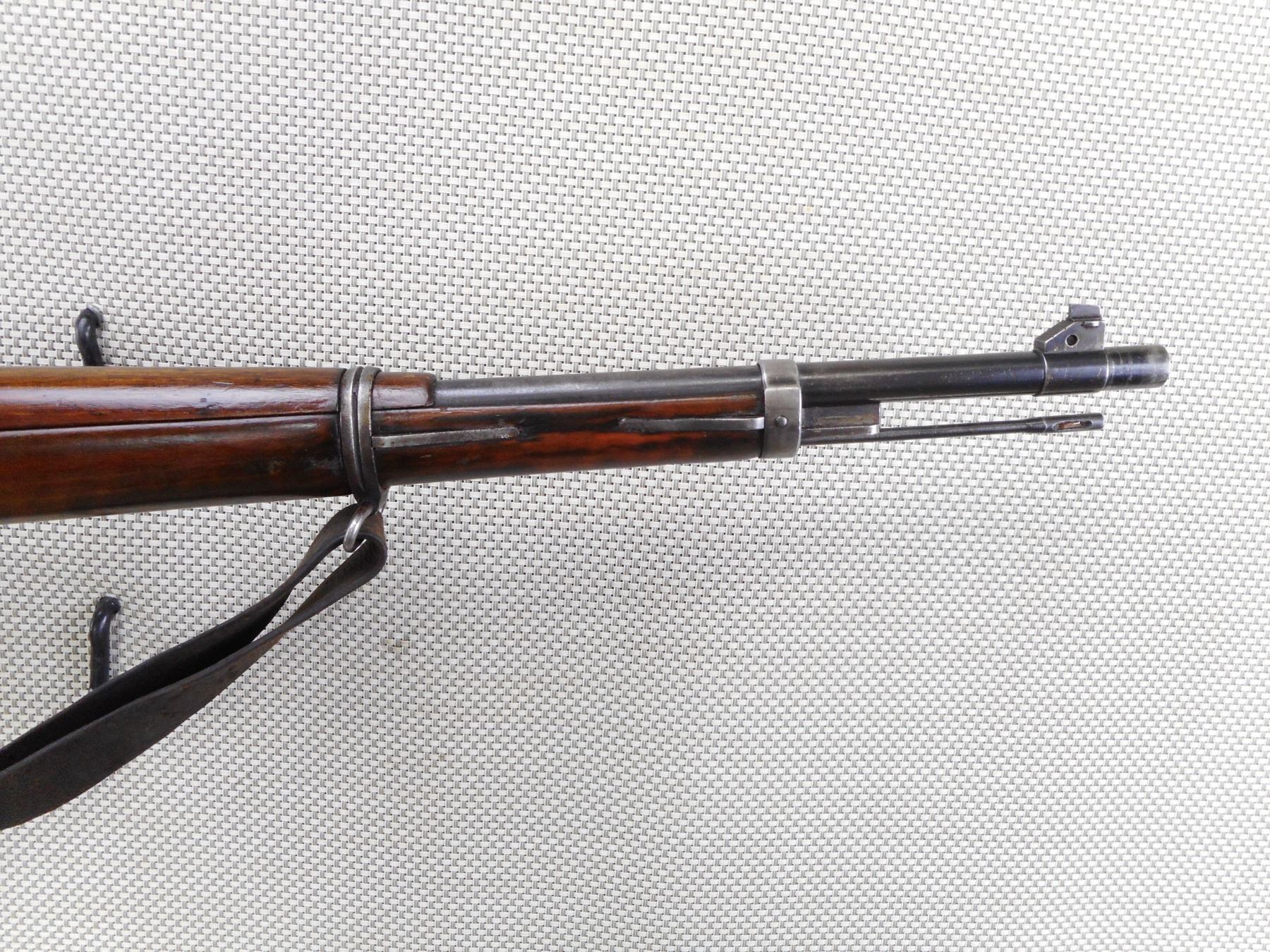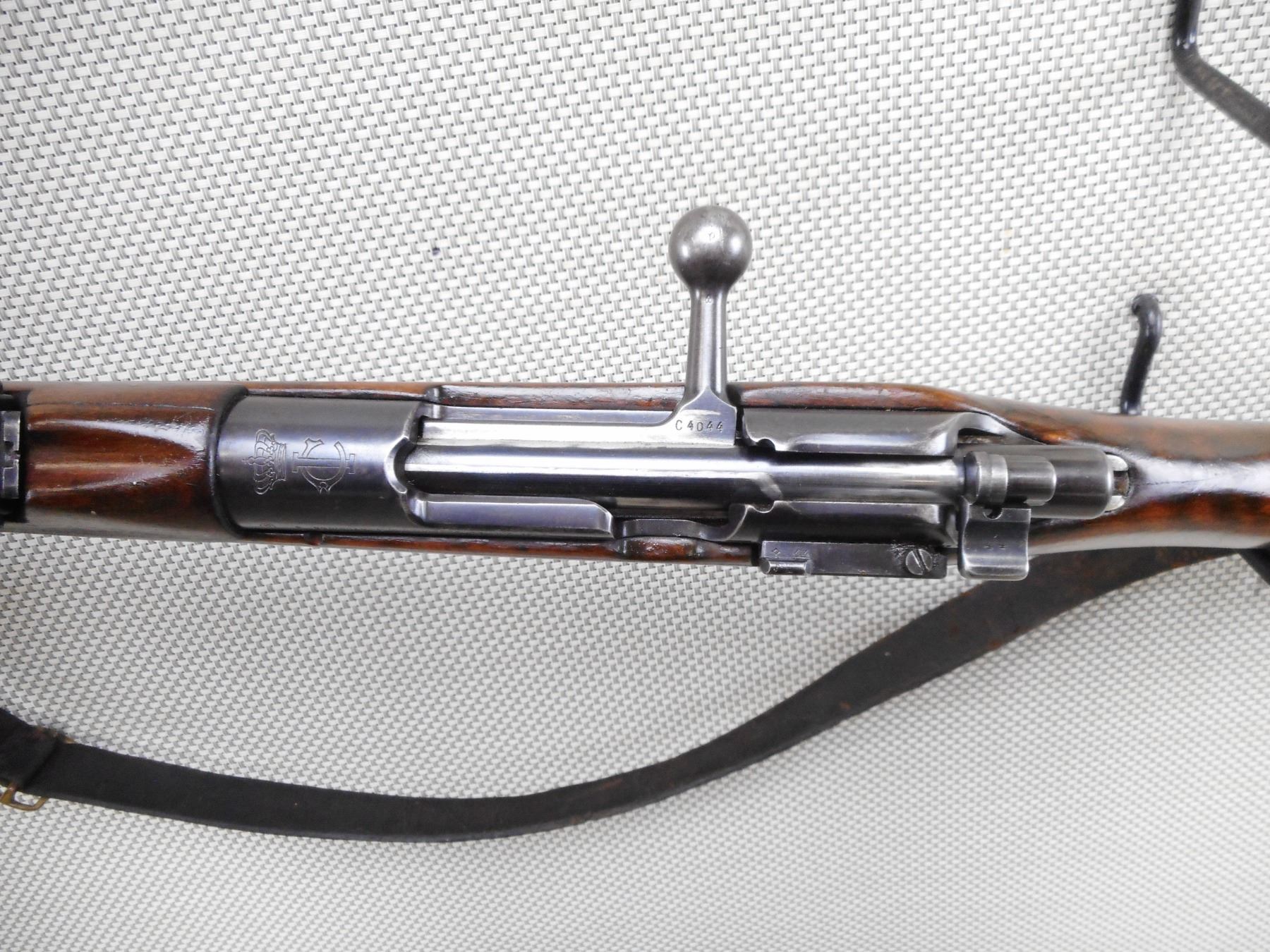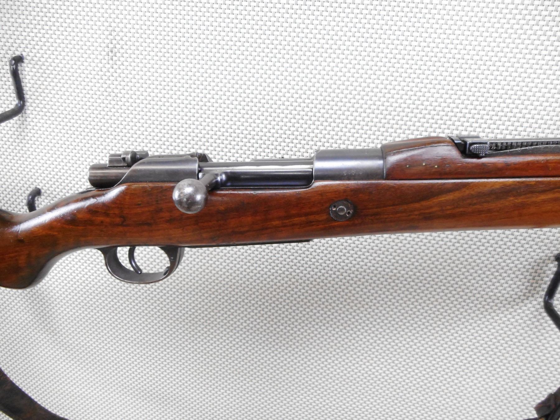 MAUSER , MODEL: 1904/39 PORTUGESE SHORT RIFLE , CALIBER: 8MM MAUSER , BORE IS VERY GOOD WITH SLIGHT WEAR. VISIBLE #'S MATCH. PORTUGESE CREST ON RECEIVER RING. BARLEY CORN FRONT SIGHT. ADJUSTABLE U NOTCH REAR SIGHT. FULL LENGTH MILITARY STOCK. CLEANING ROD. LEATHER SLING. STOCK HAS BEEN REFINISHED. SHOWS SOME HANDLING MARKS AND WEAR. ACTION: BOLT ACTION RIFLE , BARREL LENGTH: 24" , SERIAL # C4044 , CONDITION: 7/10 , CLASS: CANADIAN NON RESTRICTED CLASS
