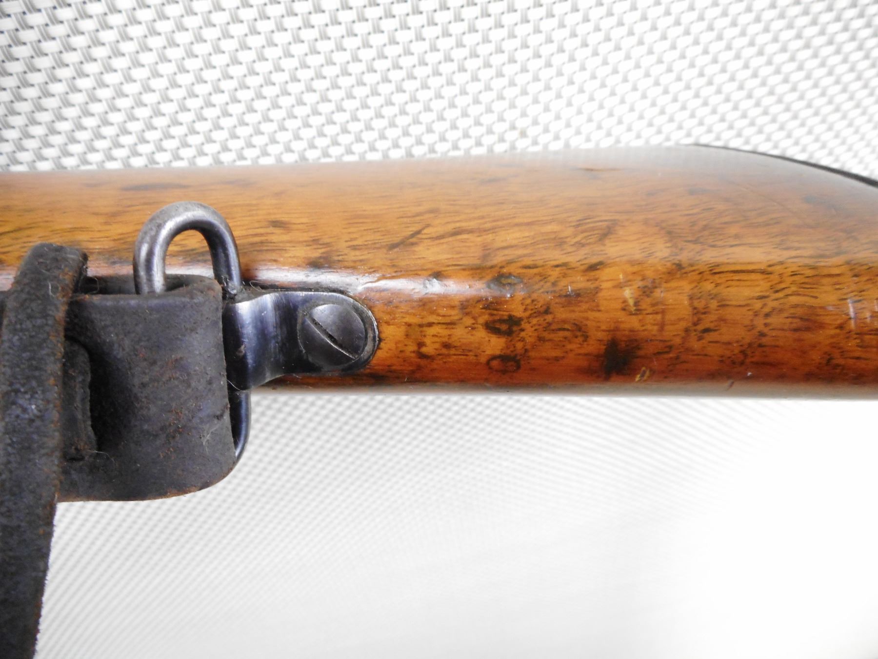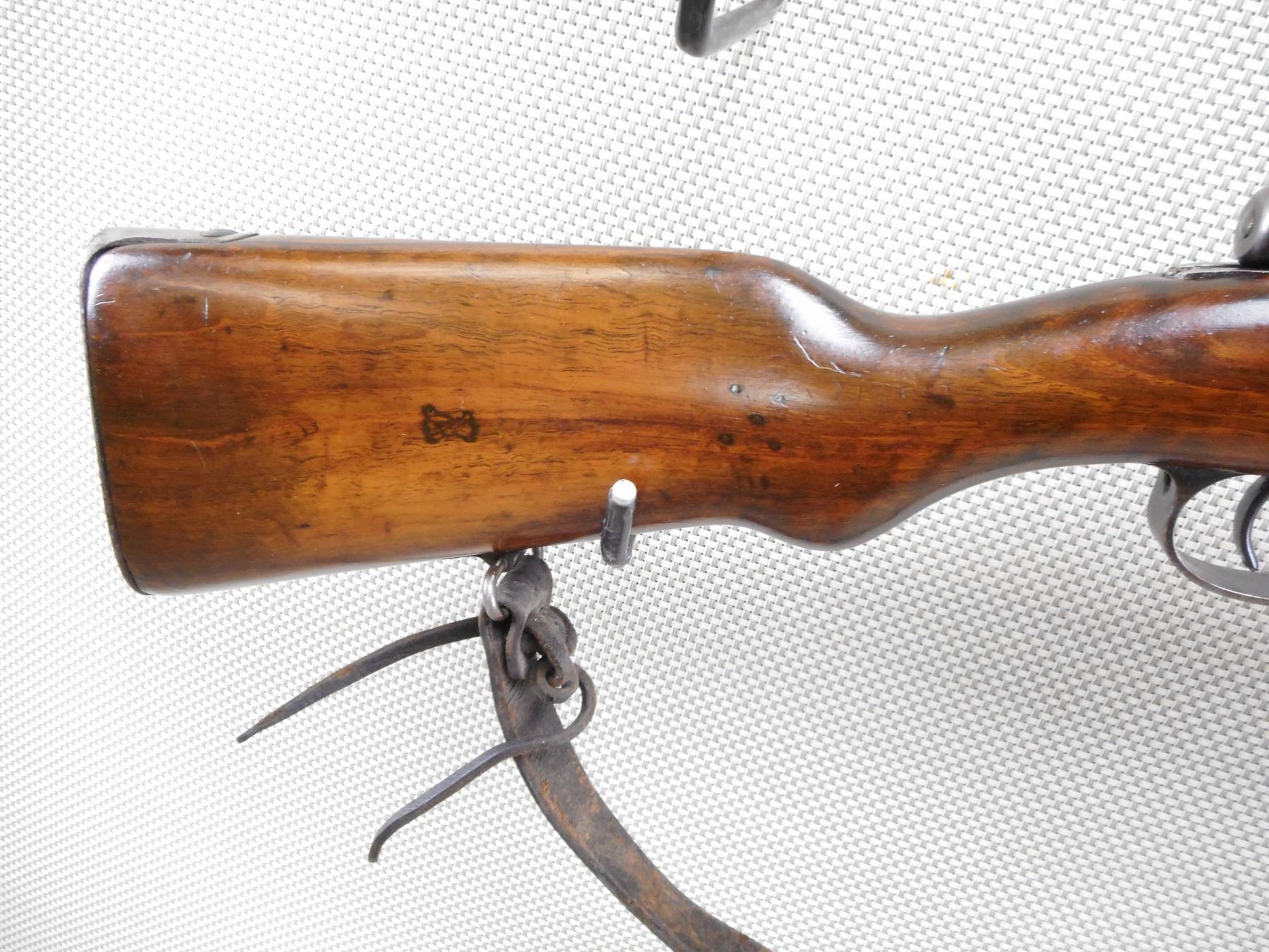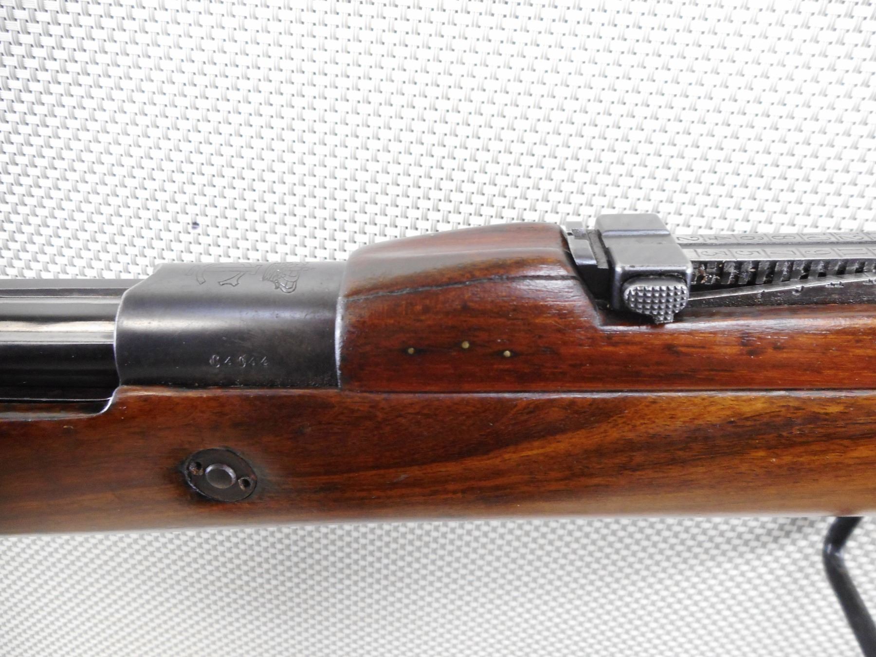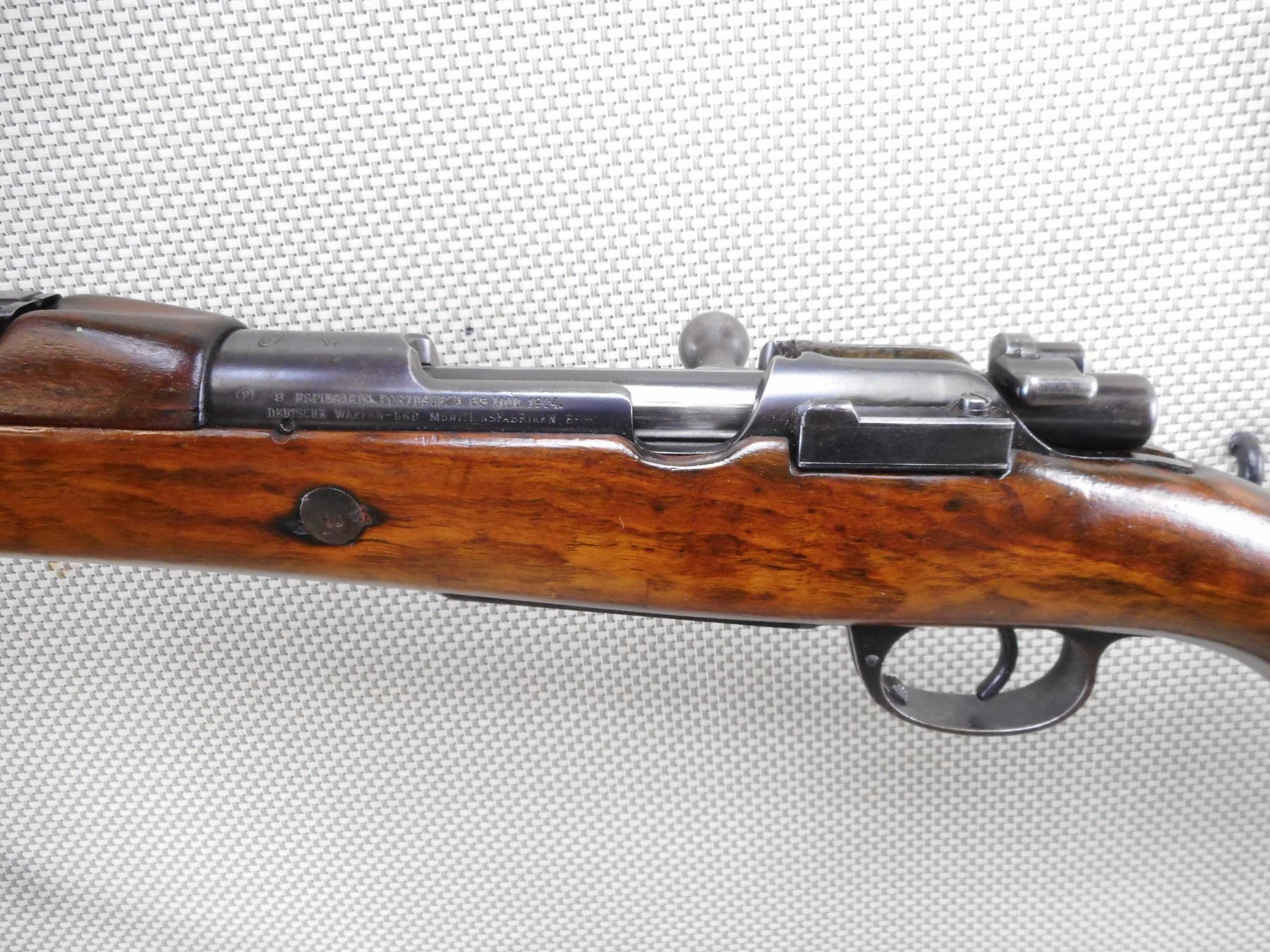 MAUSER , MODEL: 1904/39 PORTUGESE SHORT RIFLE , CALIBER: 8MM MAUSER , BORE IS VERY GOOD WITH SLIGHT WEAR. VISIBLE #'S MATCH. PORTUGESE CREST ON RECEIVER RING. BARLEY CORN FRONT SIGHT. ADJUSTABLE U NOTCH REAR SIGHT. FULL LENGTH MILITARY STOCK. CLEANING ROD. LEATHER SLING. STOCK HAS BEEN REFINISHED. SHOWS SOME HANDLING MARKS AND WEAR. ACTION: BOLT ACTION RIFLE , BARREL LENGTH: 24" , SERIAL # C4044 , CONDITION: 7/10 , CLASS: CANADIAN NON RESTRICTED CLASS