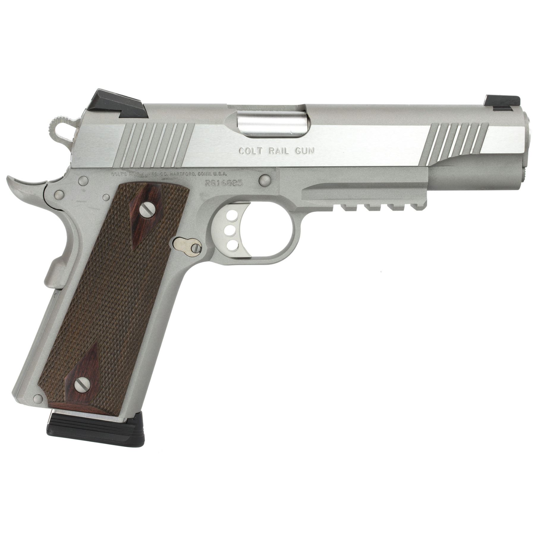 5" Barrel, Steel Frame, Stainless Finish, Double Diamond Rosewood Grips, Fixed NOVAK Sights, 8Rd, 1 Magazine, Series 80 1911, 8.5" Overall, RAIL, $1021 Dealer Cost, O1070RG