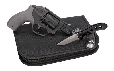 Smith & Wesson, Bodyguard38, Revolver, Double Action Only, Sub Compact Size, 38 Special +P, 1.9" Barrel, Aluminum Alloy Frame, Black Finish, Polymer Grips, 5Rd, Every Day Carry Kit Includes Crimson Trace Integrated Red Laser, Carry Case, Delta Force CS Flashlight, S& W Oasis Liner Lock Knife, Weighs 14.4oz, Internal Notch Rear Sight, Blade Front Sight