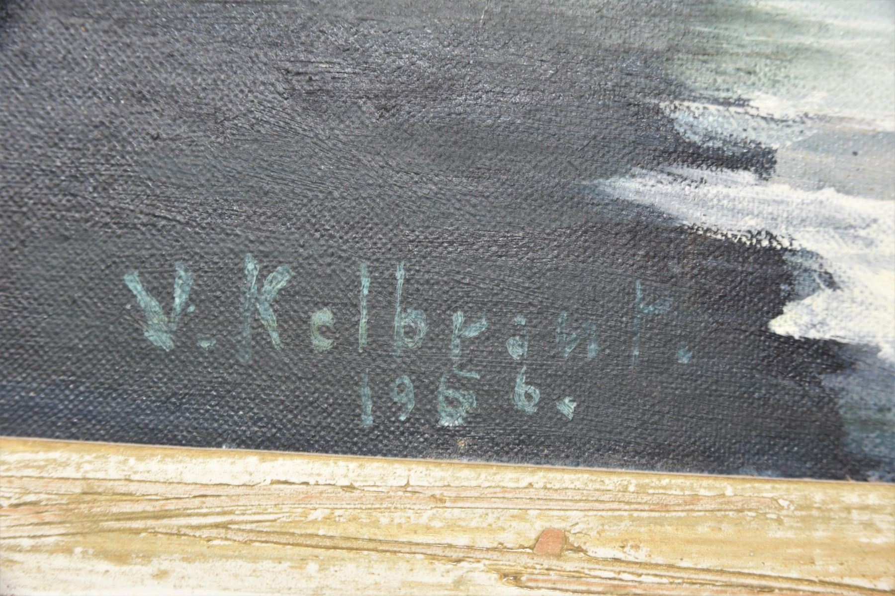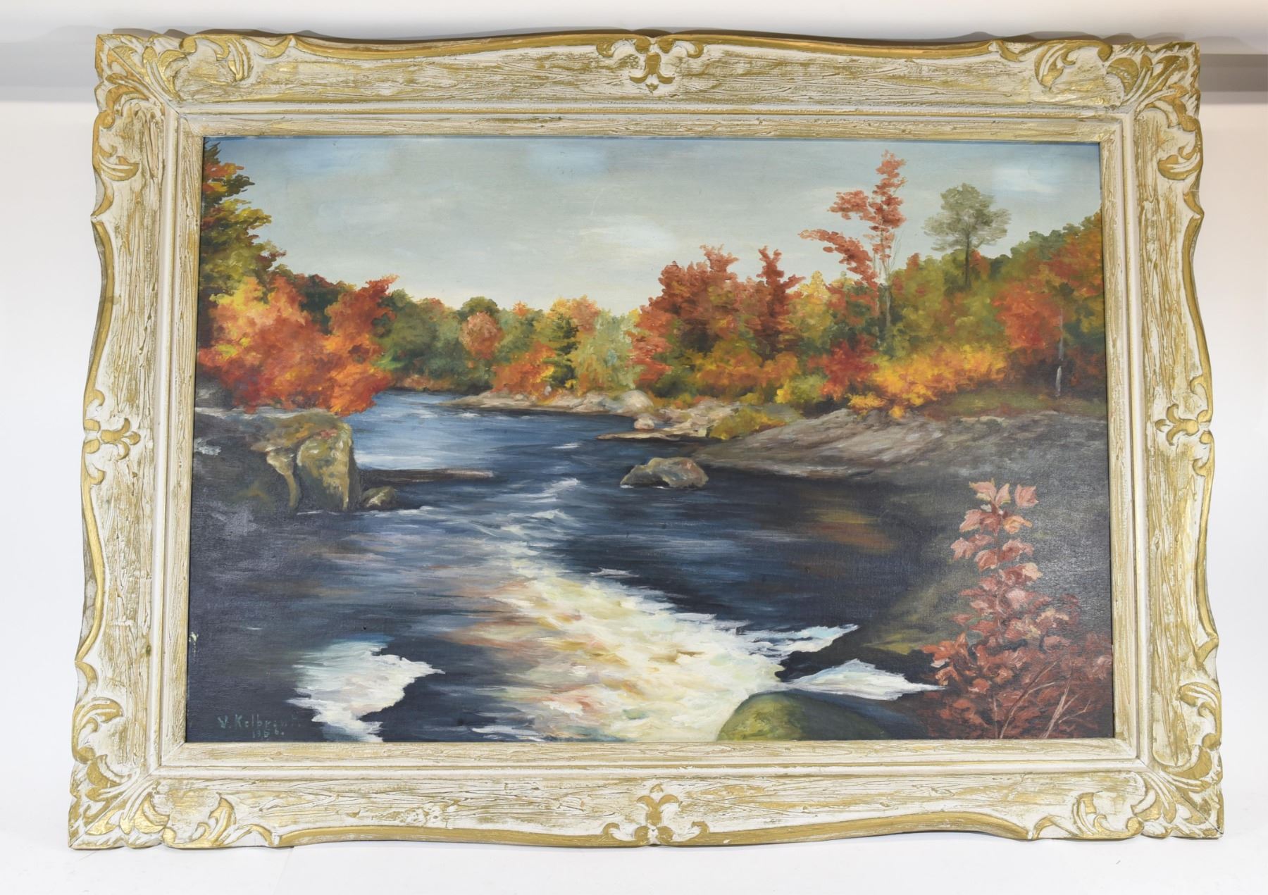 Fall river scene oil painting by V. Kelbrant, 1956. 31 x 43 inches.