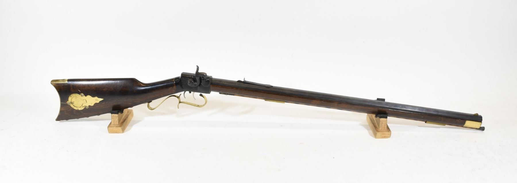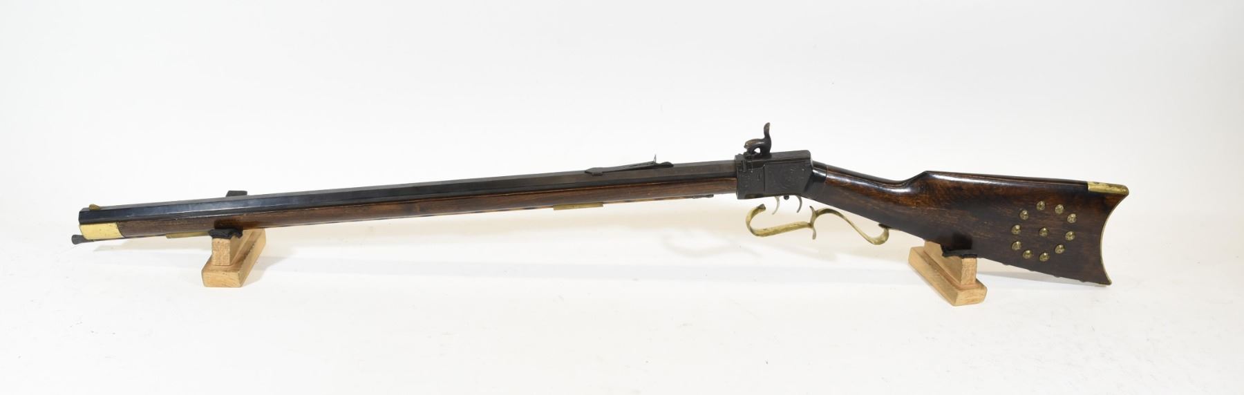 Non-restricted, single shot, 45 percussion, 26" octagonal barrel, SN 1798. Wood has a crack in butt, bluing faded and scratched, bore very good. Trigger guard broken, hammer does not latch back to fire position.