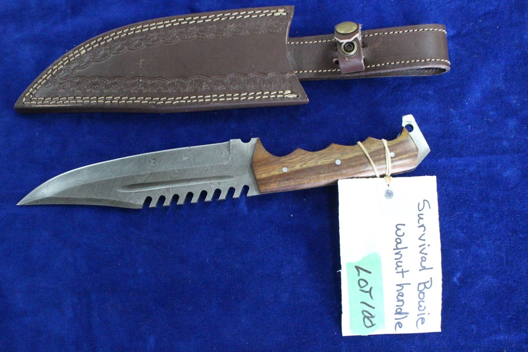 Lot 100 Damascus Survival Bowie, 7" Blade, Walnut Handle, Sheath