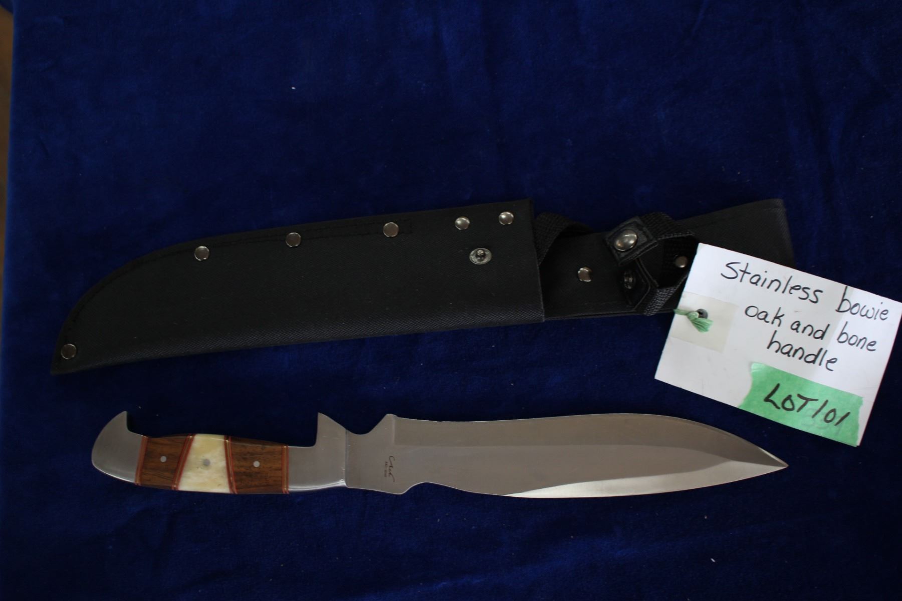 Lot 101 Stainless Bowie, Ash 440 Steel, 8" Blade, Oak & Bone Handle, Sheath