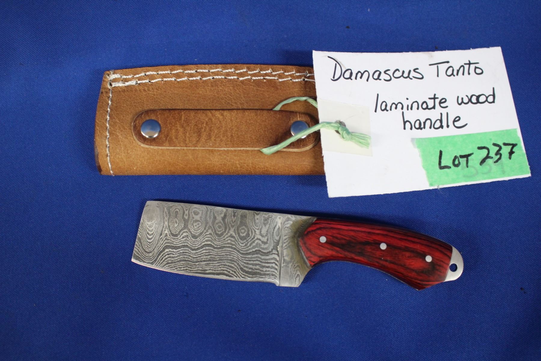 Lot 237 Damascus Tanto, 3" Blade, Laminate Wood Handle, Sheath
