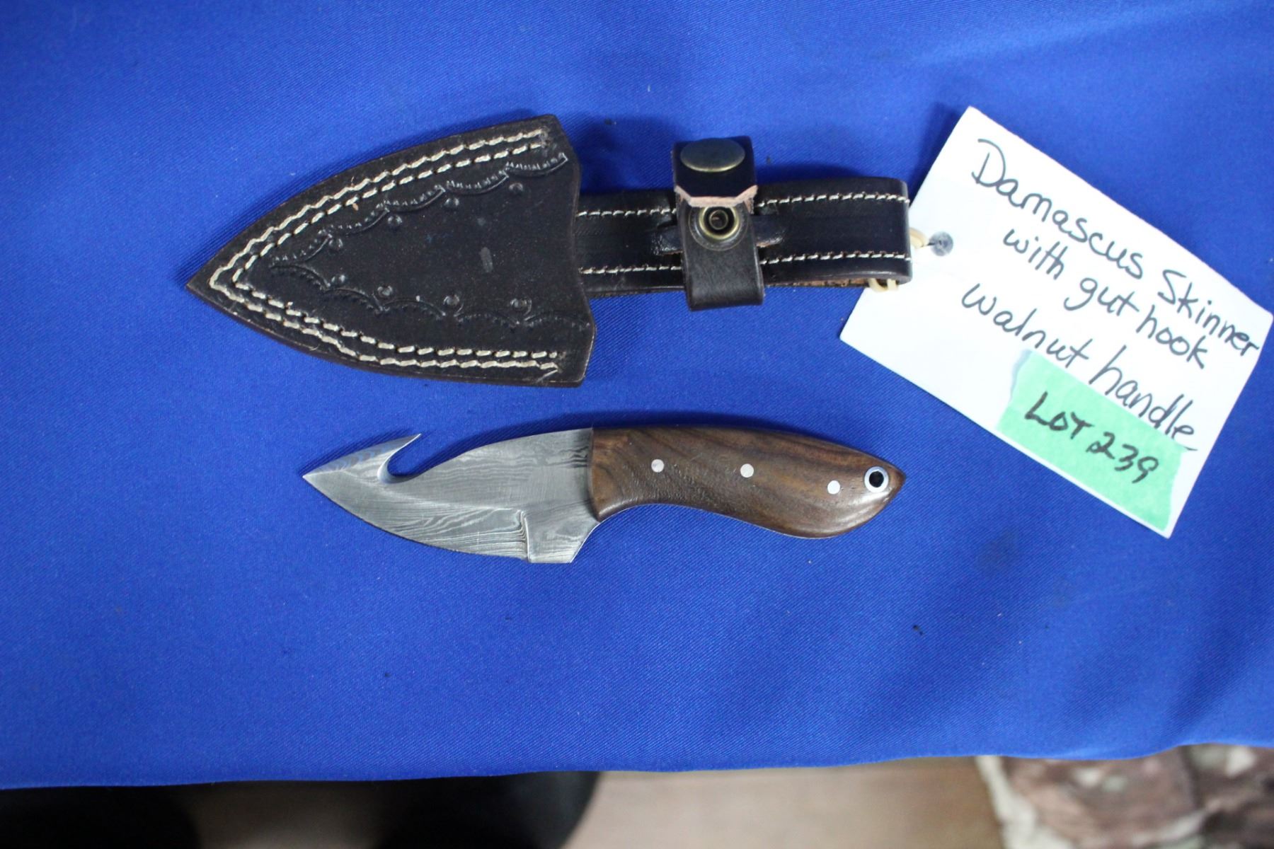 Lot 239 Damascus Skinner, 2 ½" Blade, with Gut Hook and Walnut Handle, Sheath