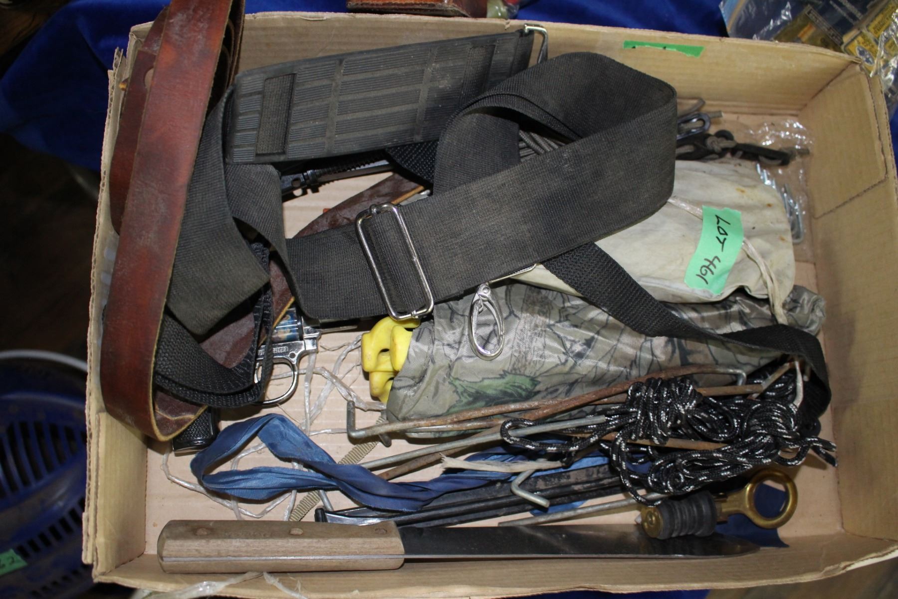 Lot 461 Flat with Tent Pegs, Tie Down Rope, 2 Slings, Toy Pistol & a Carving Knife